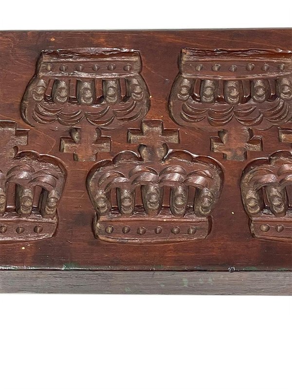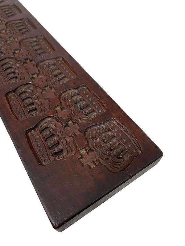 A Dutch 19th century wooden gingerbread mold A wooden mold for making cookies in the shape of Royal crowns, which was made by K.H. Wennink in Westendorp, baker by profession at the end of the 19th century. The board was used to make cookies in the shape of crowns for Princess Day or Queen's Day Princess Day (1885-1890) and Queen's Day (1891-2013), since the reign of Queen Juliana, has been a national holiday in the Kingdom of the Netherlands in honor of the head of state's birthday. In all parts of the kingdom, this is considered a day off for most employees and is celebrated with various festivities The measurement is 55 cm long, 12 cm wide and the depth is 2,5 cm The weight is 804 grams.