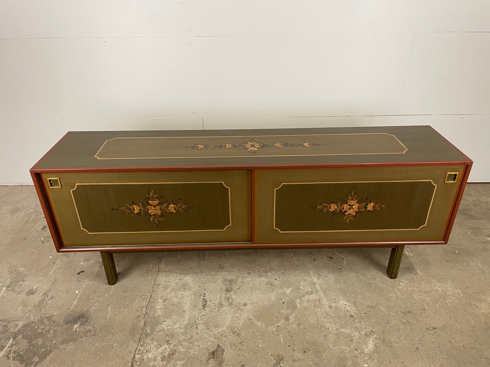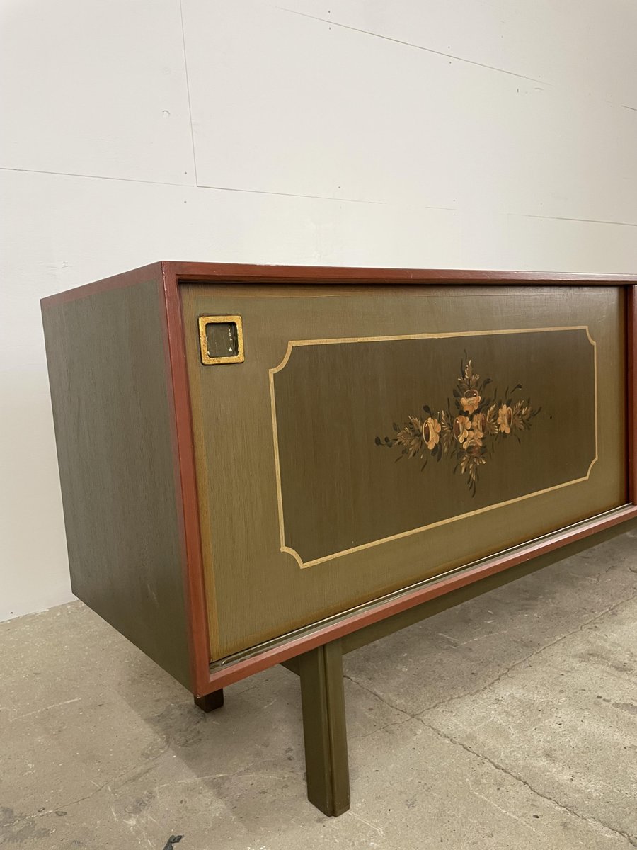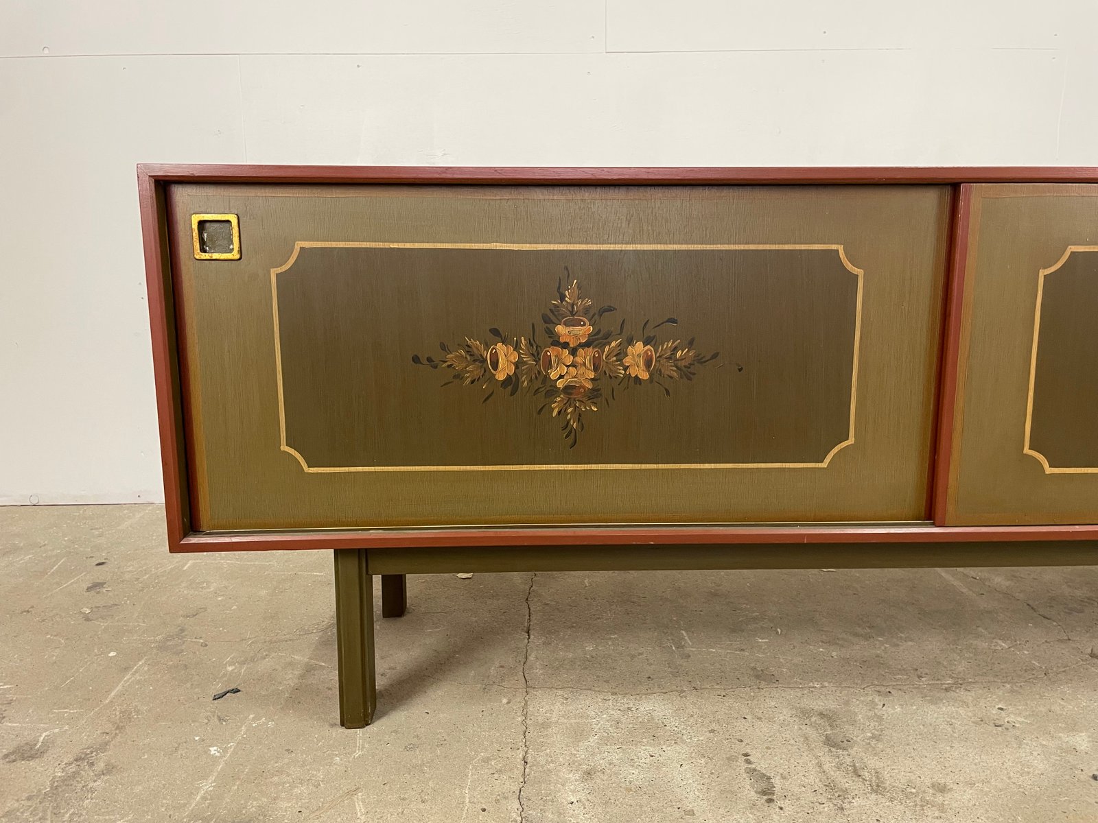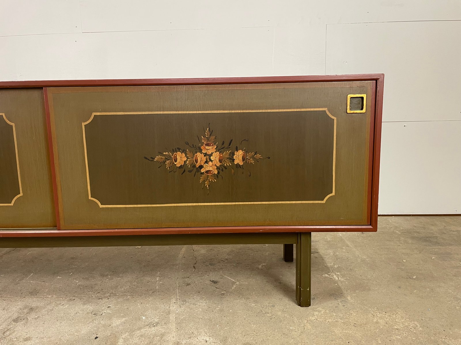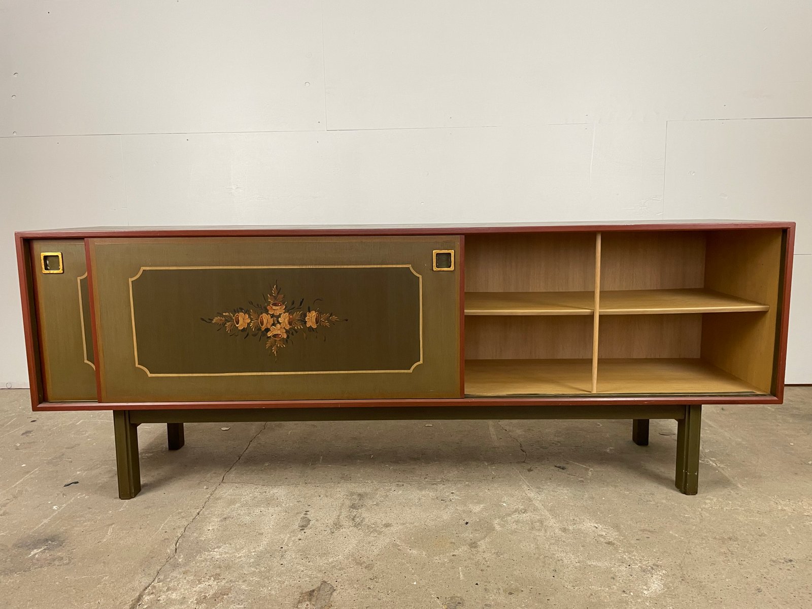 The sideboard is constructed in oak and features two sliding doors with decorative hand-painted panels, framed by fine detailing that adds a distinctive and artistic character. Behind the doors, the interior offers a practical combination of drawers and shelving, providing versatile storage options.
