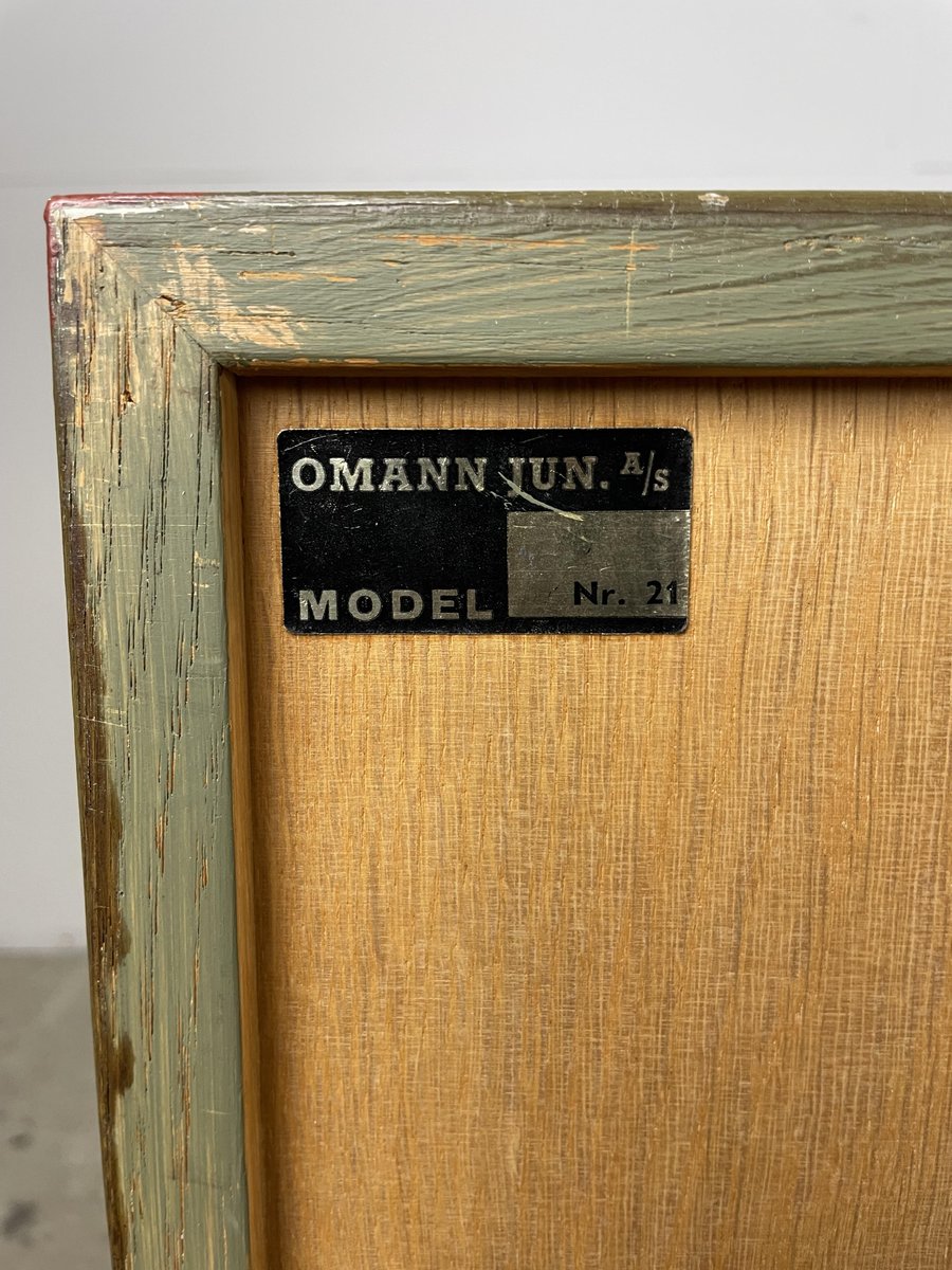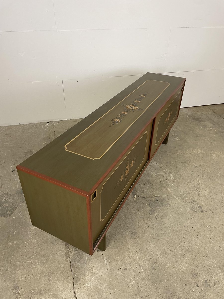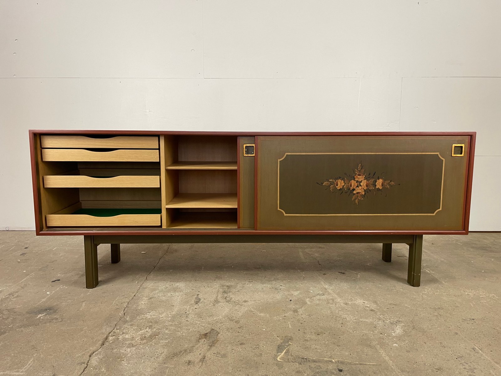 Bitte beachten Sie, dass das Sideboard zu einem späteren Zeitpunkt lackiert wurde. Obwohl es sich nicht um die Originaloberfläche handelt, wurde die Neulackierung professionell von einem Designer durchgeführt, was zu einem gut ausgeführten und optisch harmonischen Erscheinungsbild führte, das die ursprüngliche Form ergänzt. Die darunterliegende Eichenholzkonstruktion ist intakt geblieben und in der Struktur und im Innenraum deutlich zu erkennen. Ein optisch auffälliges und funktionales Stück, das dänisches modernes Design mit einem eher dekorativen, maßgeschneiderten Ausdruck verbindet – ideal für Sammler, die etwas Klassisches und Einzigartiges suchen.