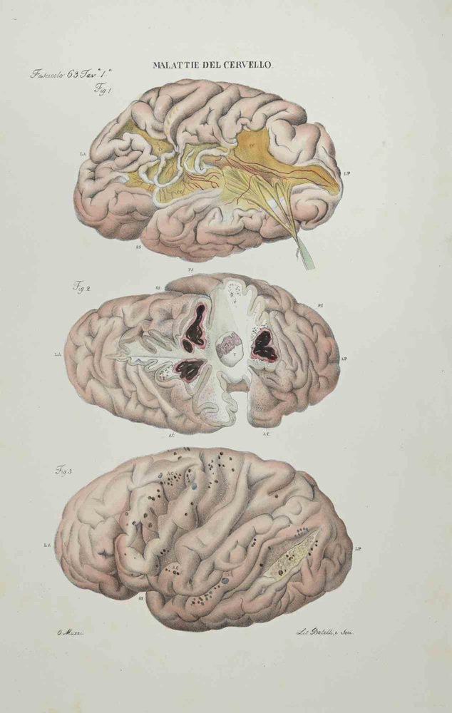 Diseases of the Brain a lithograph hand colored by Ottavio Muzzi for the edition of Antoine Chazal, Human Anatomy, Printers Batelli and Ridolfi, 1843. The work belongs to the Atlante generale della anatomia patologica del corpo umano by Jean CRUVEILHIER, Florence: Vincenzo Batelli e compagni, 1843. First italian edition of these illustration, with contemporary colouring. Garrison-Morton: "The fine illustrations of gross pathology make this, one the greatest works of its kind". Good condition on a cream colored paper. Hand signed by the artist on the lower left corner.