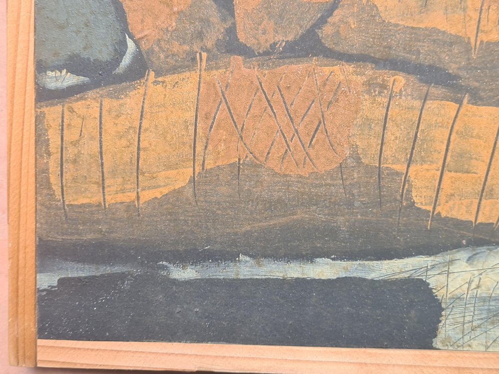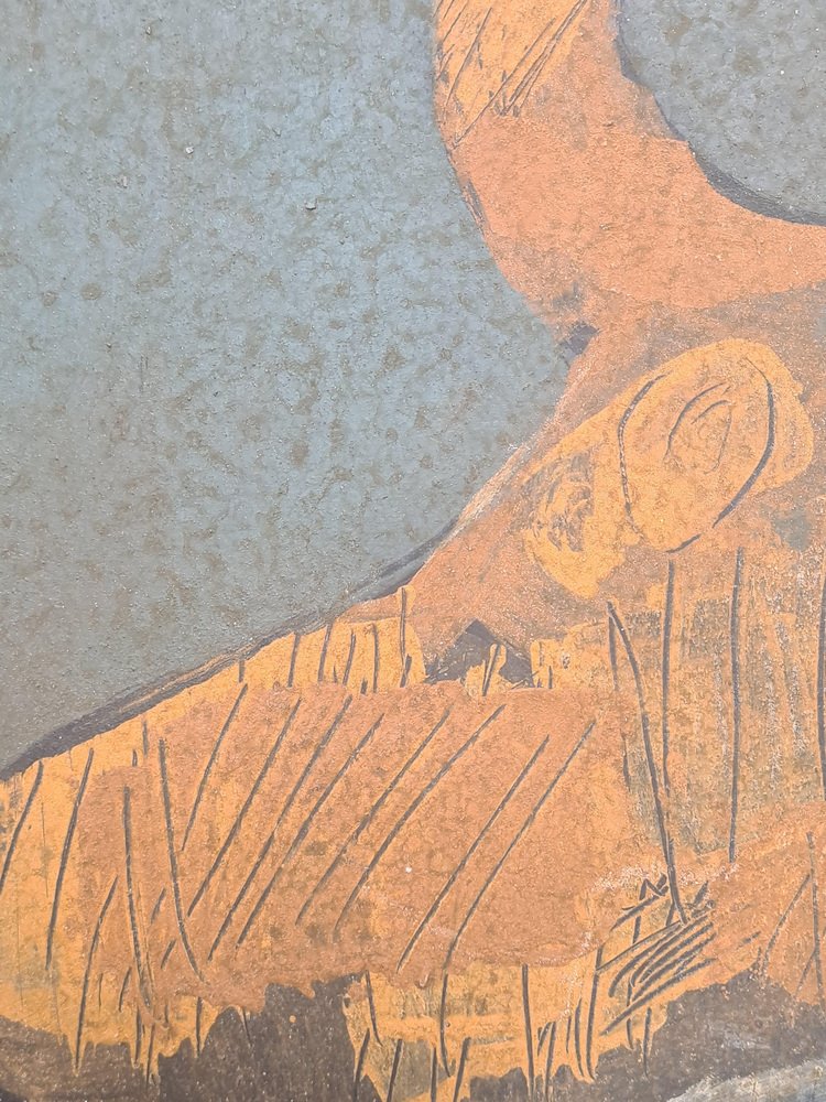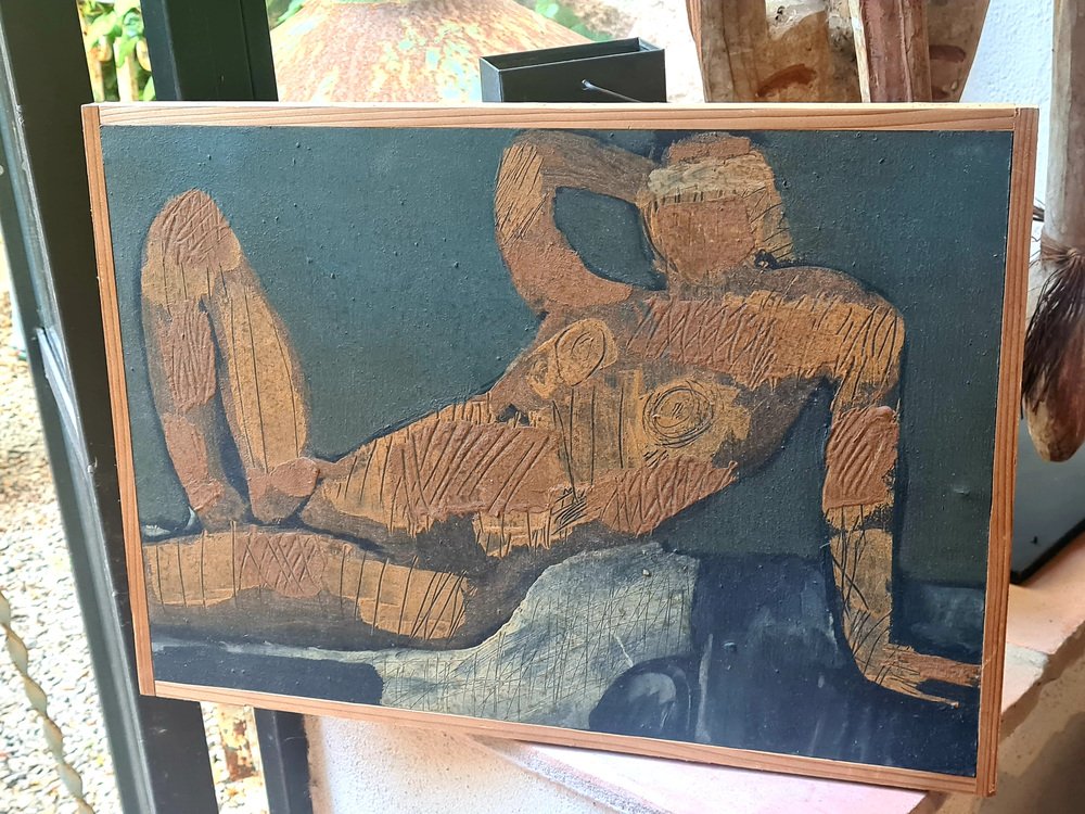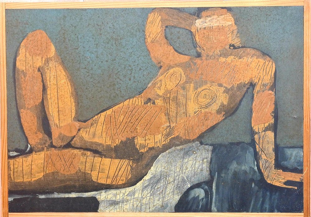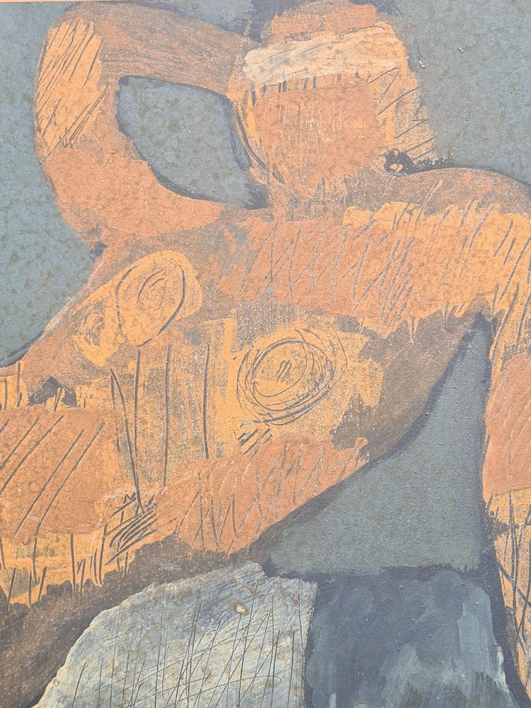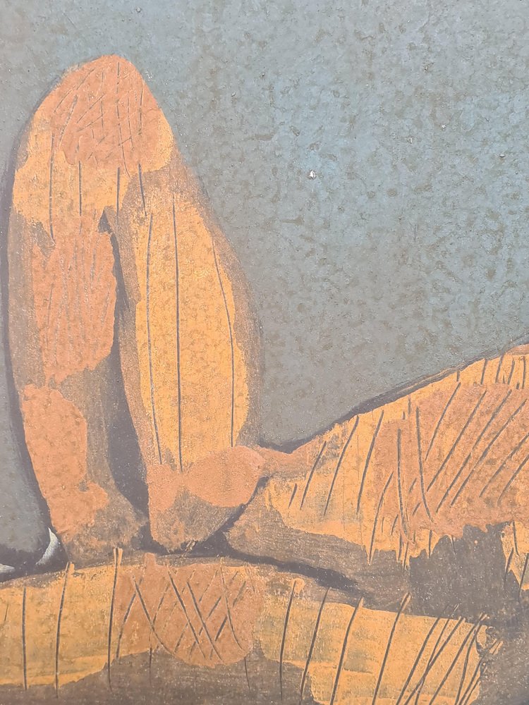 This artwork features a reclining nude figure, rendered with a distinctive blend of geometric abstraction and organic form. The use of earthy tones—deep ochres and muted blues—imbues the piece with a grounded yet tranquil atmosphere. The figure's pose is relaxed, with one arm bent behind the head, capturing a sense of ease and introspection. The artist employs a textured technique, overlaying fine lines and patterns across the body, enhancing the tactile quality of the skin and creating visual depth. In contrast, the background offers a subdued, flat blue that complements the warm hues of the figure. This juxtaposition highlights the form, inviting the viewer to contemplate the intersection of form and space. The work's minimalist framing accentuates its modern aesthetic, making it a compelling study in human form and abstraction.