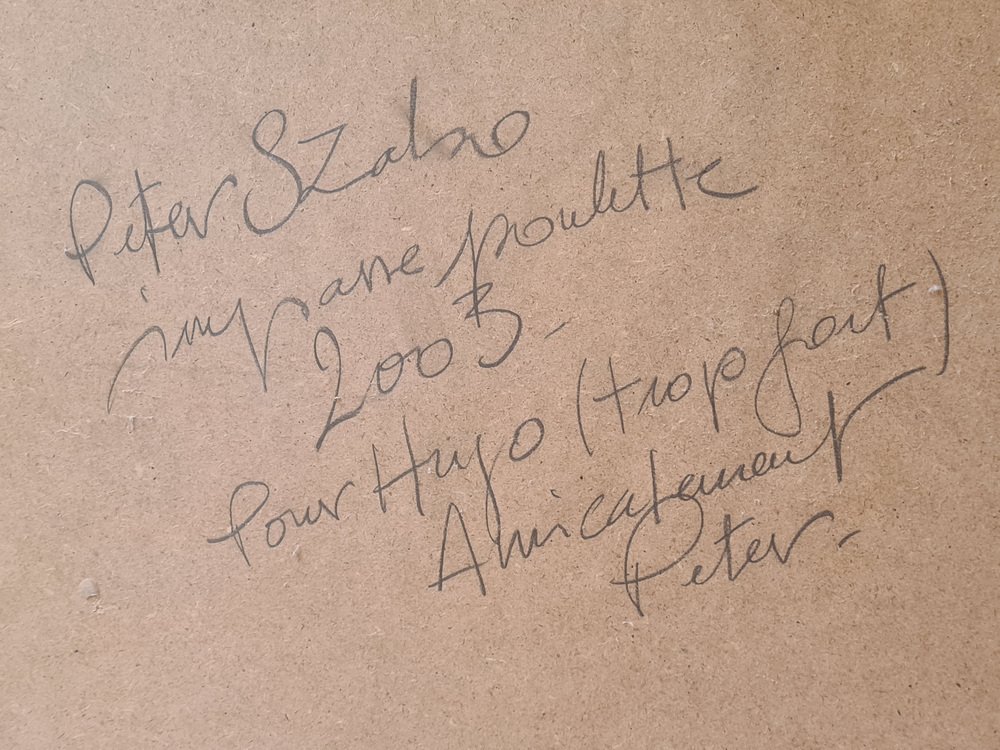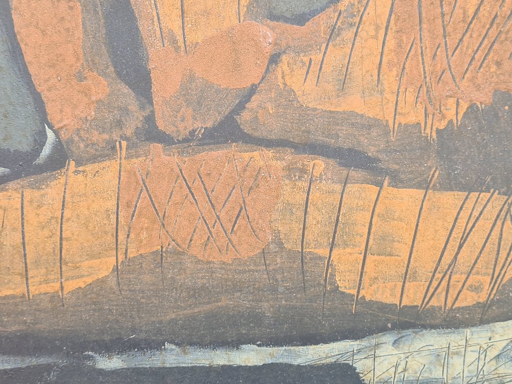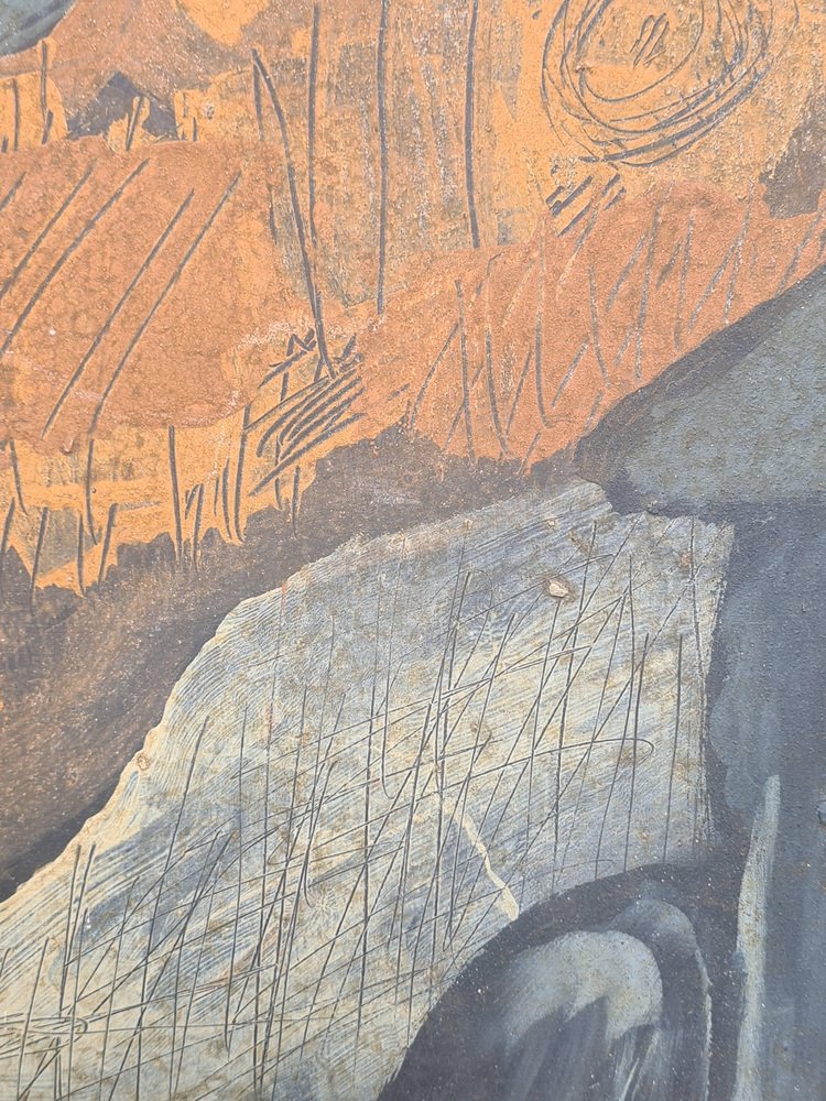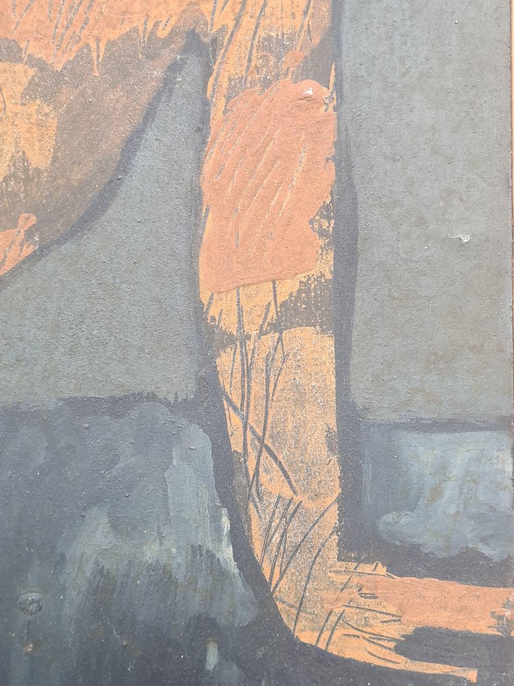 Nude female portrait in paint and sgraffito technique on board by Peter Szabo. The work is signed to the back and with a dedication. presented with a plain baton wood surround.