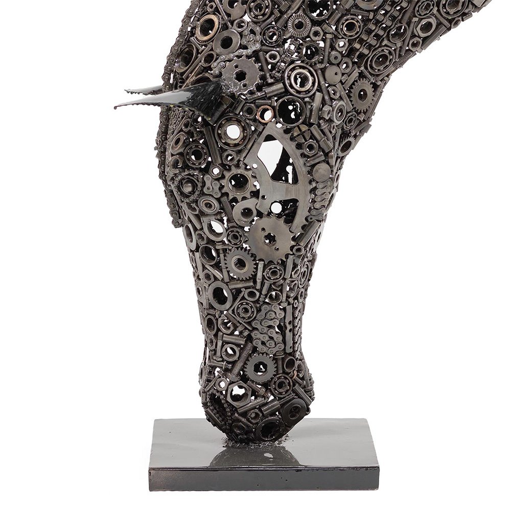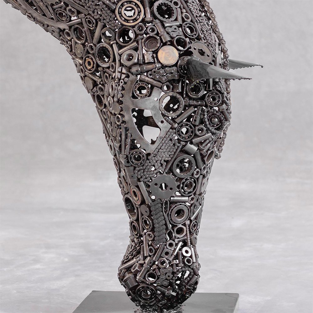 This one-of-a-kind Metal Stallion sculpture captures the noble strength and refined elegance of a horse through intricate handcrafted metalwork. Composed of carefully selected recycled iron elements – including gears, bolts, washers, and mechanical fragments – the piece transforms industrial materials into a powerful contemporary art statement.