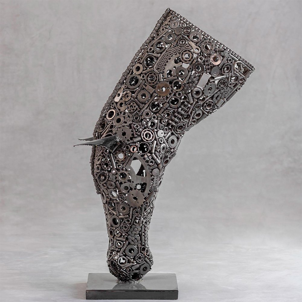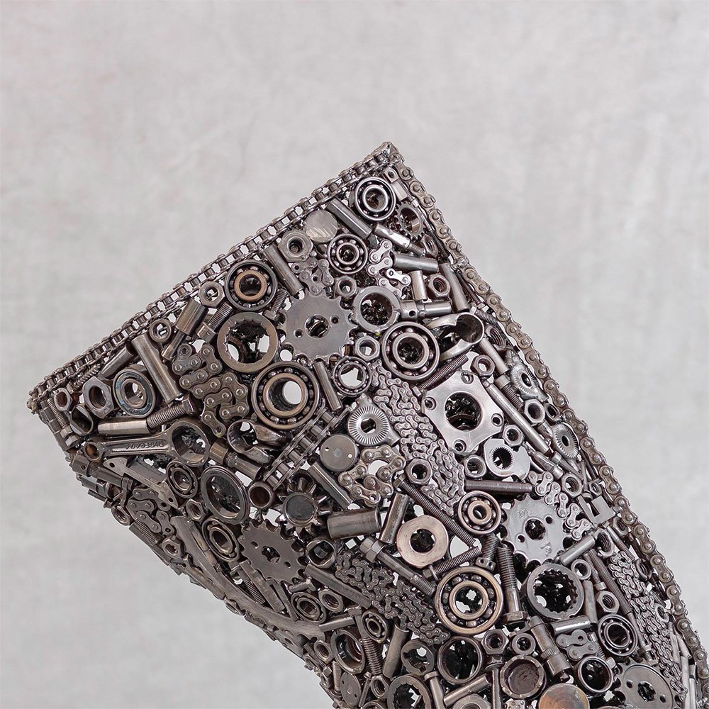 Each component is meticulously assembled to create texture, depth, and sculptural movement. The interlocking metal details evoke both mechanical precision and organic vitality, resulting in a striking balance between industrial character and artistic sophistication.