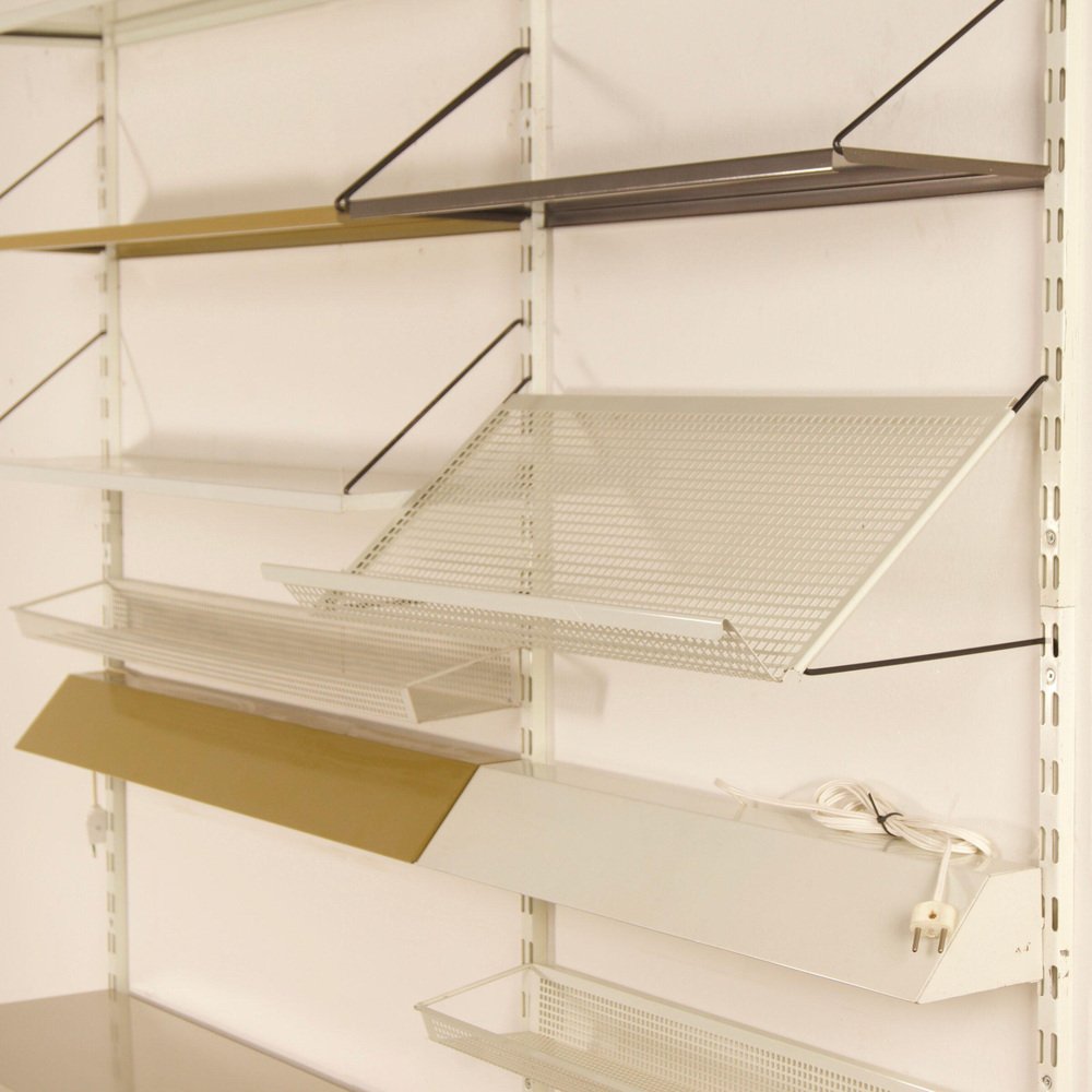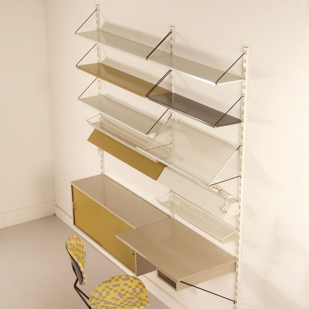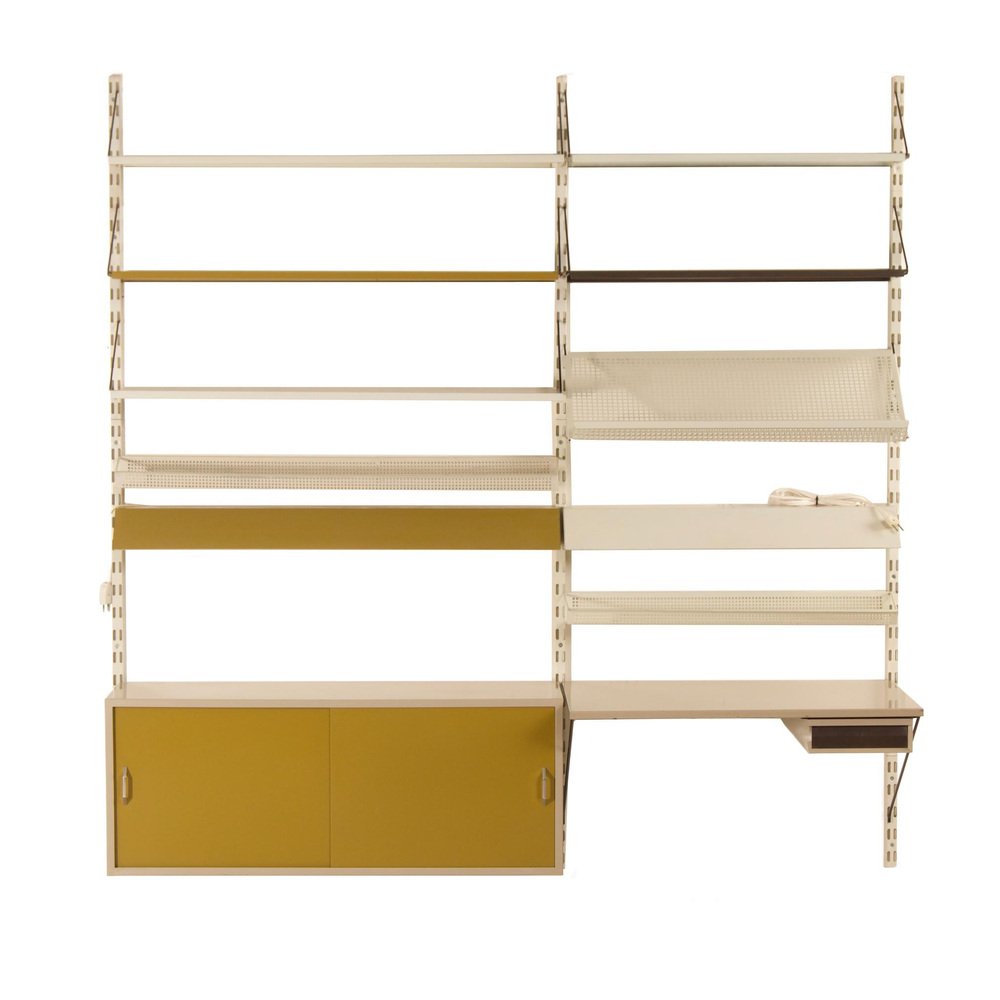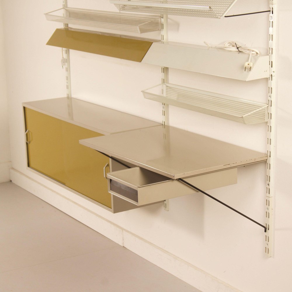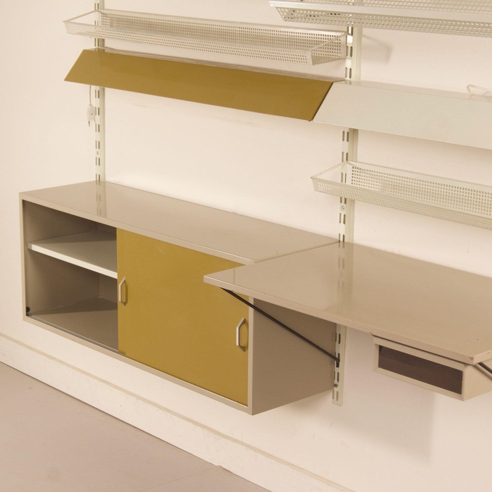 Pilastro-Wandsystem mit Schreibtisch (mit Schublade), entworfen von Tjerk Reijenga für C.V. Reijenga's Apparatenbouw, Amsterdam im Jahr 1957. Diese in ihrer Schlichtheit wunderschöne Schrankwand wurde als ein Möbelstück mit 1001 Möglichkeiten beworben und konnte nach Belieben geteilt oder erweitert werden. Diese Schrankwand stammt aus den frühen 1960er Jahren und besteht aus einem Schrank mit zwei Schiebetüren (H x B x T = 38 x 97 x 30 cm), einem Schreibtisch mit Schublade (B x T = 73 x 46 cm), einem perforierten Korb (H x B x T = 7 x 96 x 15 cm), einem Lichtkasten (mit zwei E27-Fassungen und einem Druckschalter) mit den Maßen: H x B x T = 8.5 x 73 x 12 cm, ein breiterer Lichtkasten (mit zwei E27-Fassungen und einem Druckschalter) mit den Maßen: H x B x T = 8,5 x 97 x 12 cm, fünf Ablagen mit den Maßen 97,5 x 20 cm, eine Leseablage mit den Maßen 21 x 73 x 29 cm sowie verschiedene Befestigungs- und Wandhalterungen. Material: pulverbeschichtetes Eisen in Creme, Grün, Schwarz, Weiß und Braun. Maße der Schrankwand: H x B x T = 176 x 174 x 46 cm. Quelle: GW, 1957, XXII und GW 1965, 11.