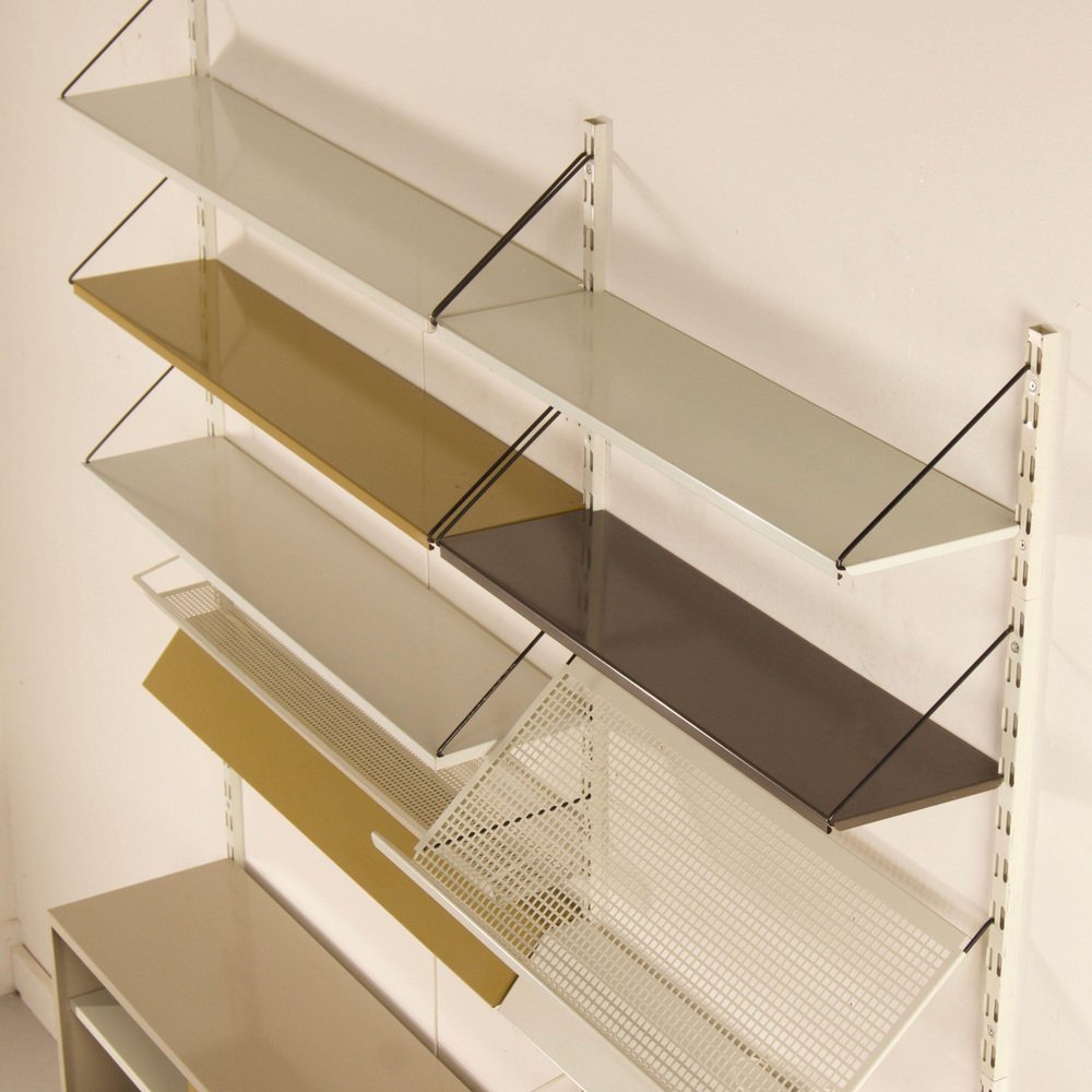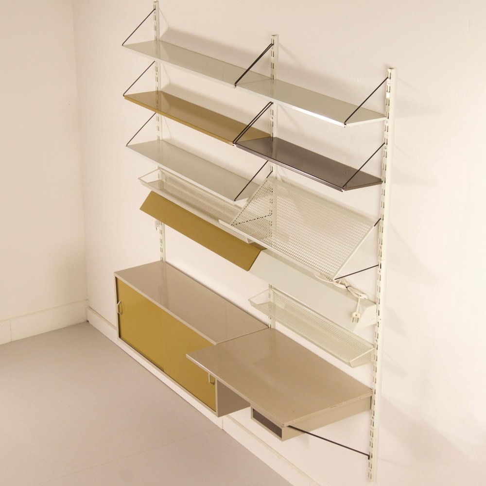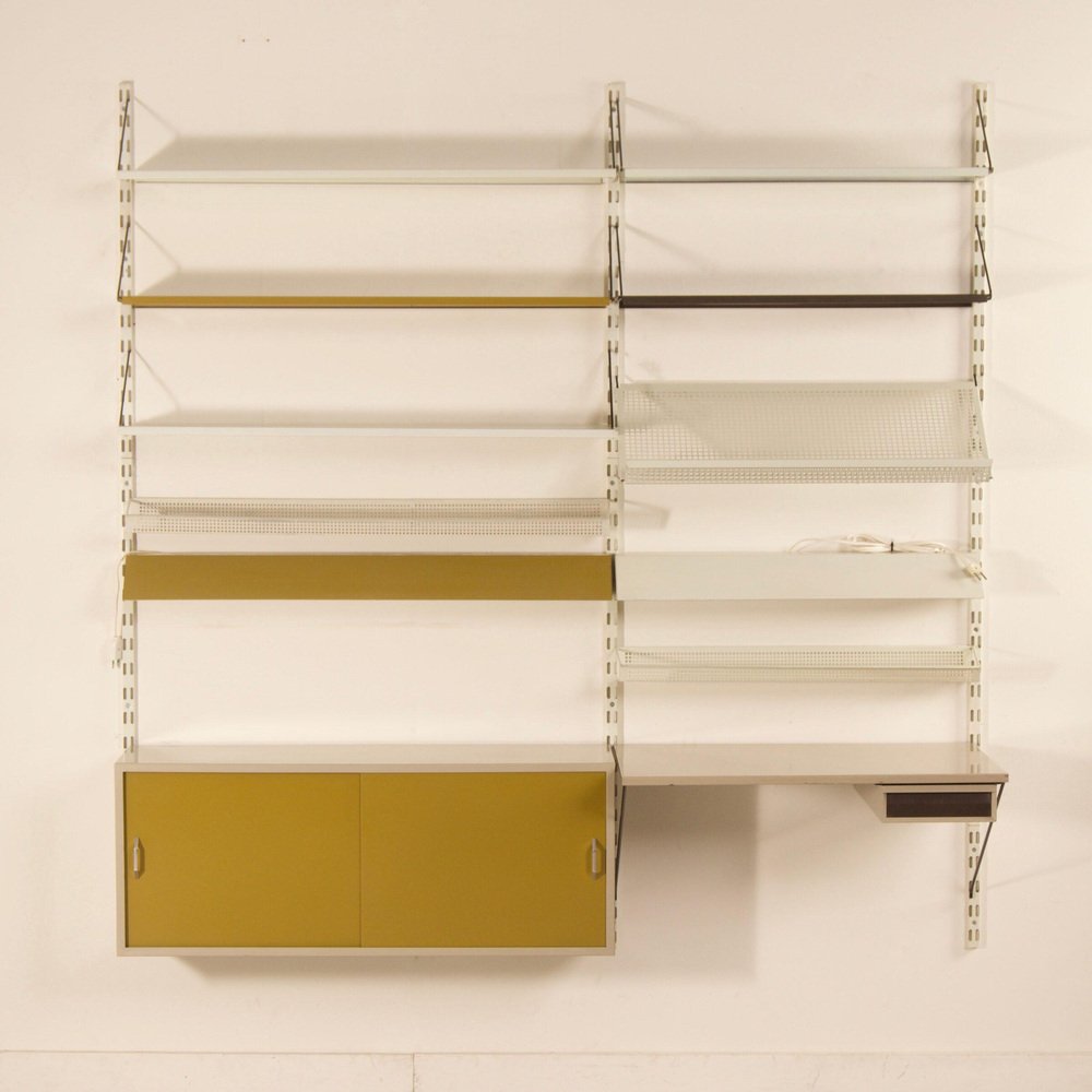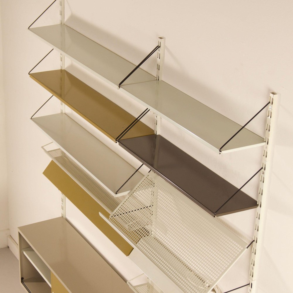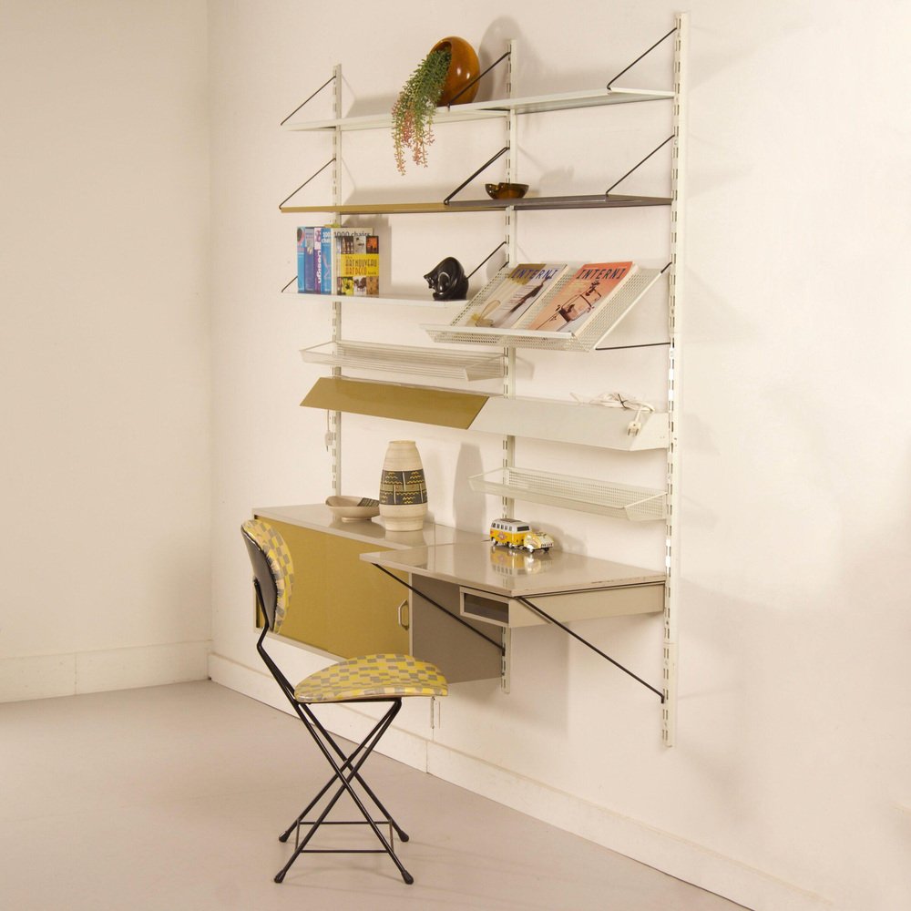 Pilastro-Wandsystem mit Schreibtisch (mit Schublade), entworfen von Tjerk Reijenga für C.V. Reijenga's Apparatenbouw, Amsterdam im Jahr 1957. Diese in ihrer Schlichtheit wunderschöne Schrankwand wurde als ein Möbelstück mit 1001 Möglichkeiten beworben und konnte nach Belieben geteilt oder erweitert werden. Diese Schrankwand stammt aus den frühen 1960er Jahren und besteht aus einem Schrank mit zwei Schiebetüren (H x B x T = 38 x 97 x 30 cm), einem Schreibtisch mit Schublade (B x T = 73 x 46 cm), einem perforierten Korb (H x B x T = 7 x 96 x 15 cm), einem Lichtkasten (mit zwei E27-Fassungen und einem Druckschalter) mit den Maßen: H x B x T = 8.5 x 73 x 12 cm, ein breiterer Lichtkasten (mit zwei E27-Fassungen und einem Druckschalter) mit den Maßen: H x B x T = 8,5 x 97 x 12 cm, fünf Ablagen mit den Maßen 97,5 x 20 cm, eine Leseablage mit den Maßen 21 x 73 x 29 cm sowie verschiedene Befestigungs- und Wandhalterungen. Material: pulverbeschichtetes Eisen in Creme, Grün, Schwarz, Weiß und Braun. Maße der Schrankwand: H x B x T = 176 x 174 x 46 cm. Quelle: GW, 1957, XXII und GW 1965, 11.