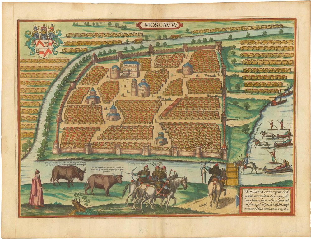 Ein schönes Beispiel für diese "Kartenansicht" von Moskau, veröffentlicht im zweiten Band der "Civitates Orbis Terrarum", dem ersten systematischen Atlas mit Stadtplänen. Die wichtigsten Gebäude sind im Profil dargestellt, ohne Rücksicht auf die Perspektive. Auf dem zugefrorenen Fluss Mosca sind Schlittschuhläufer und Pferdeschlitten zu sehen, und im Vordergrund sind Soldaten zu Pferd zu sehen. Dies ist der erste der beiden von Braun und Hogenberg herausgegebenen Pläne von Moskau. Ein zweiter erschien im letzten Band, der 1618 veröffentlicht wurde und durch Ladislaus von Polen, der 1611 in der Stadt wütete, notwendig wurde.