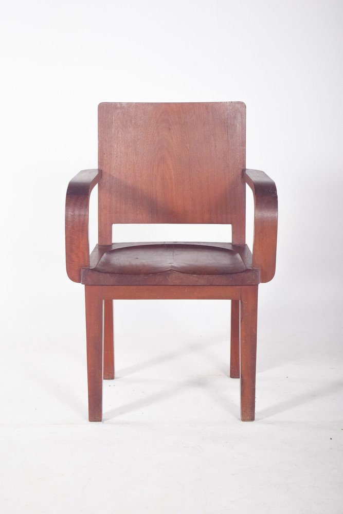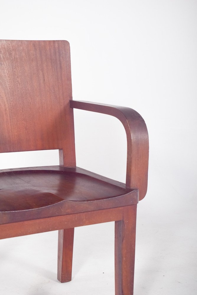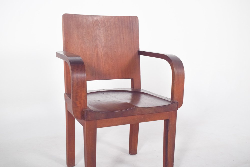 Sessel aus Mahagoniholz mit robustem Design und geraden Linien, typisch für institutionelle Umgebungen oder Büros des 20. Jahrhunderts. Die Rückenlehne und die Sitzfläche sind aus geformtem Holz, mit abgerundeten Ecken und glatter Oberfläche. Die Armlehnen folgen der seitlichen Struktur und sind gebogen, um sich mit dem Sitz zu verbinden, so dass eine durchgehende Form entsteht. Die Beine sind gerade und dick, verbunden durch untere Querstreben, die für Stabilität sorgen. Das Holz hat eine matte Oberfläche und Gebrauchsspuren wie kleine Kratzer und Flecken, die auf die Zeit des Gebrauchs hinweisen. Der Sitz hat eine leichte ergonomische Vertiefung, die direkt in das Holz geschnitzt ist.