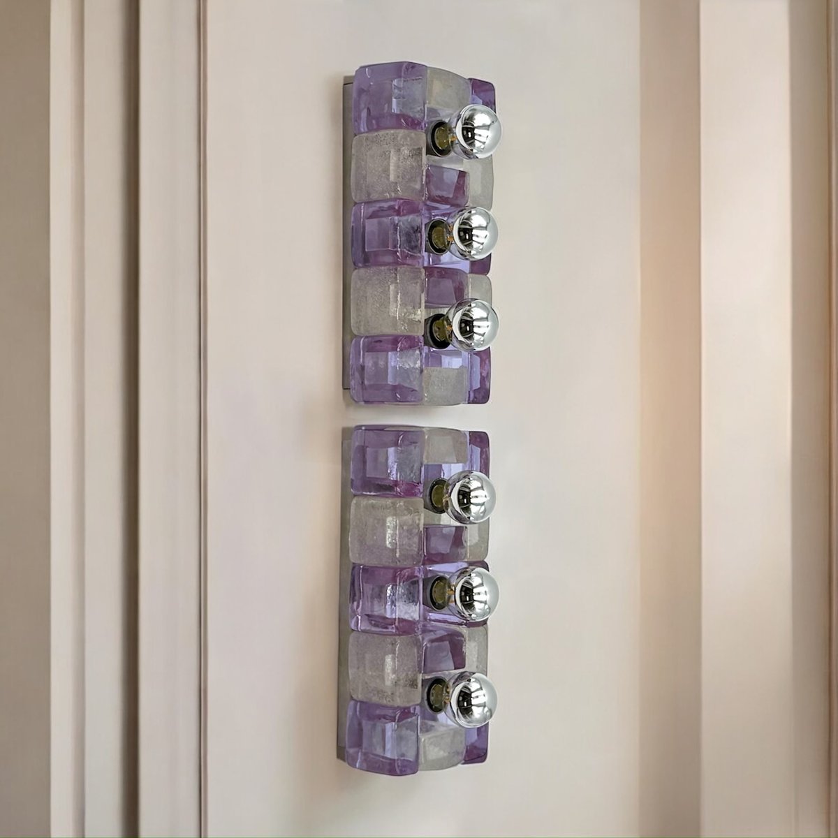 This rare pair of Poliarte wall lamps was designed by Albano Poli and handcrafted in Verona, Italy in the 1970s. Each lamp features a striking combination of 14 pulegoso glass blocks in violet and frosted white, mounted on a rectangular stainless steel backplate. The signature pulegoso technique gives the glass a textured, semi-opaque appearance filled with bubbles—an effect that diffuses the light beautifully. These sculptural sconces are fitted with three E14 sockets and work beautifully with mirrored or silver bowl bulbs.