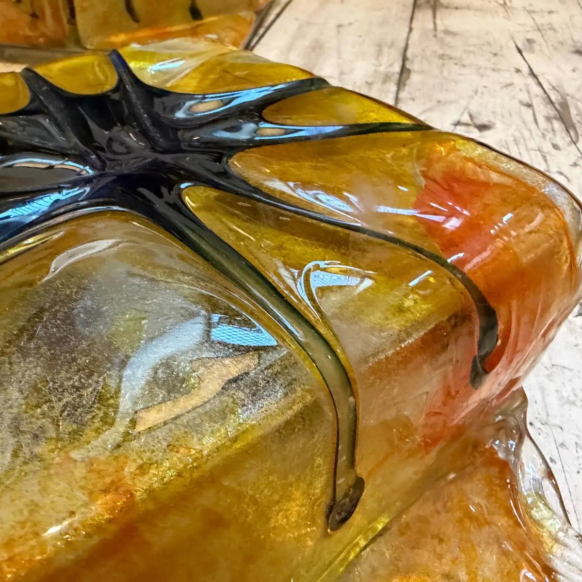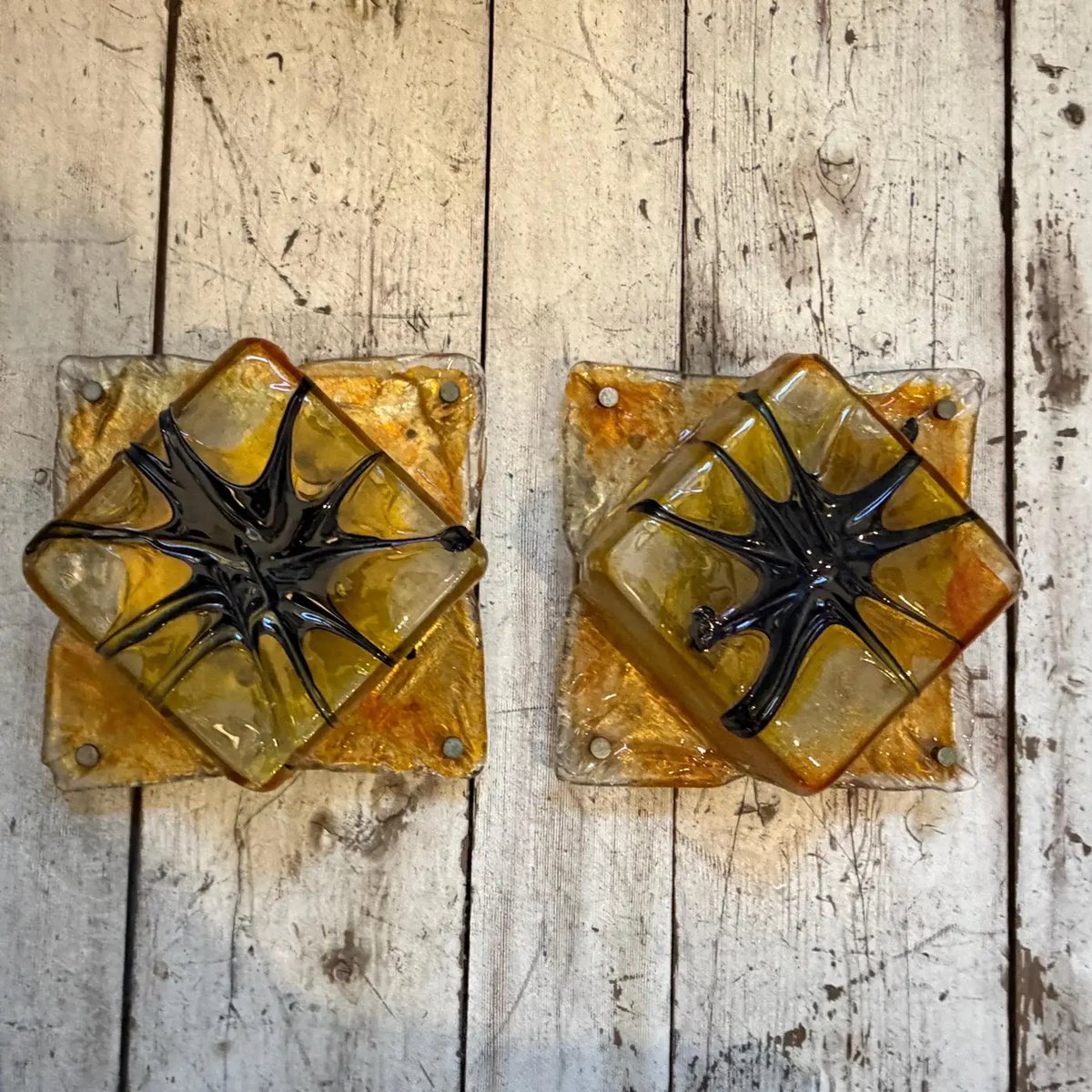 Diese exquisiten und seltenen italienischen Leuchten sind ein beeindruckendes Beispiel für das Space-Age-Design der 1970er Jahre, das der renommierten Glasmanufaktur Mazzega Murano zugeschrieben wird. Es handelt sich um ein Paar quadratischer Wandleuchten oder Deckenleuchten, die jeweils aus dickem, reich strukturiertem Muranoglas gefertigt sind. Die Grundschicht besteht aus einer brillanten, metallischen Gold- oder Bernsteinfärbung, die beim Beleuchten einen schillernden, fast vulkanartigen Effekt erzeugt. Darüber liegt eine klare, erhabene Glasdiamantform, die dramatisch mit handaufgetragenen Spuren aus schwarzem Glas verziert ist, die an einen Sternenregen, eine Spinne oder eine abstrakte Explosion erinnern – eine charakteristische Technik dieser Epoche. Die schwere, skulpturale Qualität des Glases, kombiniert mit der kräftigen Farbgebung und dem atominspirierten Design, macht sie zu einem auffälligen Statement-Stück, das sich perfekt für Vintage- oder zeitgenössische Innenräume eignet, die einen Hauch von echtem italienischem Luxus der Mitte des Jahrhunderts suchen. Sie sind für die bündige Montage an einer Wand oder Decke konzipiert. Sie befinden sich in einem ausgezeichneten Vintage-Zustand, der ihrem Alter und ihrer Nutzung entspricht, und sind voll funktionsfähig.