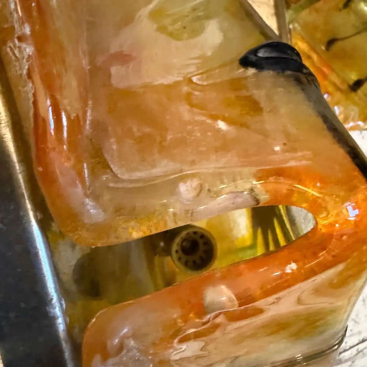 These exquisite and rare Italian light fixtures are a stunning example of 1970s Space Age design, attributed to the renowned Mazzega Murano glassworks. This is a pair of square wall sconces or ceiling lights, each crafted from thick, richly textured Murano glass. The base layer features a brilliant, metallic gold or amber fuming that creates a dazzling, almost volcanic effect when lit. Overlaying this is a clear, raised glass diamond shape, which is dramatically decorated with hand-applied trails of black glass resembling a starburst, a spider, or an abstract explosion—a signature technique of the era. The heavy, sculptural quality of the glass, combined with the bold color scheme and atomic-inspired design, makes them a striking statement piece perfect for vintage or contemporary interiors seeking a touch of true mid-century modern Italian luxury. They are designed to be flush-mounted to a wall or ceiling. They are in excellent vintage condition, consistent with age and use and in working order.