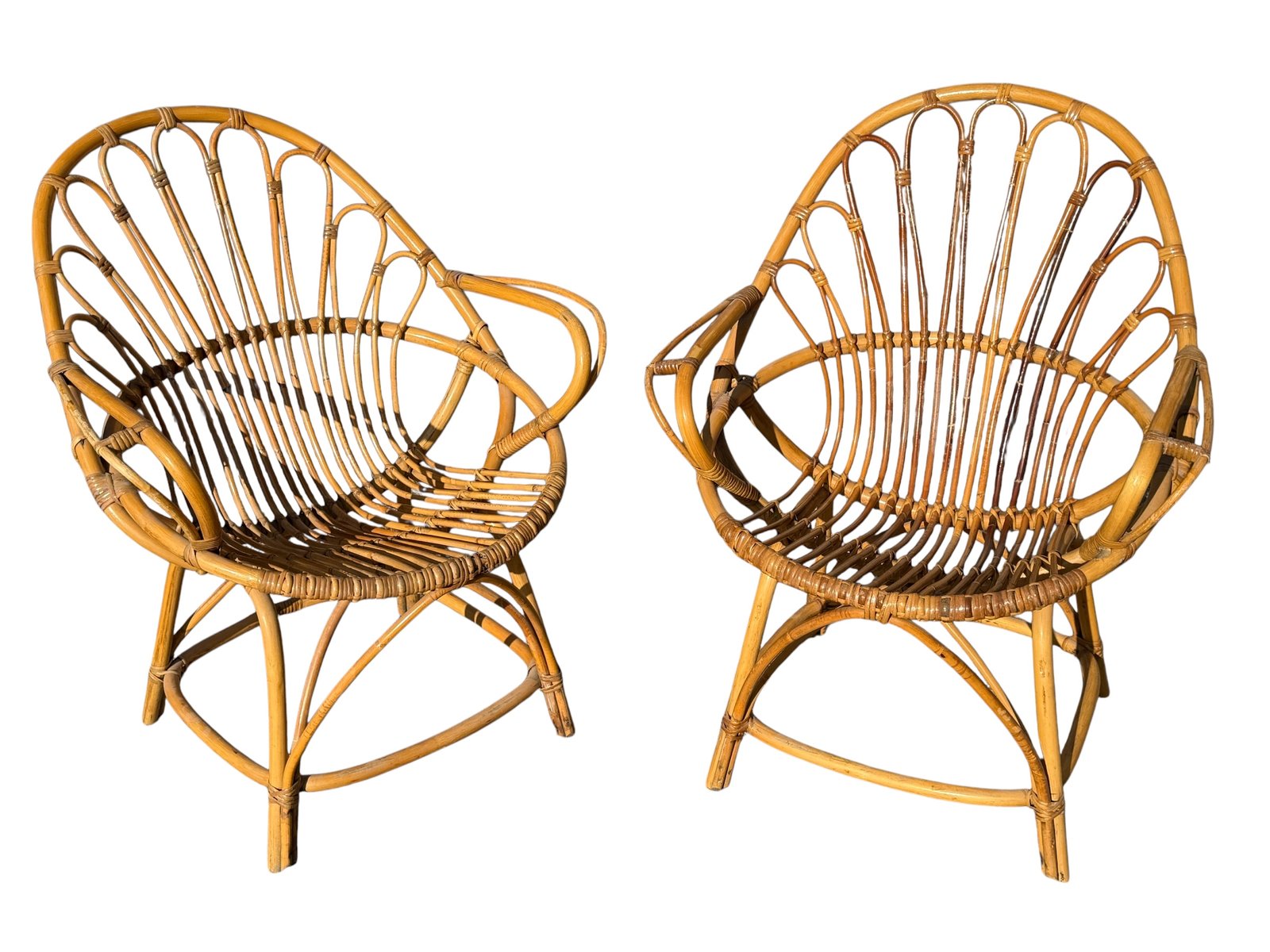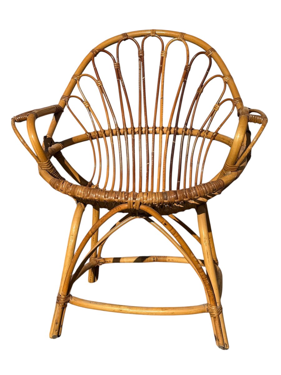 This set of eight mid-century French lounge chairs from the French Riviera features a circular bamboo frame and hand-woven rattan. Their elegant design and exceptional comfort make them a perfect addition to any living space. Made in the South of France in the 1960s, these chairs boast exquisite detailing and perfect proportions, combining style and durability. Sturdy and in very good condition, they offer a seat height of 42 cm. They are in excellent original condition, with some minor imperfections on a few chairs and slight, normal wear on the wrapped rattan edges, which does not compromise the overall structure. These chairs are a timeless centerpiece, ideal for relaxing in style.