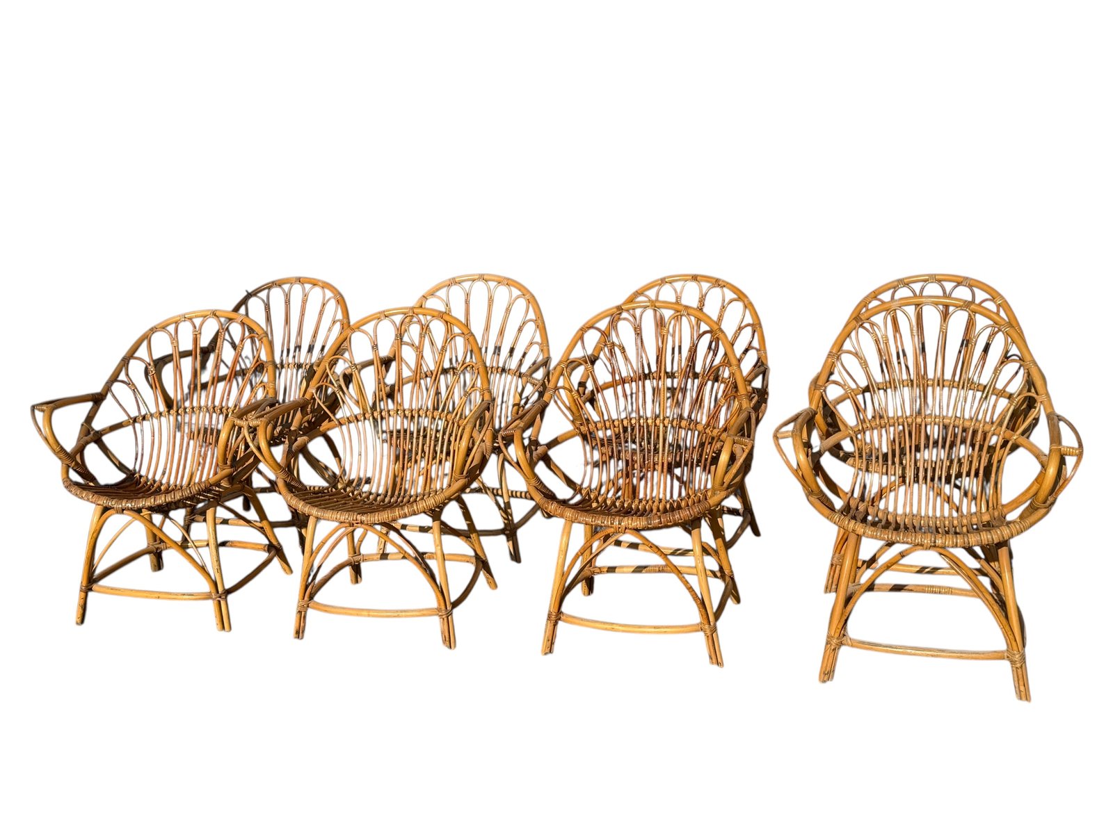 Set of 8 Magnificent Mid-Century French Bamboo and Rattan Lounge Chairs