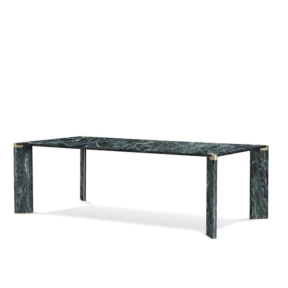 Linear profiles cleverly counterbalance the luxurious personality of this dining table, entirely fashioned of prized Verde Alpi marble. Accented with aluminum inserts, the structure reveals a refined '80s echo through the flattened legs, which feature a 45° rotation from the wide rectangular top. Please browse the Artemest catalog for available variants.Linear profiles cleverly counterbalance the luxurious personality of this dining table, entirely fashioned of prized Verde Alpi marble. Accented with aluminum inserts, the structure reveals a refined '80s echo through the flattened legs, which feature a 45° rotation from the wide rectangular top. Please browse the Artemest catalog for available variants.