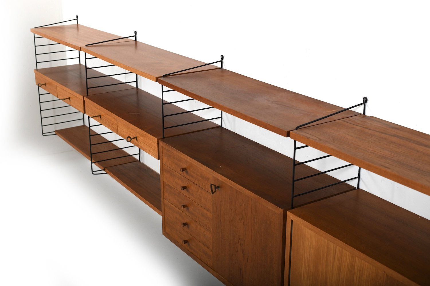 Regalsystem aus Teakholz von Kajsa & Nils Nisse Strinning für String, 1950er Jahre. Hergestellt aus Teakholz. Modell "String". Wandhalterungen aus schwarz lackiertem Metall. Regale in verschiedenen Größen. 3 Regale mit zwei Schubladen darunter. Zwei Schränke mit Schubladen und einer Tür. Ein Kabinett nur mit Türen. Produziert von String Design AB Schweden.