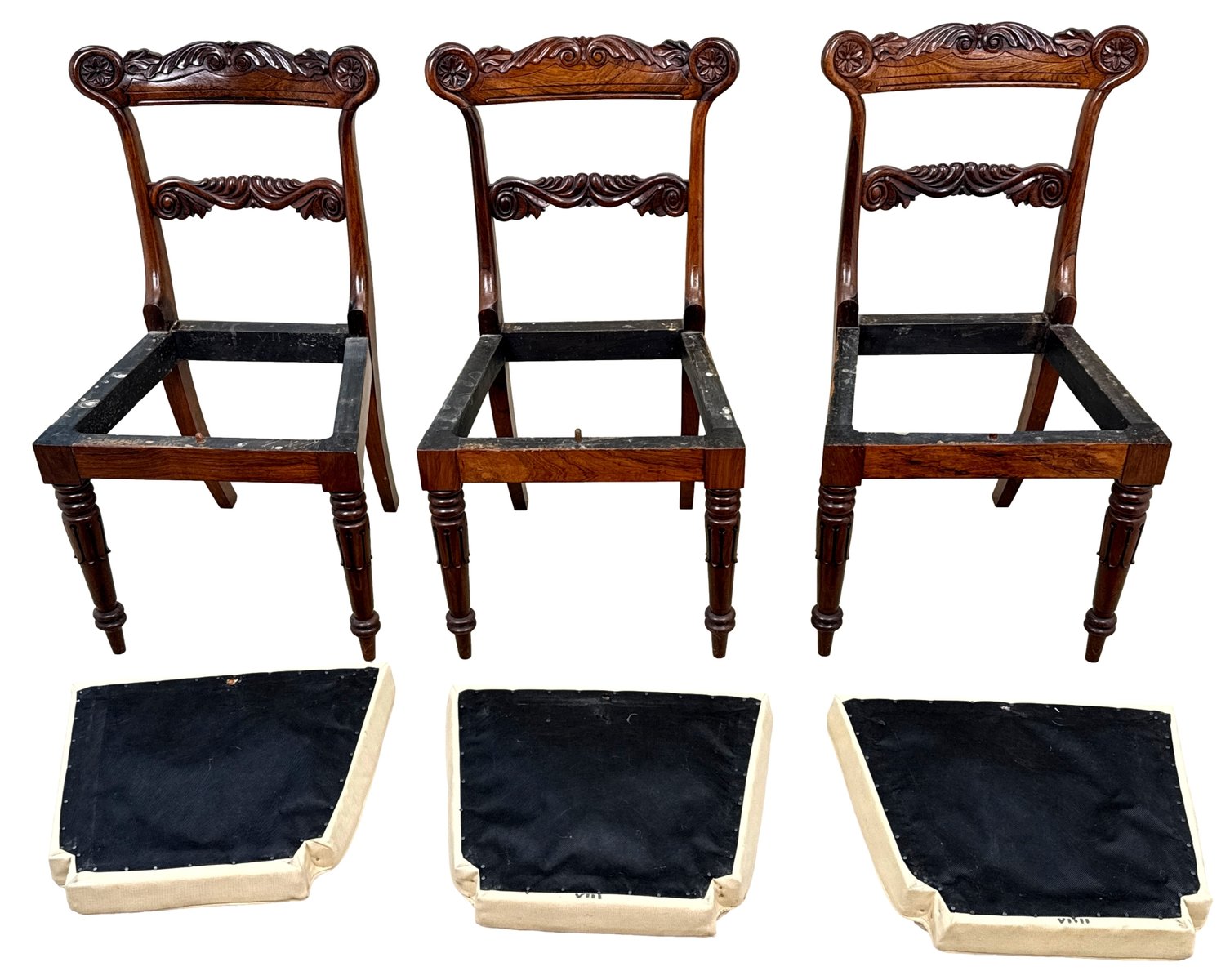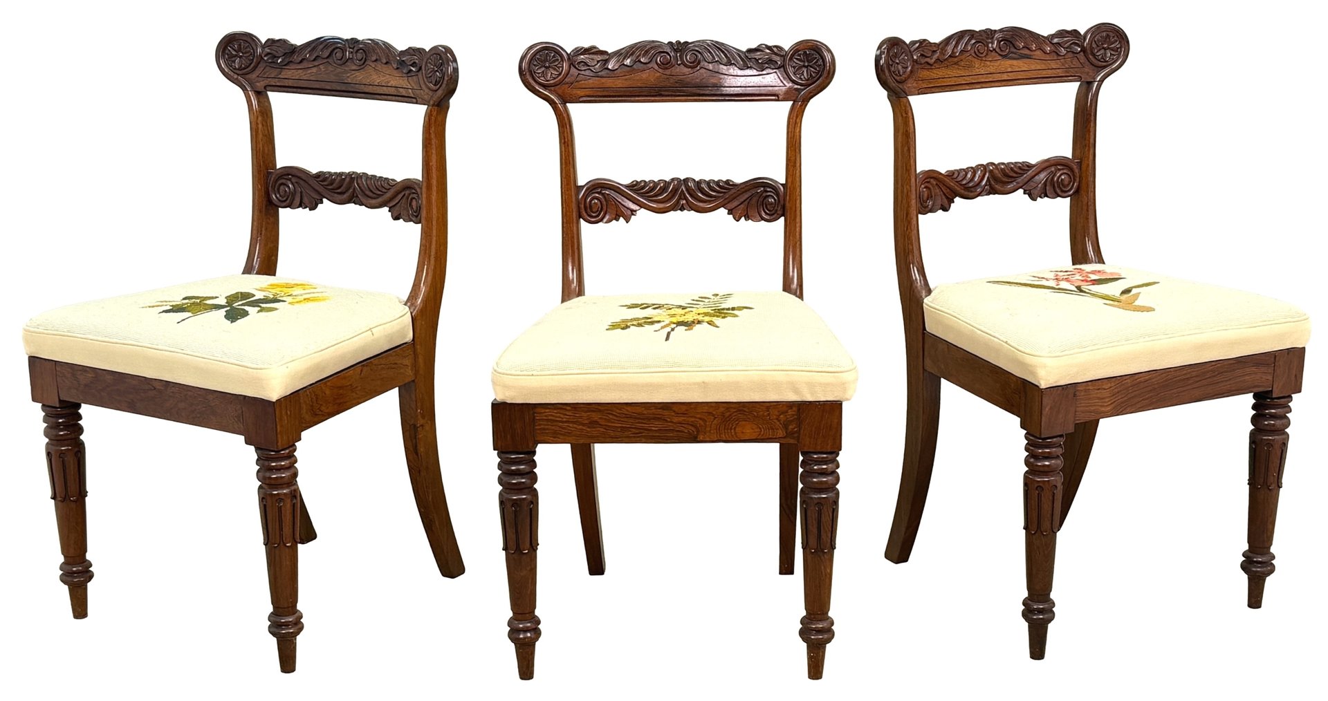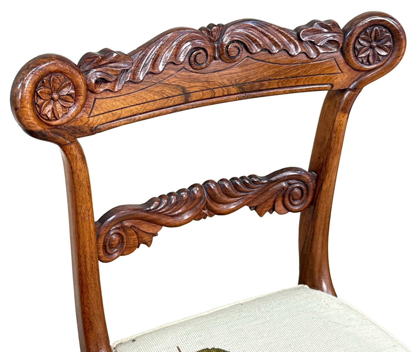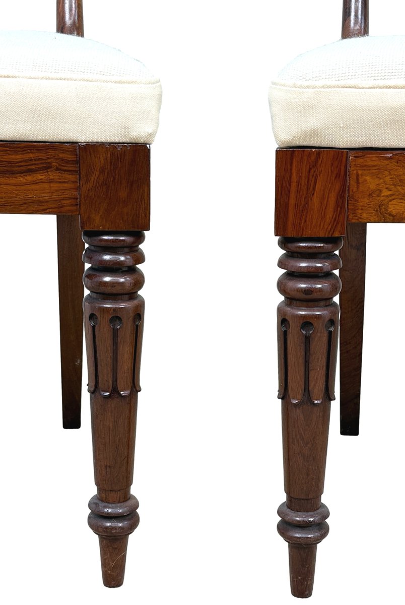 This beautiful set of dining chairs were clearly made in one of the top London cabinet making workshops of the early 19th century, boasting wonderfully rich rosewood timbers and a depth of carving rarely found. They are also remarkably sturdy and fit for purpose, which often isn't the case of course for sets of regency dining chairs, many of which can have a tendency to be a little small. These chairs are anything but that, boasting impressive comfortable seats which any person of any size can sit on and be happy