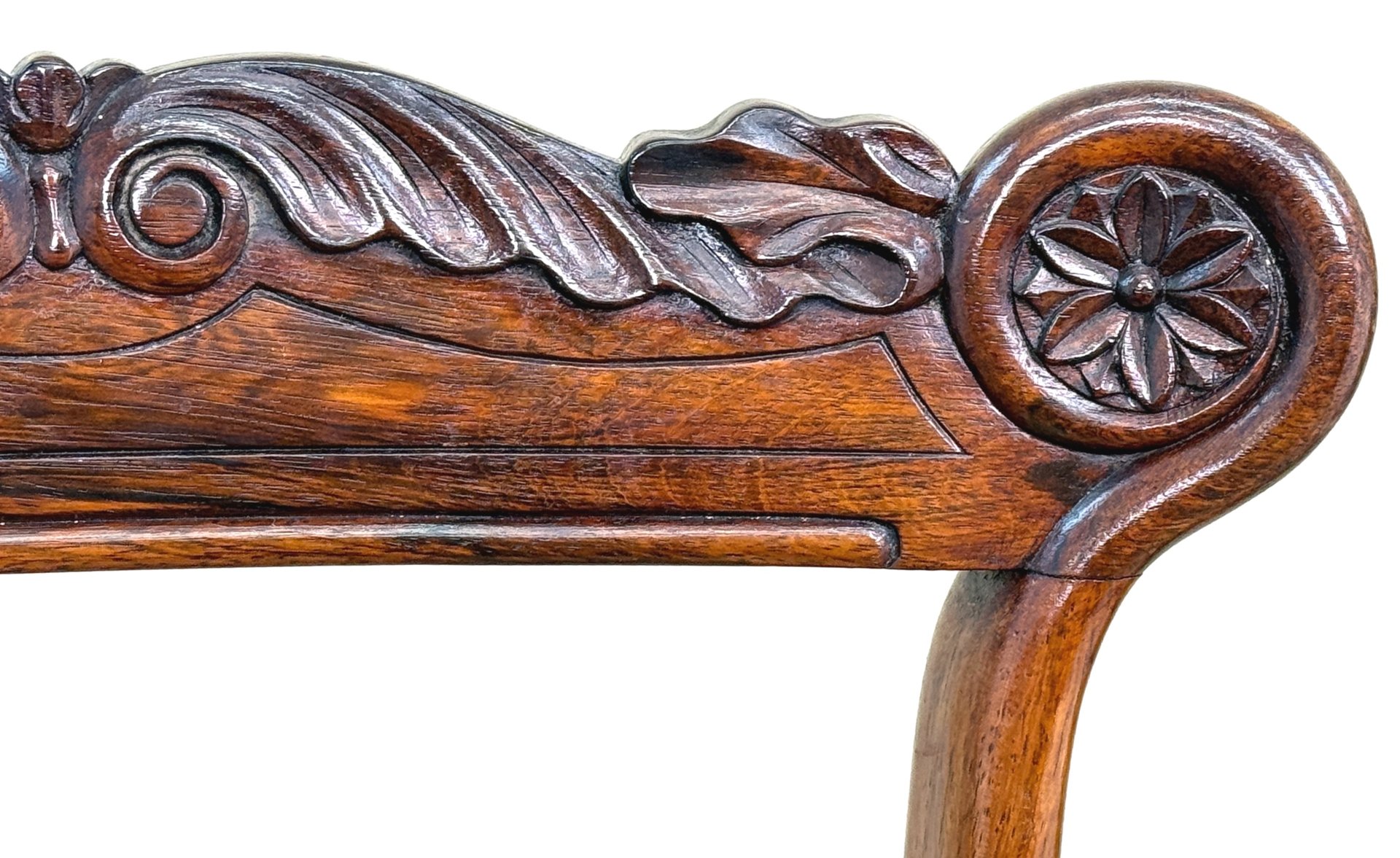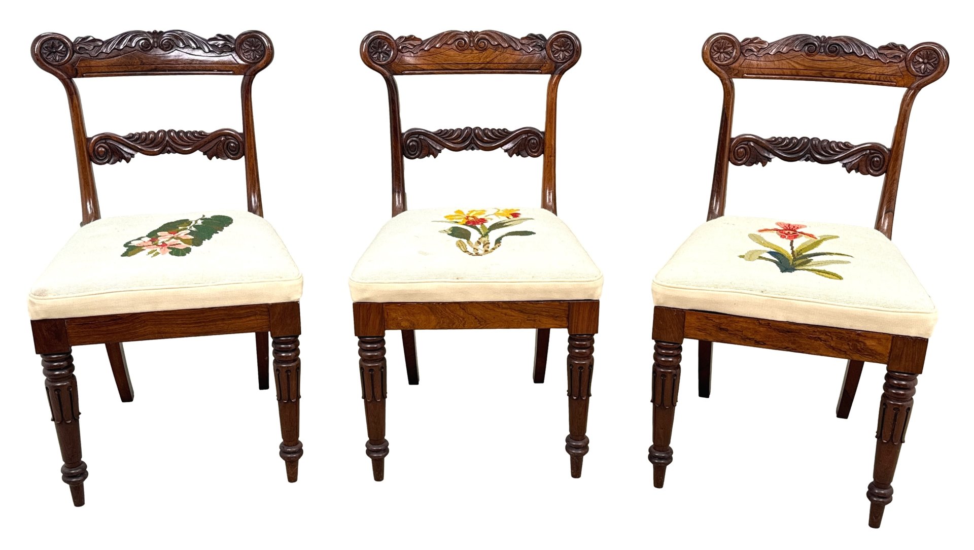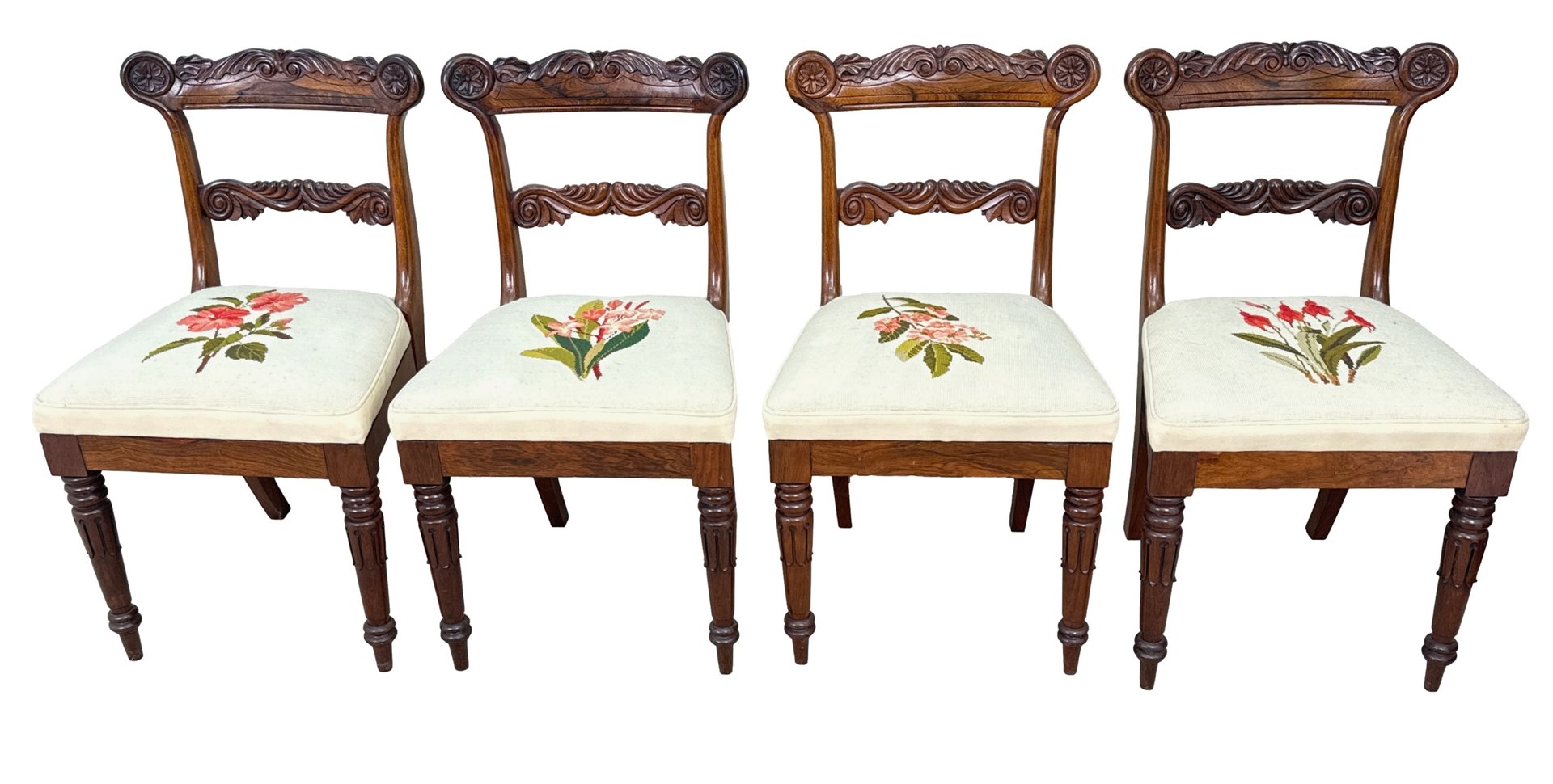 This beautiful set of dining chairs were clearly made in one of the top London cabinet making workshops of the early 19th century, boasting wonderfully rich rosewood timbers and a depth of carving rarely found. They are also remarkably sturdy and fit for purpose, which often isn't the case of course for sets of regency dining chairs, many of which can have a tendency to be a little small. These chairs are anything but that, boasting impressive comfortable seats which any person of any size can sit on and be happy