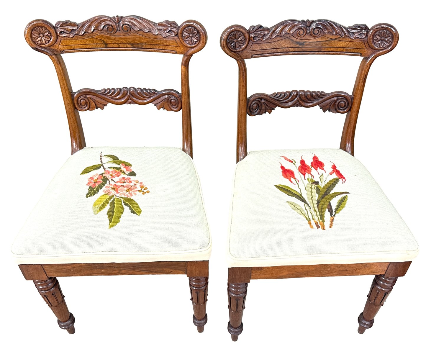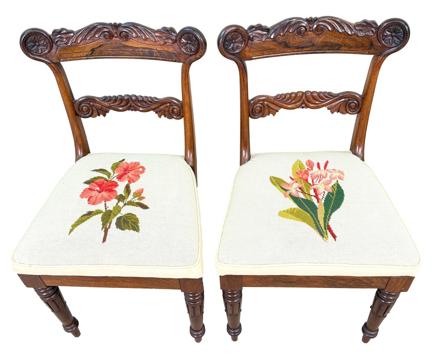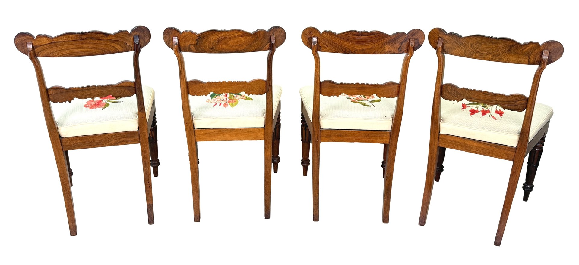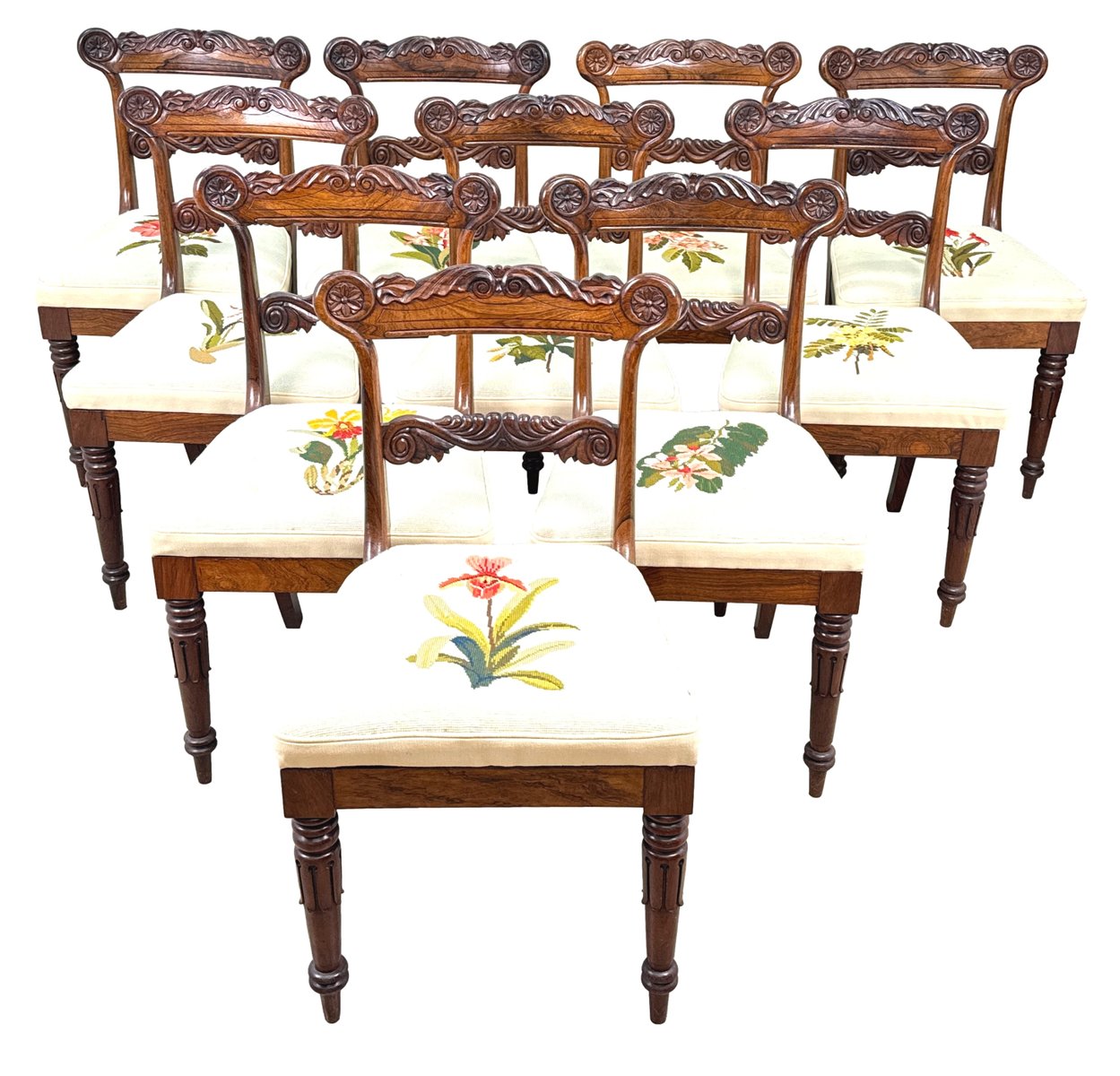 This beautiful set of dining chairs were clearly made in one of the top London cabinet making workshops of the early 19th century, boasting wonderfully rich rosewood timbers and a depth of carving rarely found. They are also remarkably sturdy and fit for purpose, which often isn't the case of course for sets of regency dining chairs, many of which can have a tendency to be a little small. These chairs are anything but that, boasting impressive comfortable seats which any person of any size can sit on and be happy