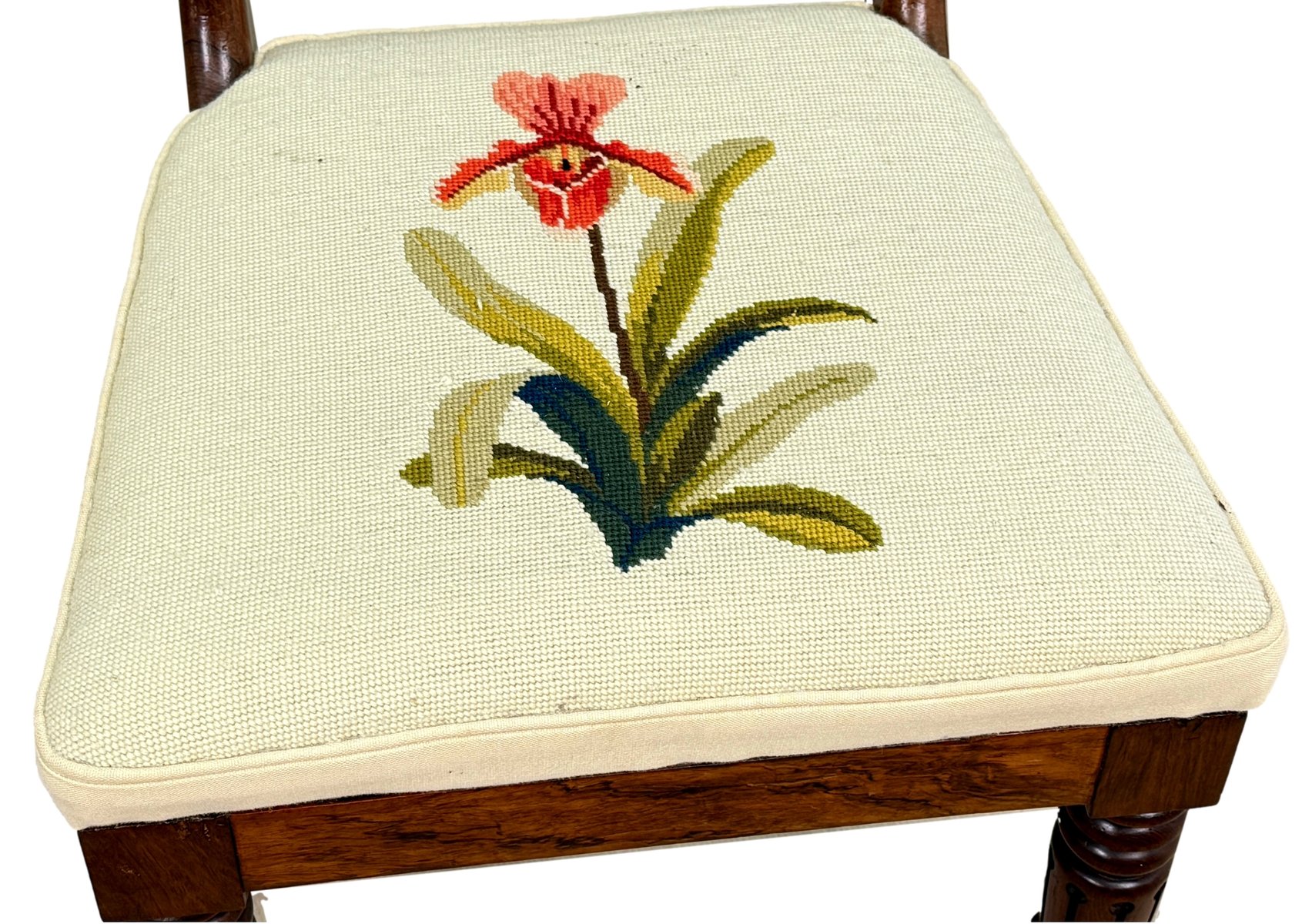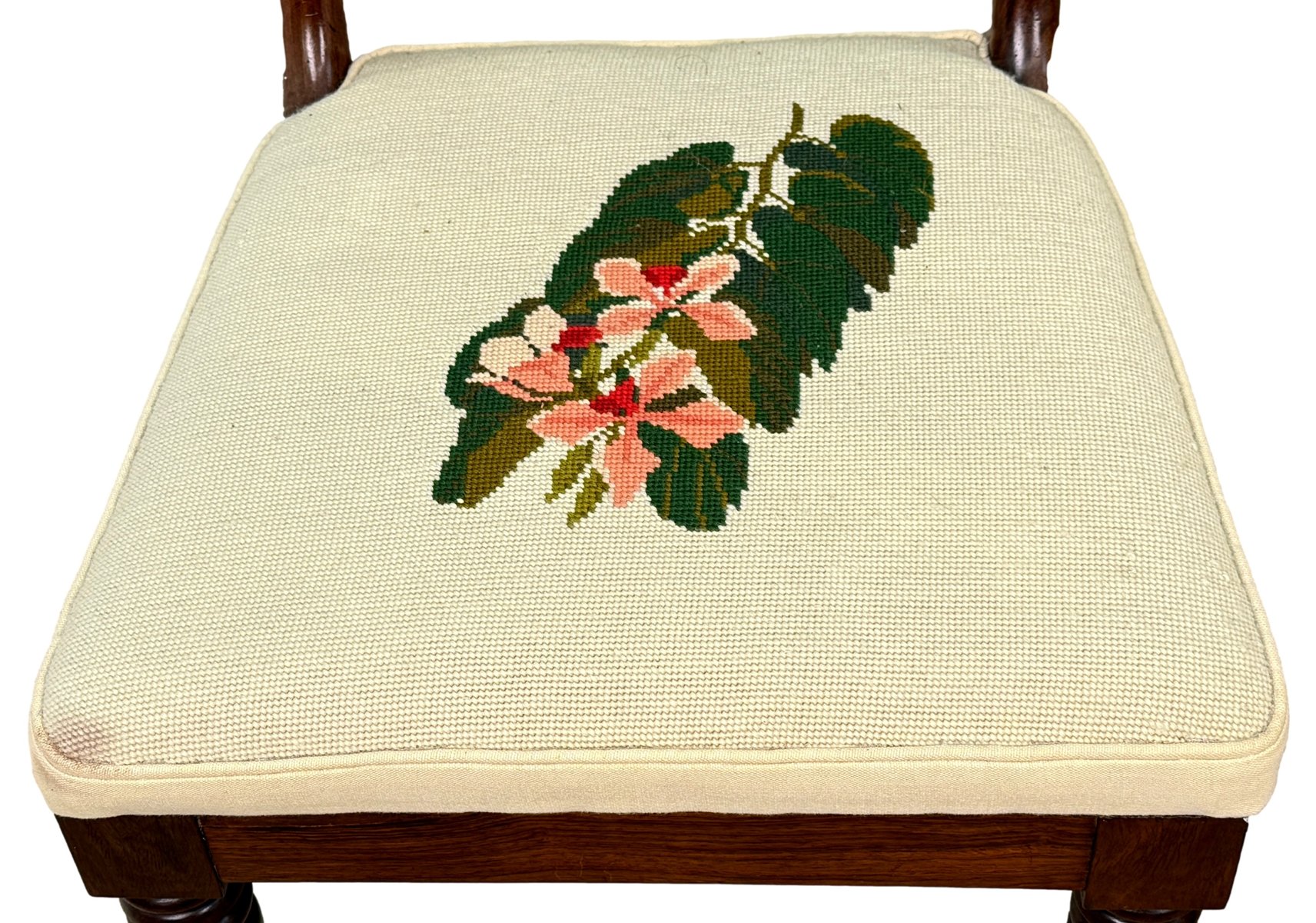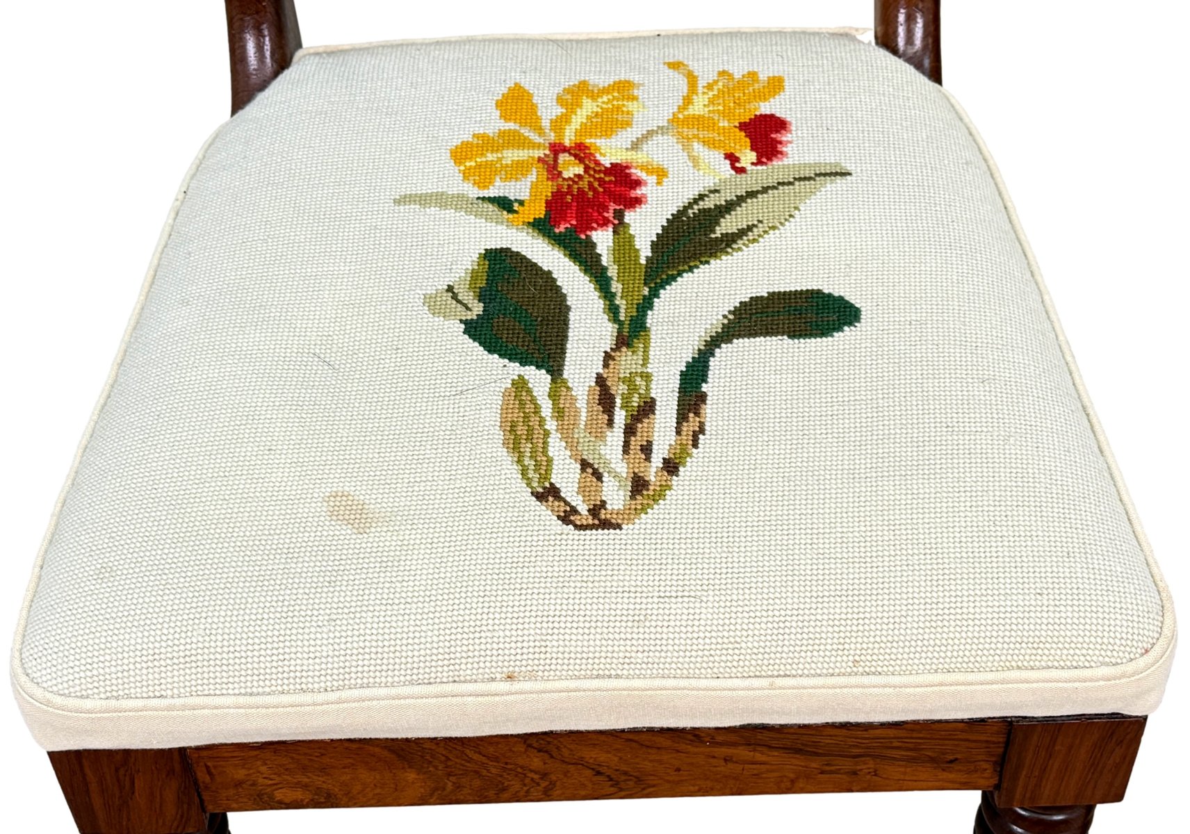 The chairs have also been covered individually not that long ago in striking cream fabric with lovely needlepoint decoration to each individual chair. Clearly somebody somewhere has spent many, many hours making these seats and must have been very happy with their work. It is worth noting that there are a just a few small old marks and stains to the fabric, however nothing overly obvious without close inspection and actually with careful knowhow then they could possibly even be removed. We have made sure that any marks to the upholstery are clearly visble in the closeup photos of the seats. Another point worth noting however is that despite the seats being of the larger stuffover variety they can still be very easily removed from the chairs should purchaser which to change the fabric for something of their own taste and choice at relatively low cost.
