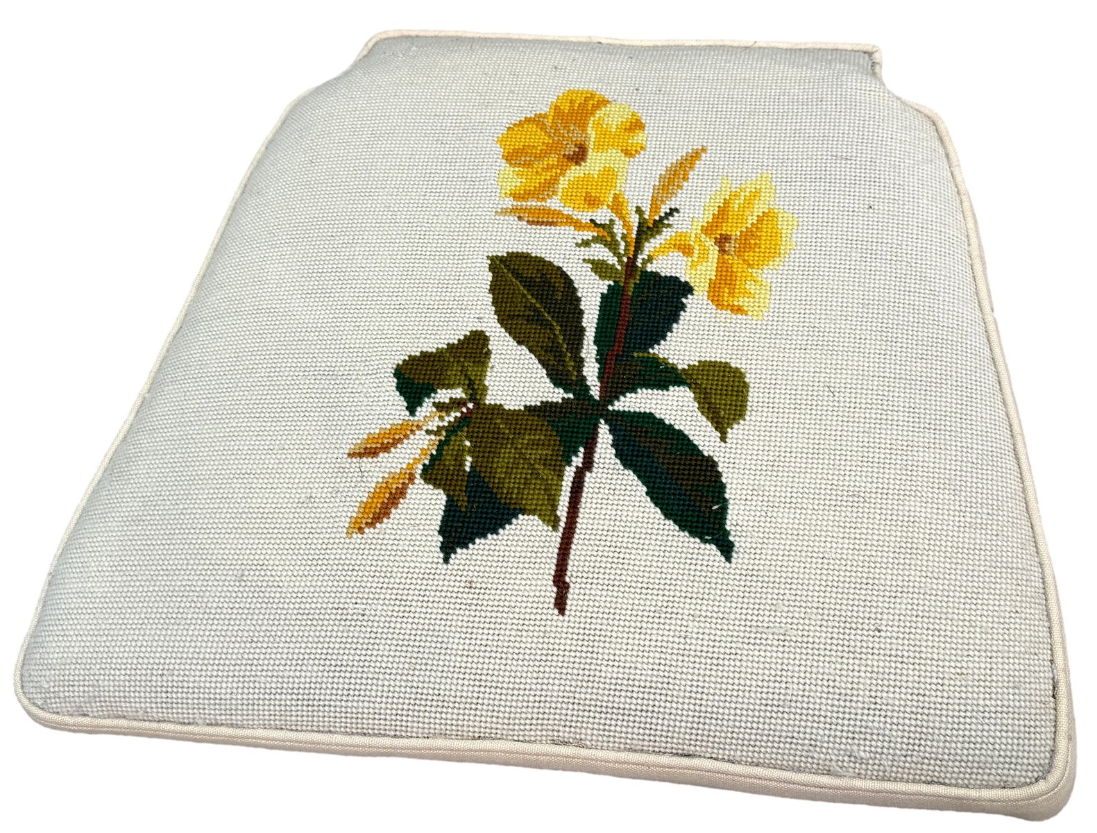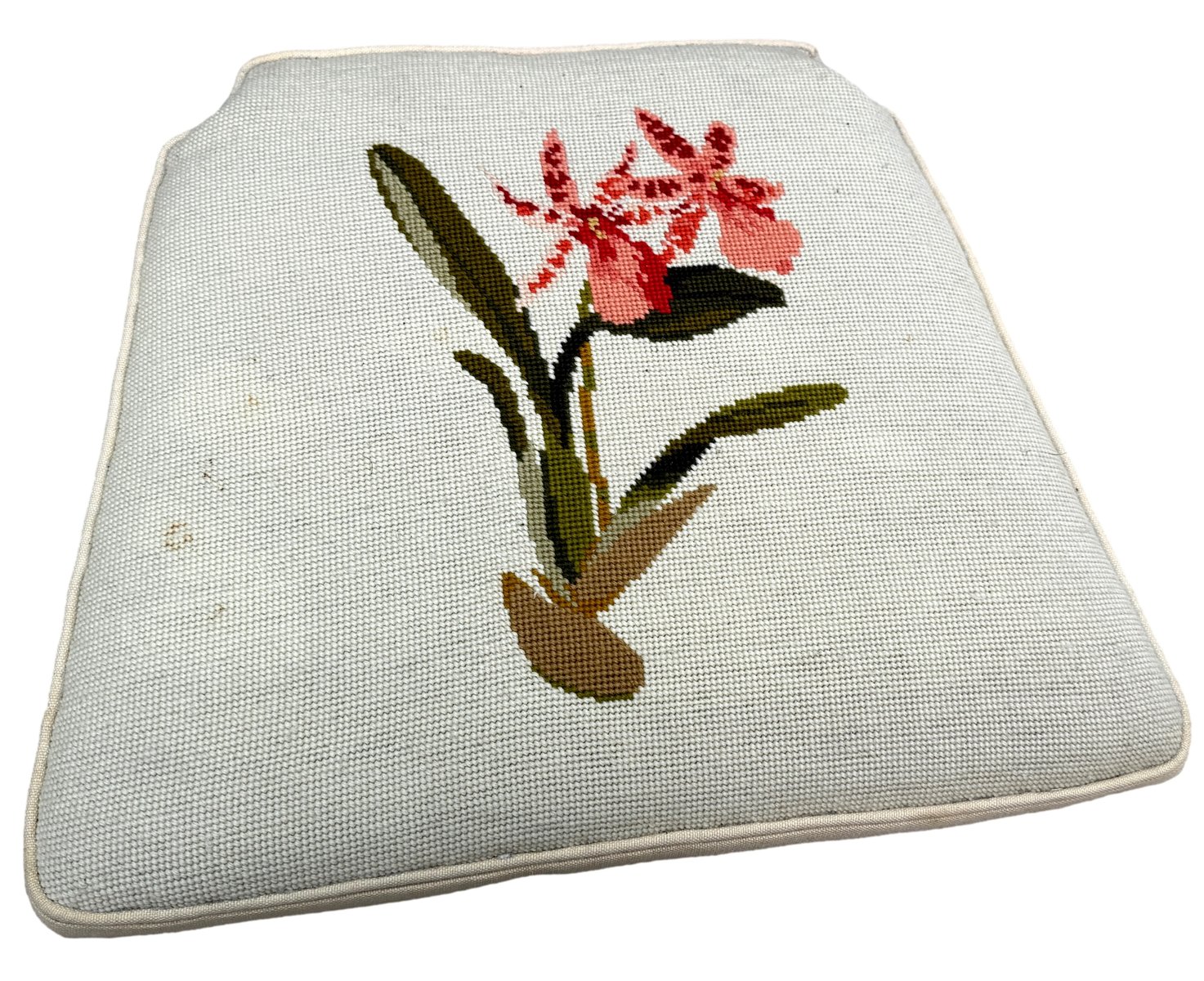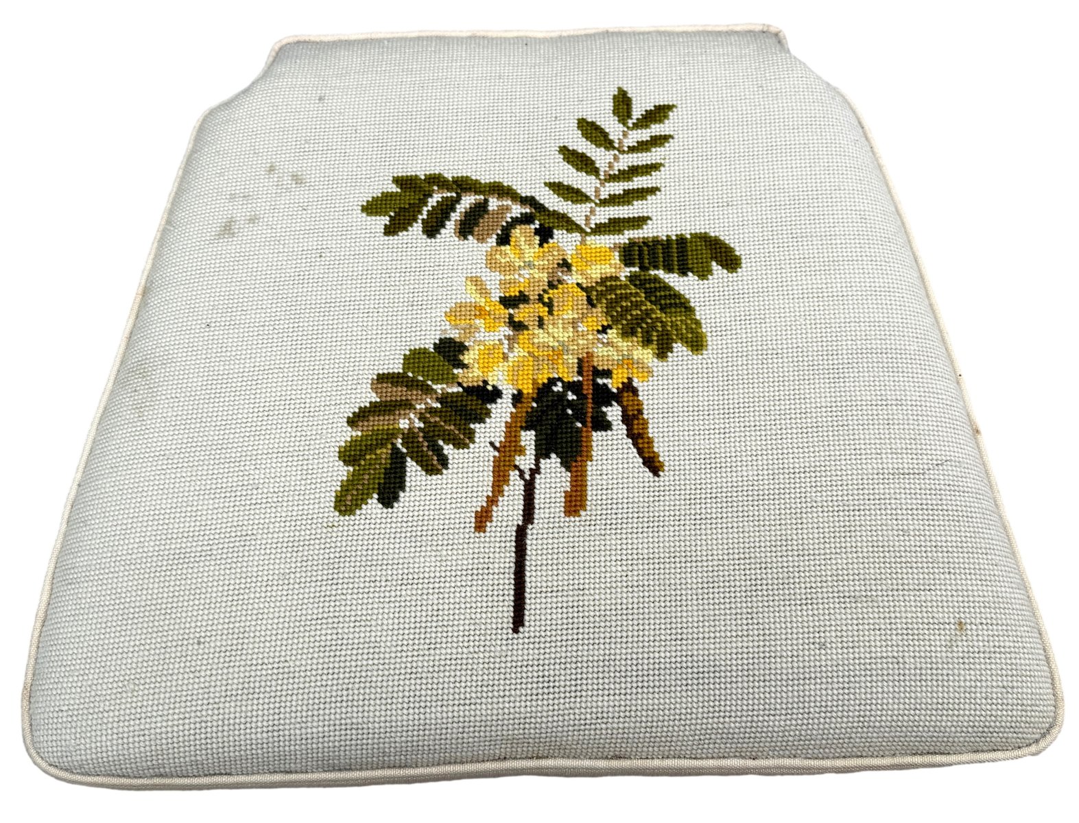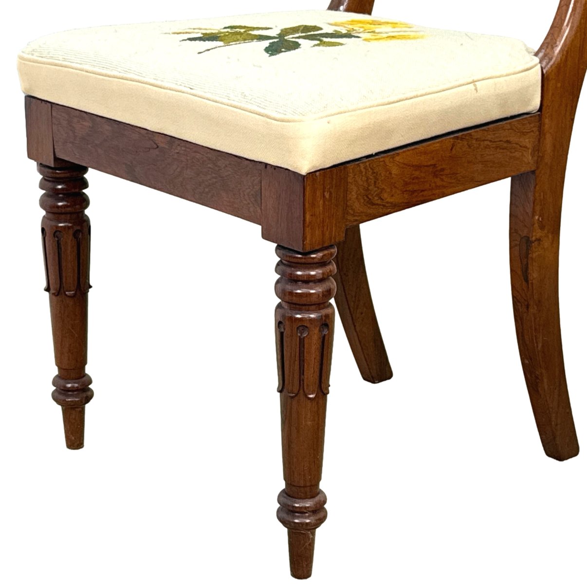 The chairs have also been covered individually not that long ago in striking cream fabric with lovely needlepoint decoration to each individual chair. Clearly somebody somewhere has spent many, many hours making these seats and must have been very happy with their work. It is worth noting that there are a just a few small old marks and stains to the fabric, however nothing overly obvious without close inspection and actually with careful knowhow then they could possibly even be removed. We have made sure that any marks to the upholstery are clearly visble in the closeup photos of the seats. Another point worth noting however is that despite the seats being of the larger stuffover variety they can still be very easily removed from the chairs should purchaser which to change the fabric for something of their own taste and choice at relatively low cost.