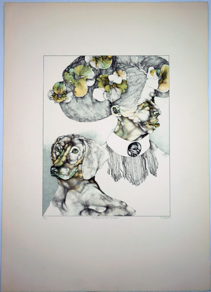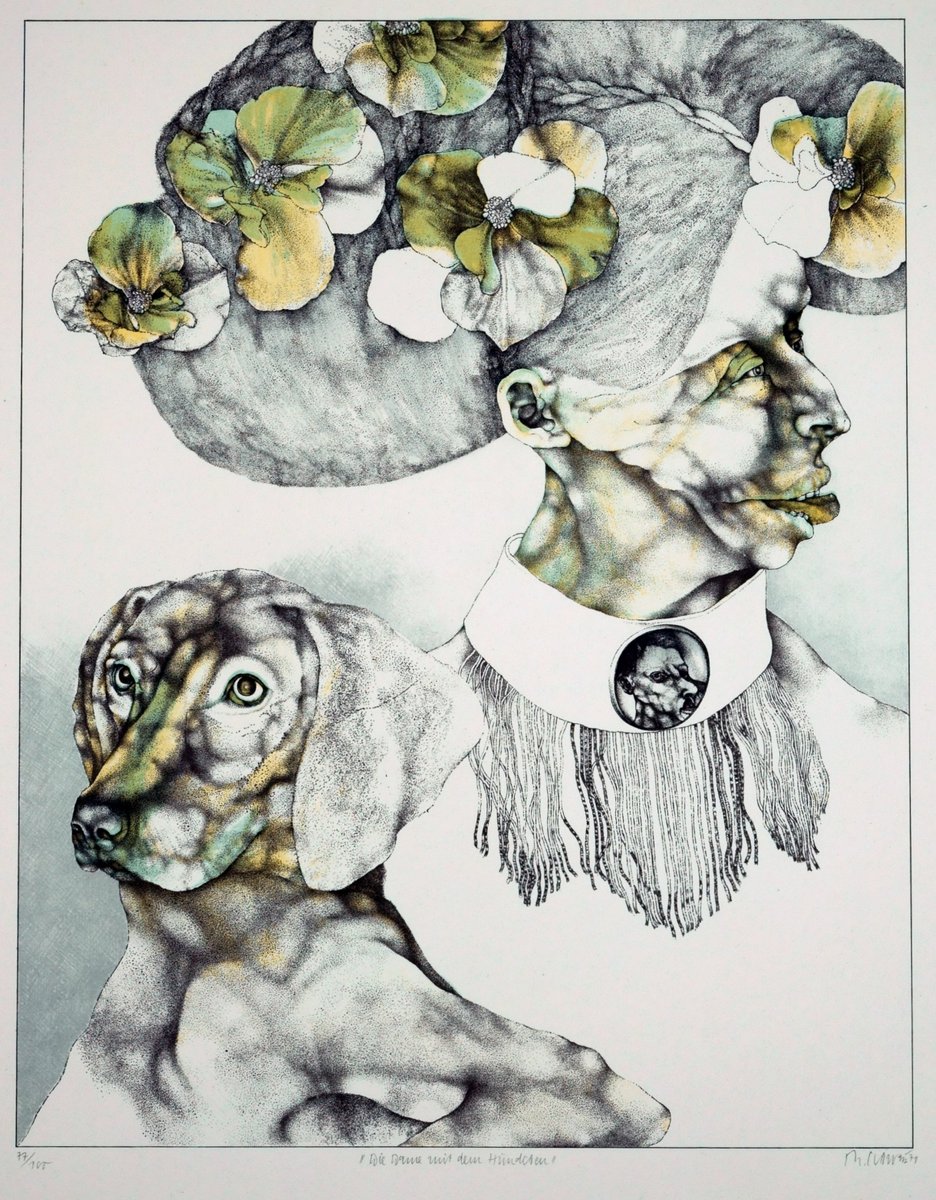 Reiner Schwarz (*1940 Hirschberg), The Lady with the Dog, 1971. Lithograph, 33 cm x 26 (image), 59 cm x 42 cm (sheet size), signed in pencil at lower right "R.[ein] Schwarz", dated "[19]71", identified as copy no. 77/100 and inscribed in the middle "Die Dame mit dem Hündchen".