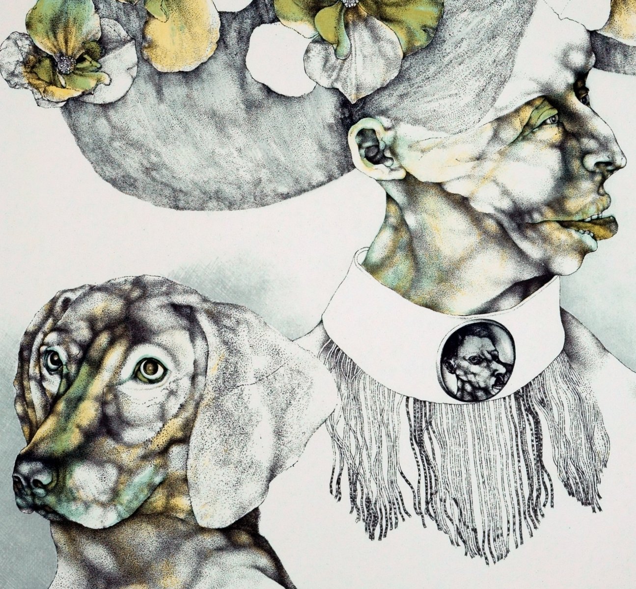 Like the master, so the dog can be applied here to the Grande Dame and her four-legged friend. The formation of the physiognomies is analogous up to the coloring, whereby the physical appearance - as usual for Reiner Schwarz - is formed by bulging parts. This clashes with the lady's pretentious beauty. Nevertheless, she has a dignity that corresponds to the dog's face, which is revealed as beauty in the blossoms that connect the two creatures.