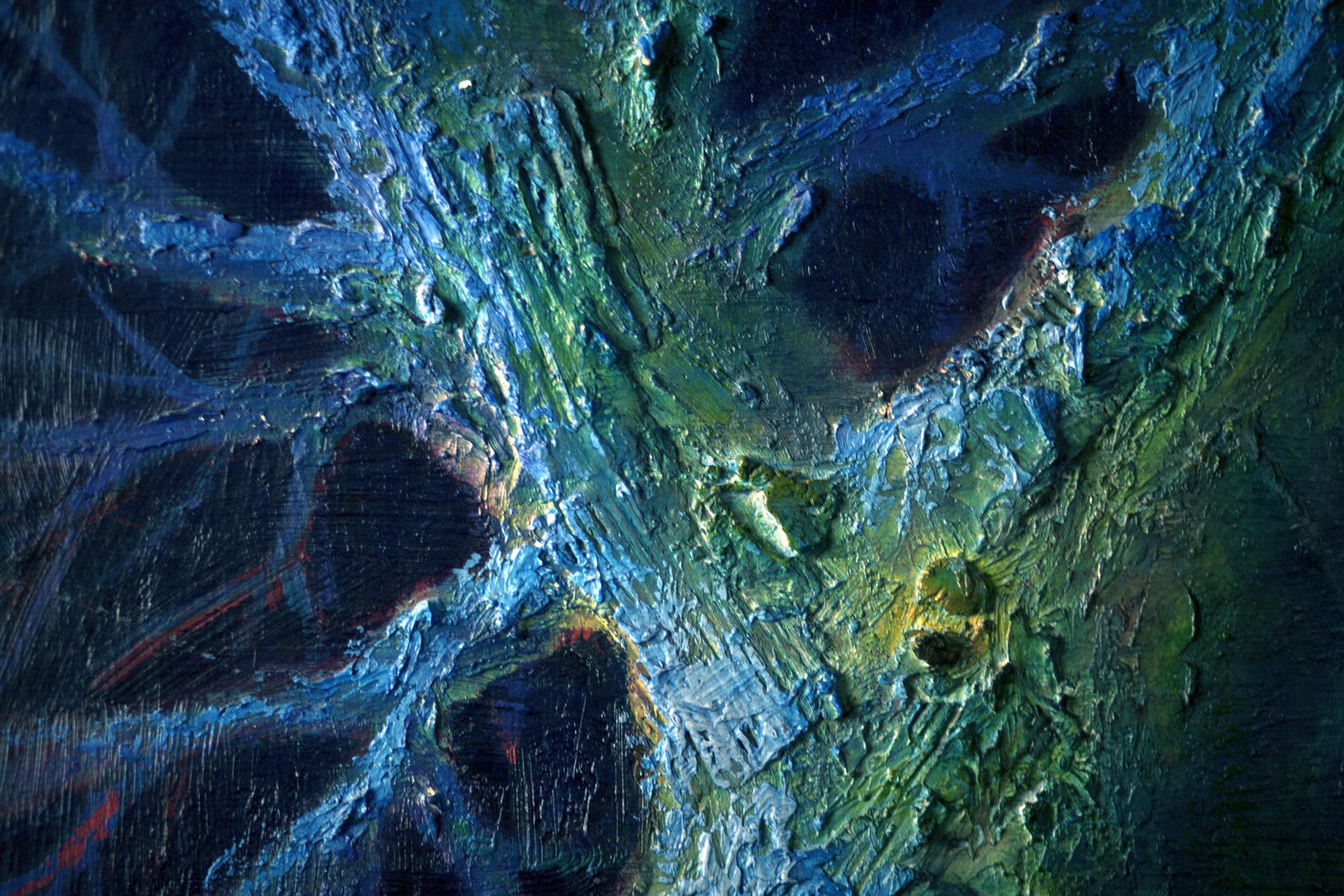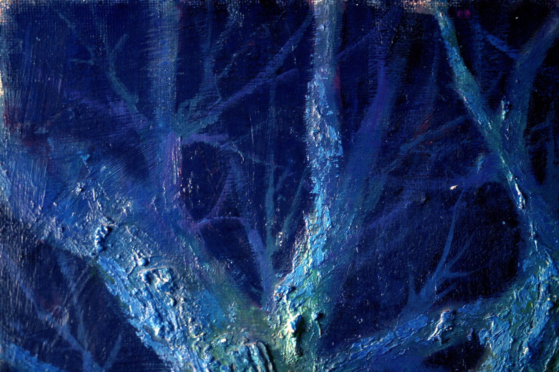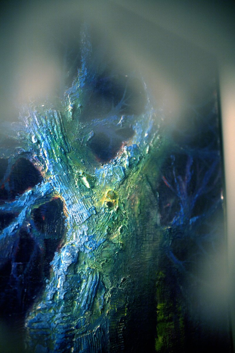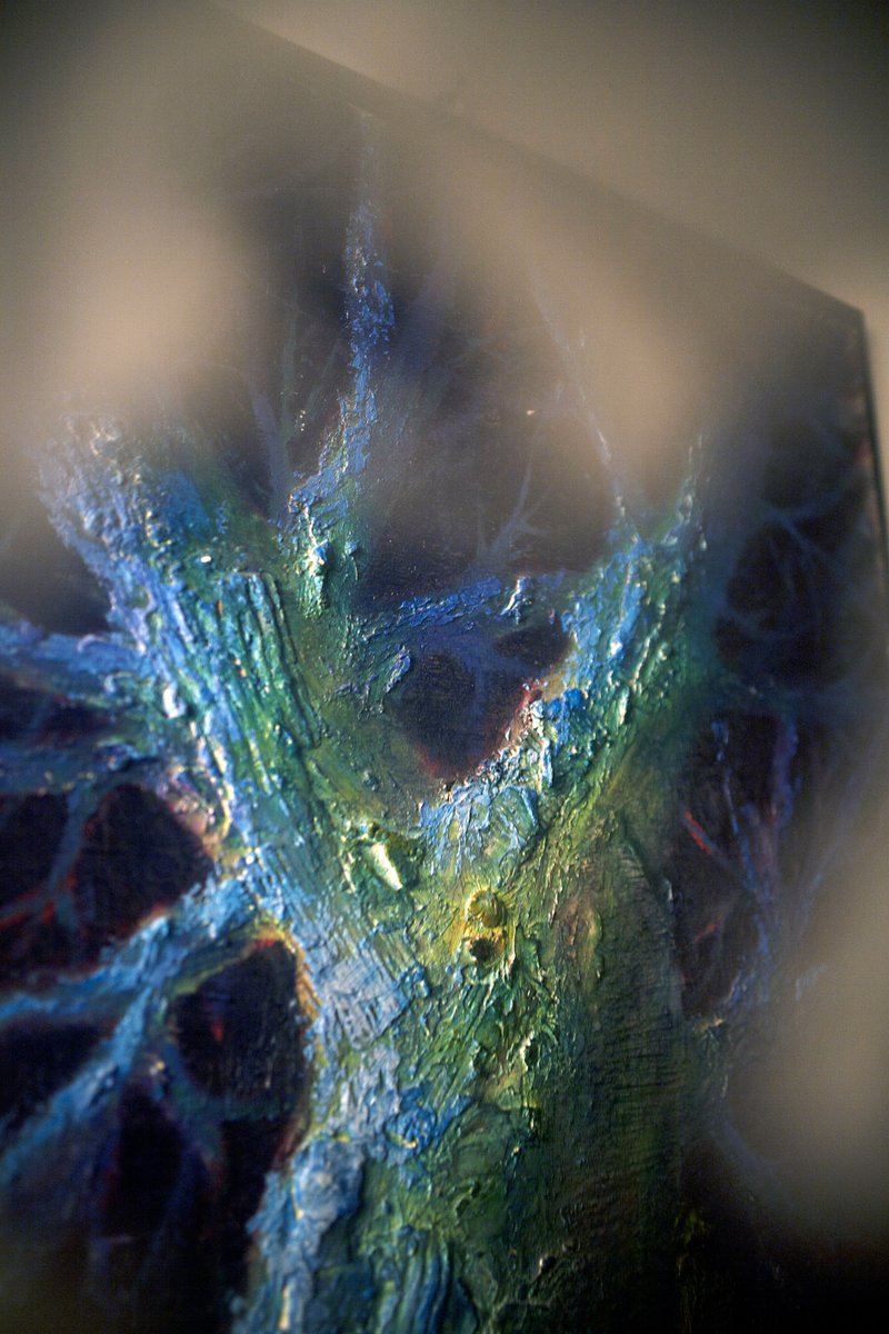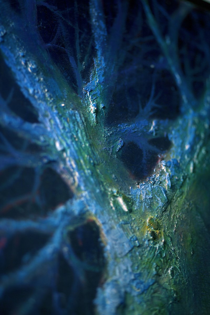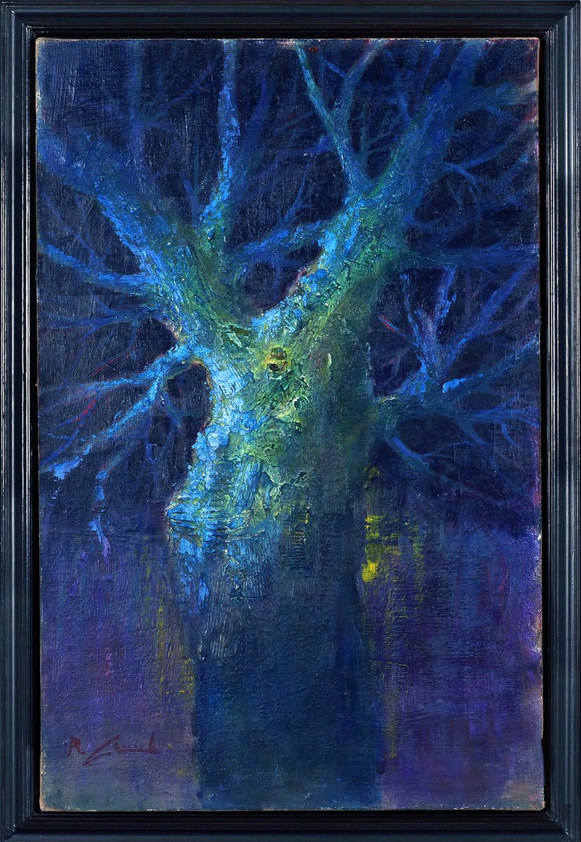 This evocative painting by Renato Criscuolo, titled "Enigmatic Tree by Night," is a captivating exploration of the interplay between light and shadow. The artist masterfully employs a rich palette of blues, greens, and purples to create an ethereal night scene where an ancient tree stands as the central figure. The use of the impasto technique adds a tactile dimension to the bark, making it almost tangible to the viewer. The tree, illuminated by an unseen light source, emanates a mystical aura, inviting contemplation and evoking a sense of mystery.