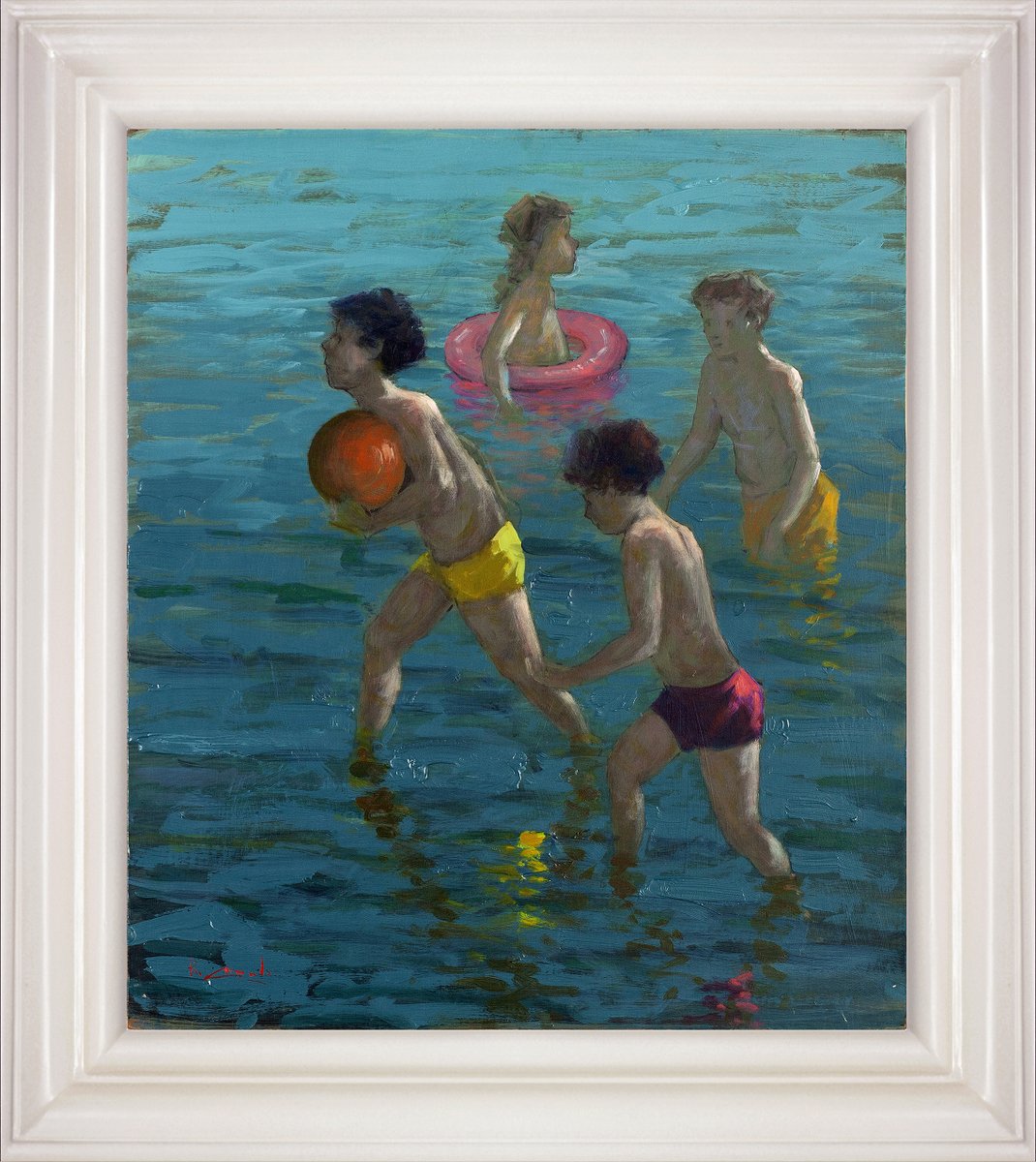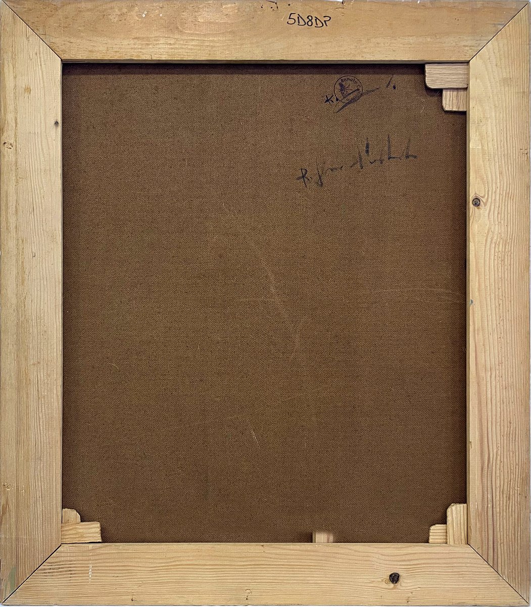 The painting is accompanied by a splendid and precious white lacquered wooden frame, adding elegance and value to the artwork.