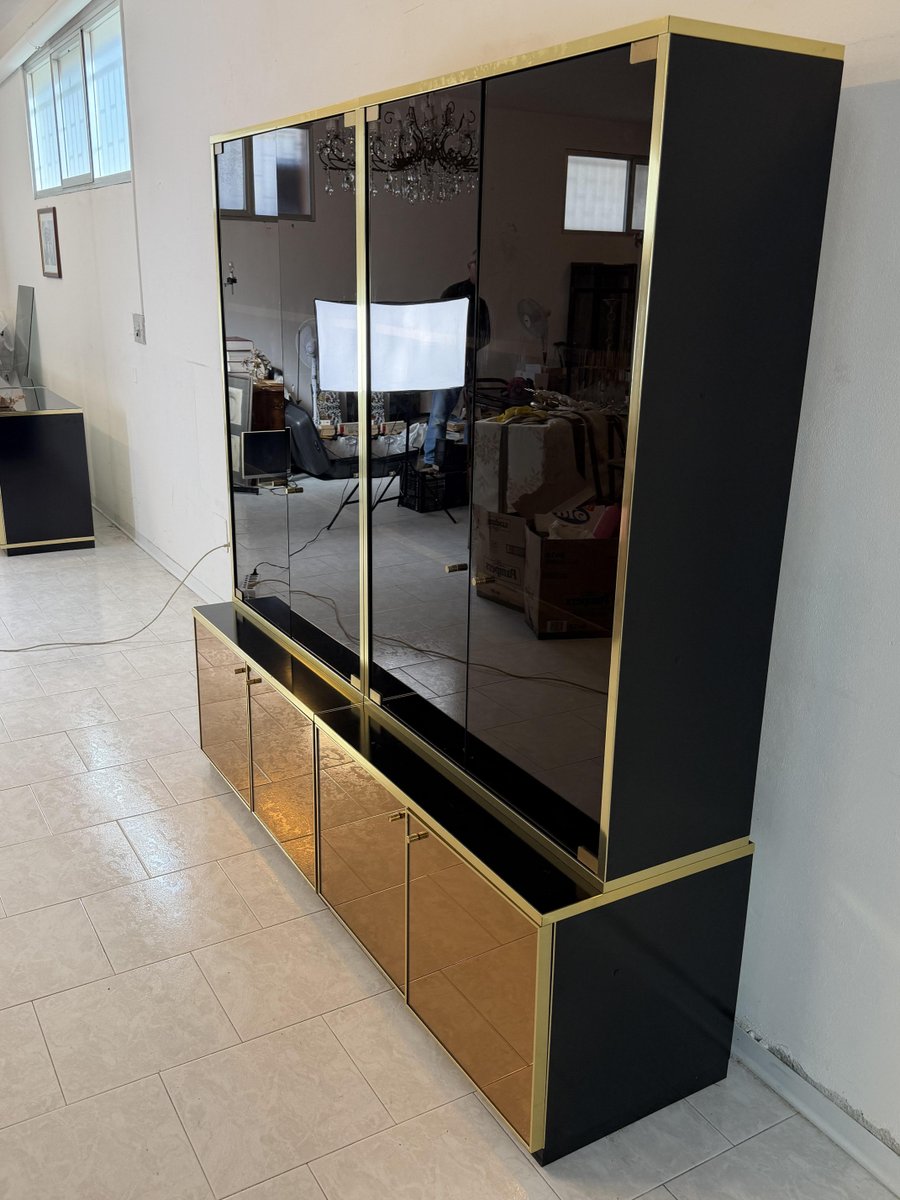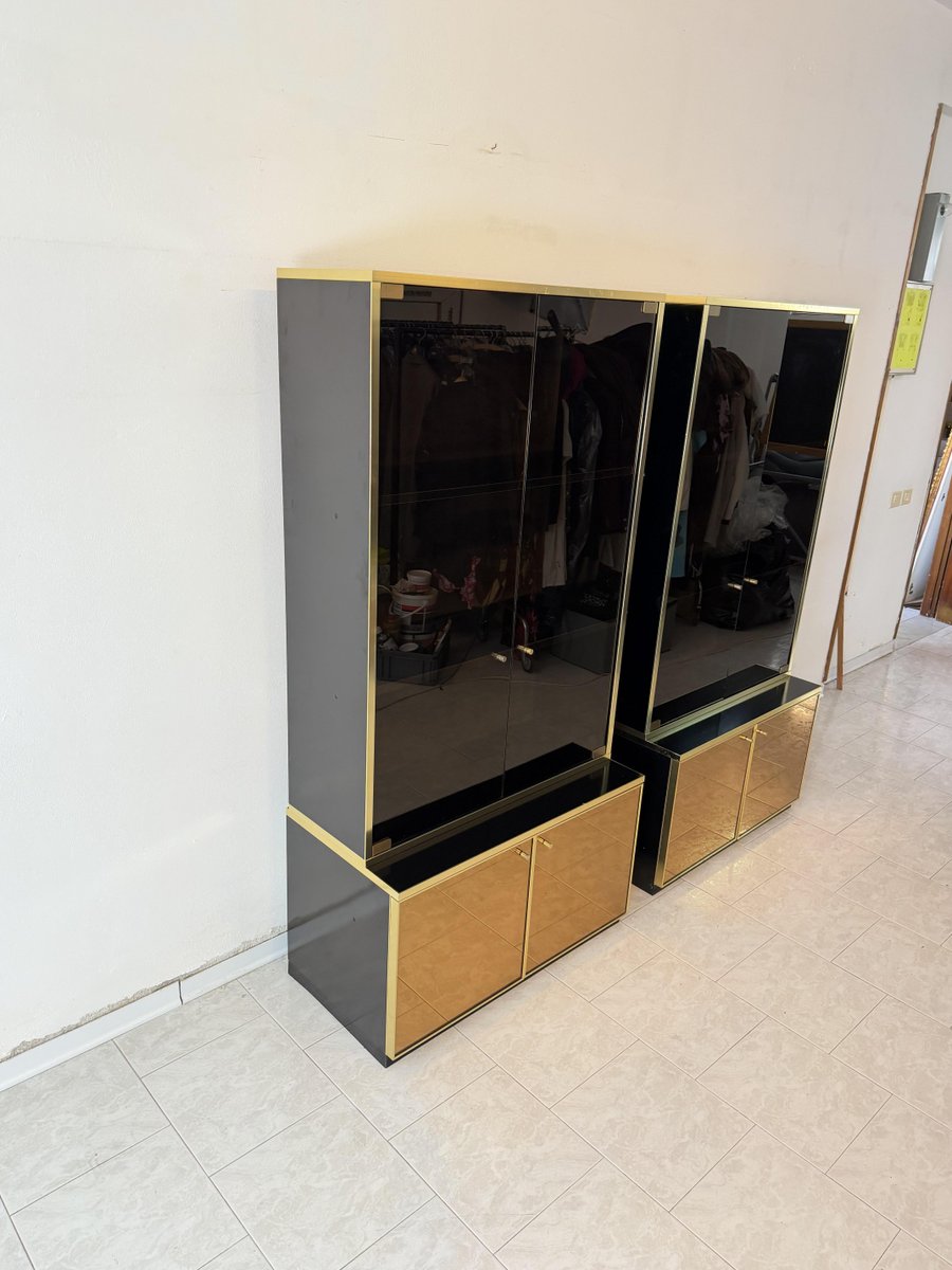 Set of two display cabinets attributed to Renato Zevi, 1970, in brass, gold-plated mirrored glass, and smoked glass.