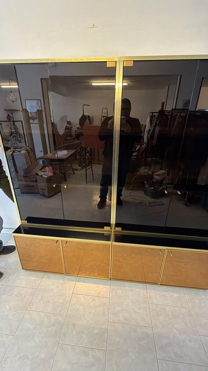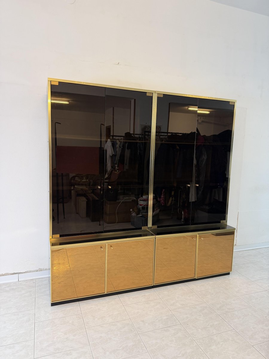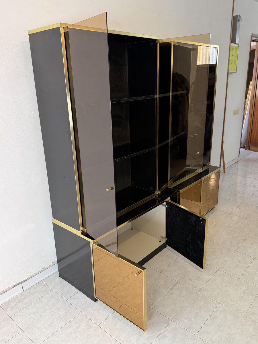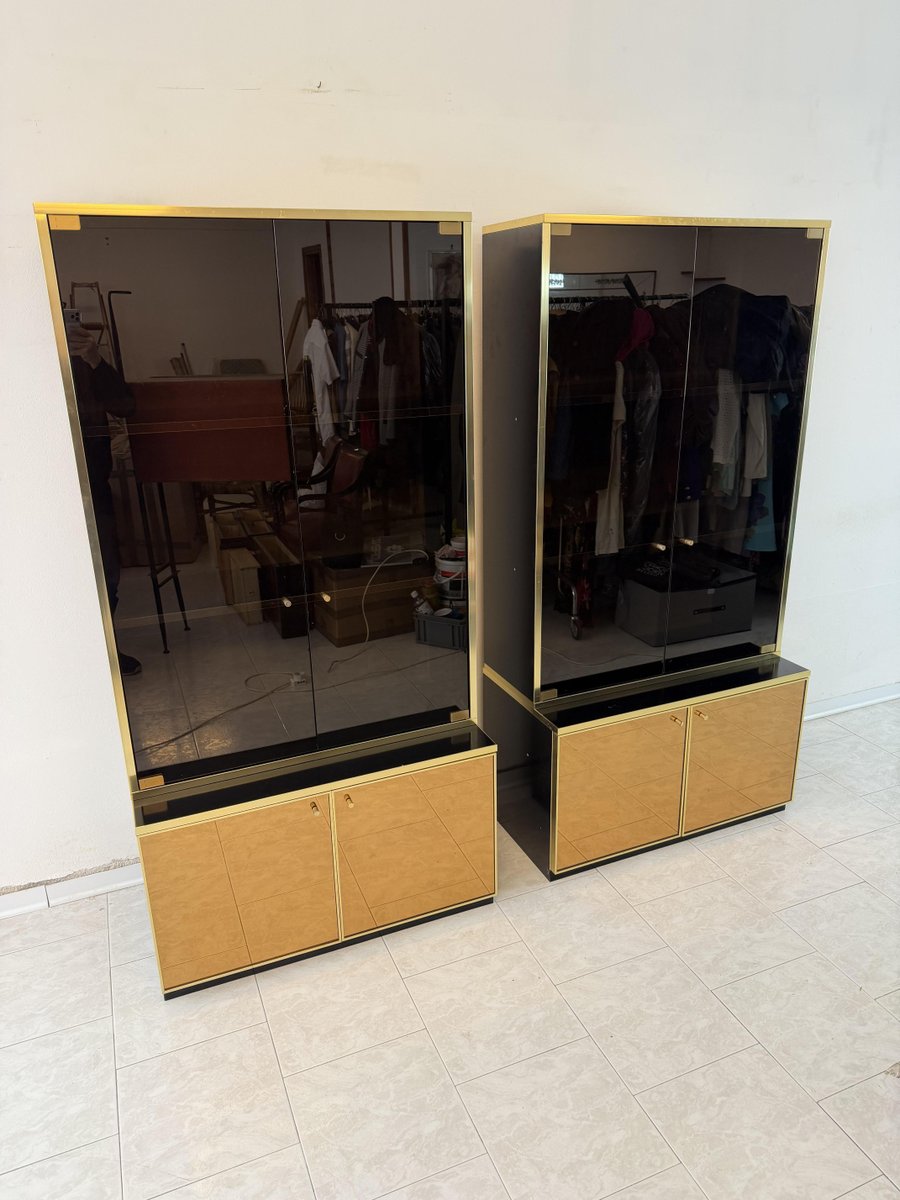 Set aus zwei Vitrinen, die Renato Zevi zugeschrieben werden, 1970, aus Messing, vergoldetem Spiegelglas und Rauchglas. Jede besteht aus zwei Teilen: Der untere Teil ist ein Schrank mit zwei Türen (Breite 90 cm, Tiefe 47 cm, Höhe 52 cm). Der obere Teil hat zwei Glastüren (Breite 90 cm, Tiefe 33 cm, Höhe 129 cm).