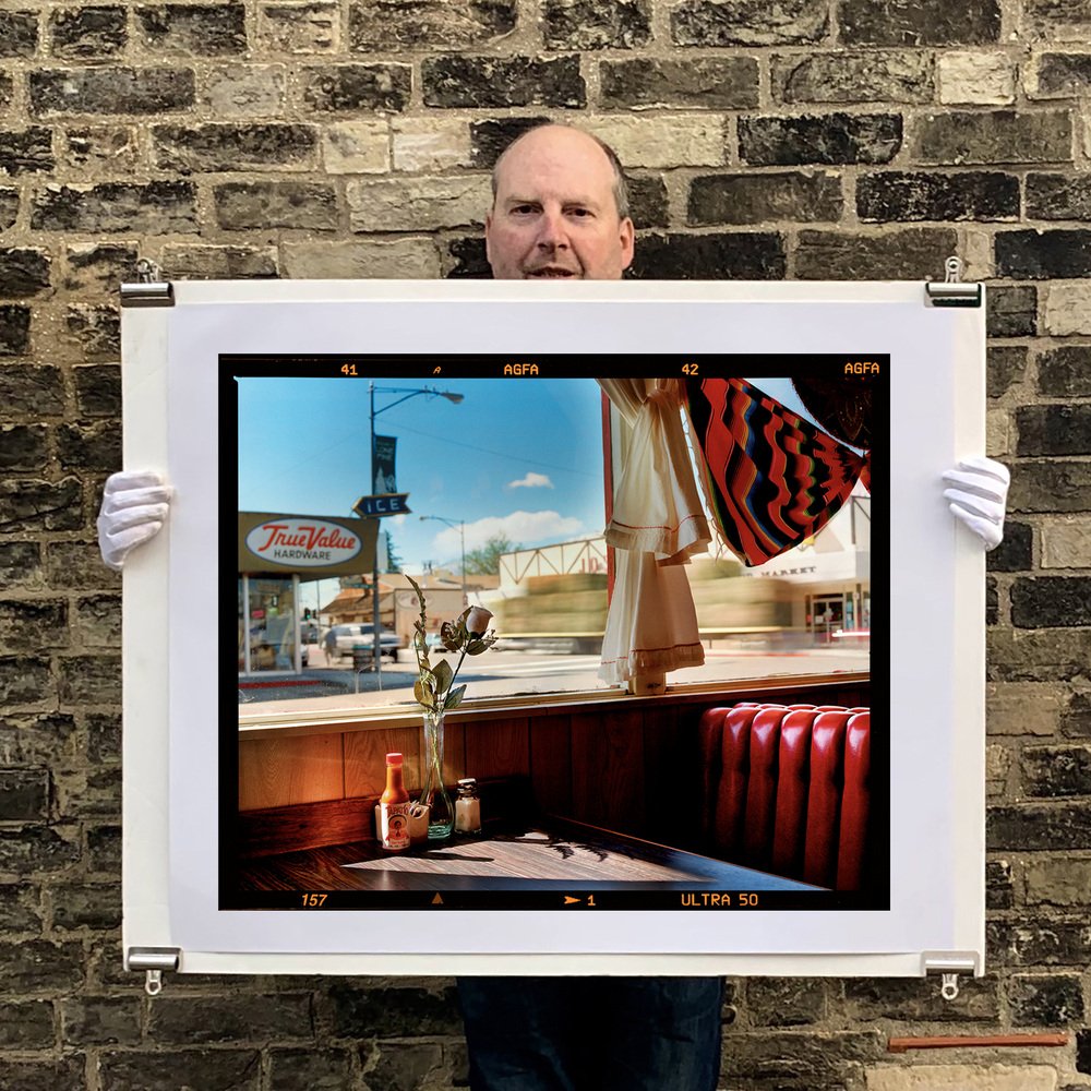 Bonanza Café, ein ikonisches Foto aus Richard Heeps Serie Dream in Colour, das als Titelbild für sein Buch Man's Ruin diente. Das Foto versetzt Sie in eine amerikanische Kleinstadt, in der die Sonne durch die Fenster auf die klassischen roten Sitze im Diner scheint. Anlässlich des zwanzigjährigen Jubiläums hat er dieses 6x7-Format mit AGFA-Ultra-Film-Rabatt veröffentlicht.