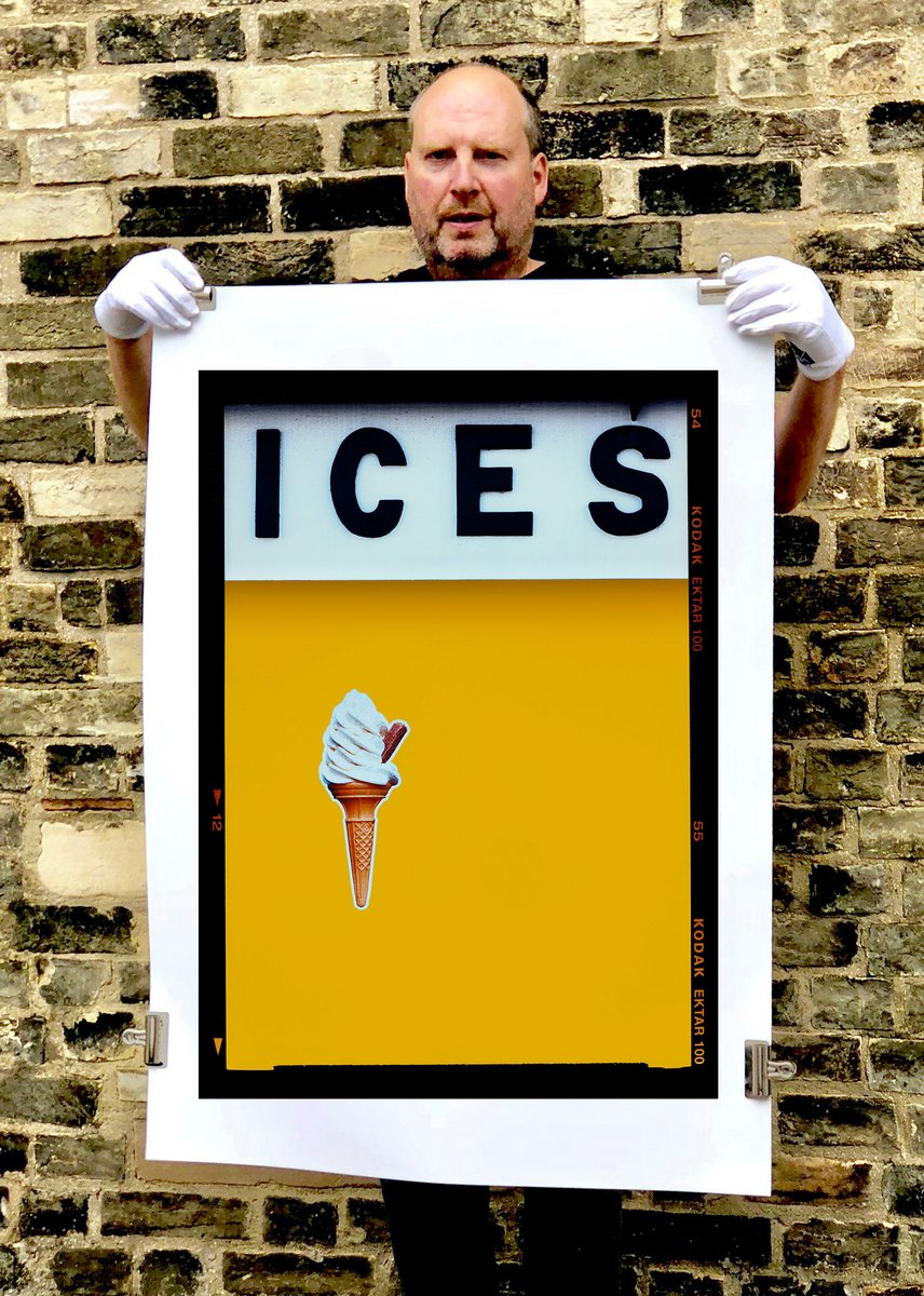 Das Kunstwerk ist eine Ode an Richards Kindheitsbesuche bei seinen Großeltern an der Küste von Sussex und erzählt die Geschichte der einfachen Freuden der britischen Küste. Die surreale Verdrehung der ikonischen Eistüte, die auf einem Farbblock in Senfgelb schwebt, hat ein konzeptionelles Kunstwerk mit kühner grafischer Typografie geschaffen.