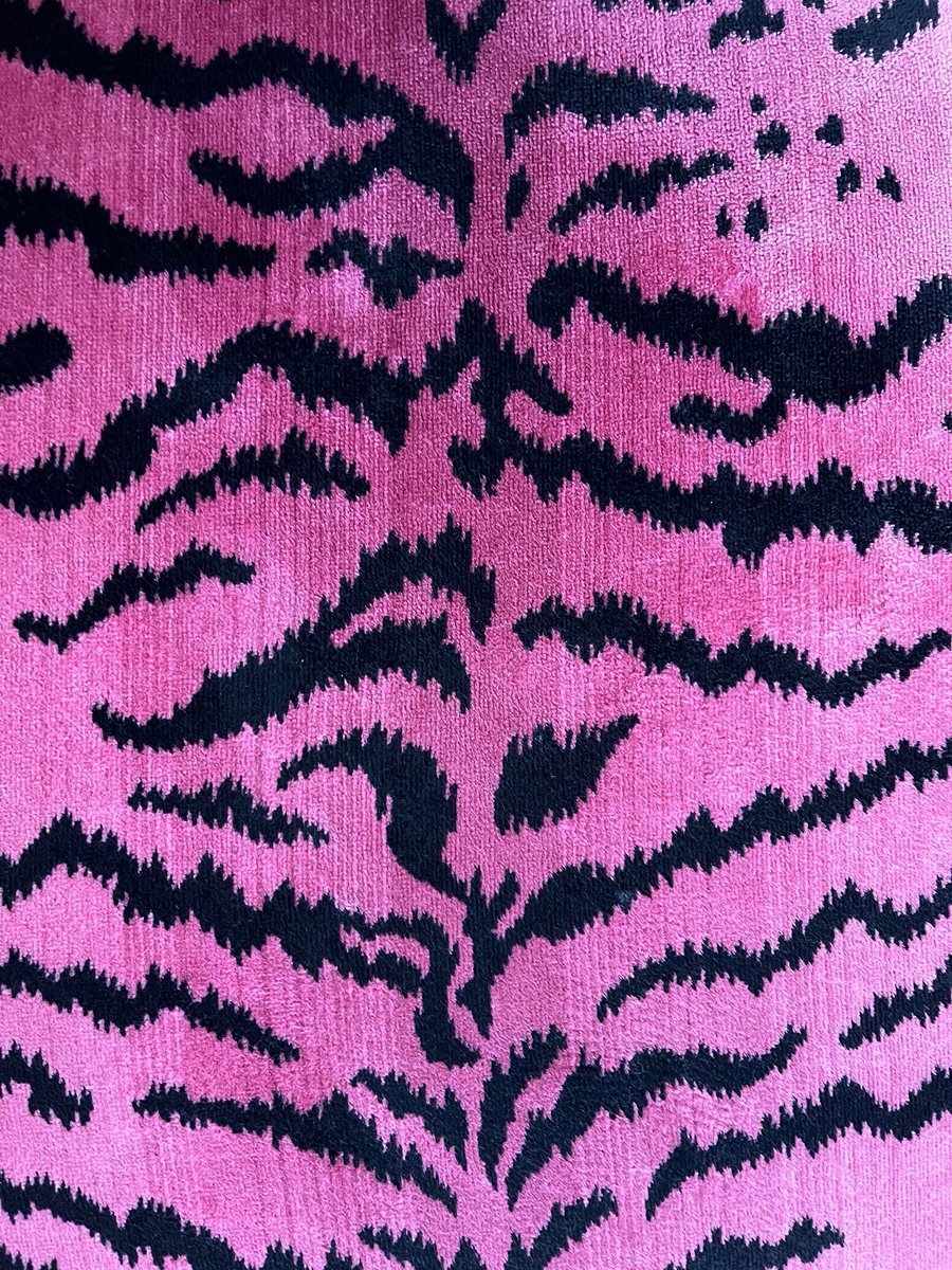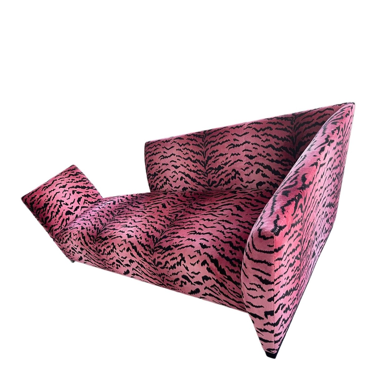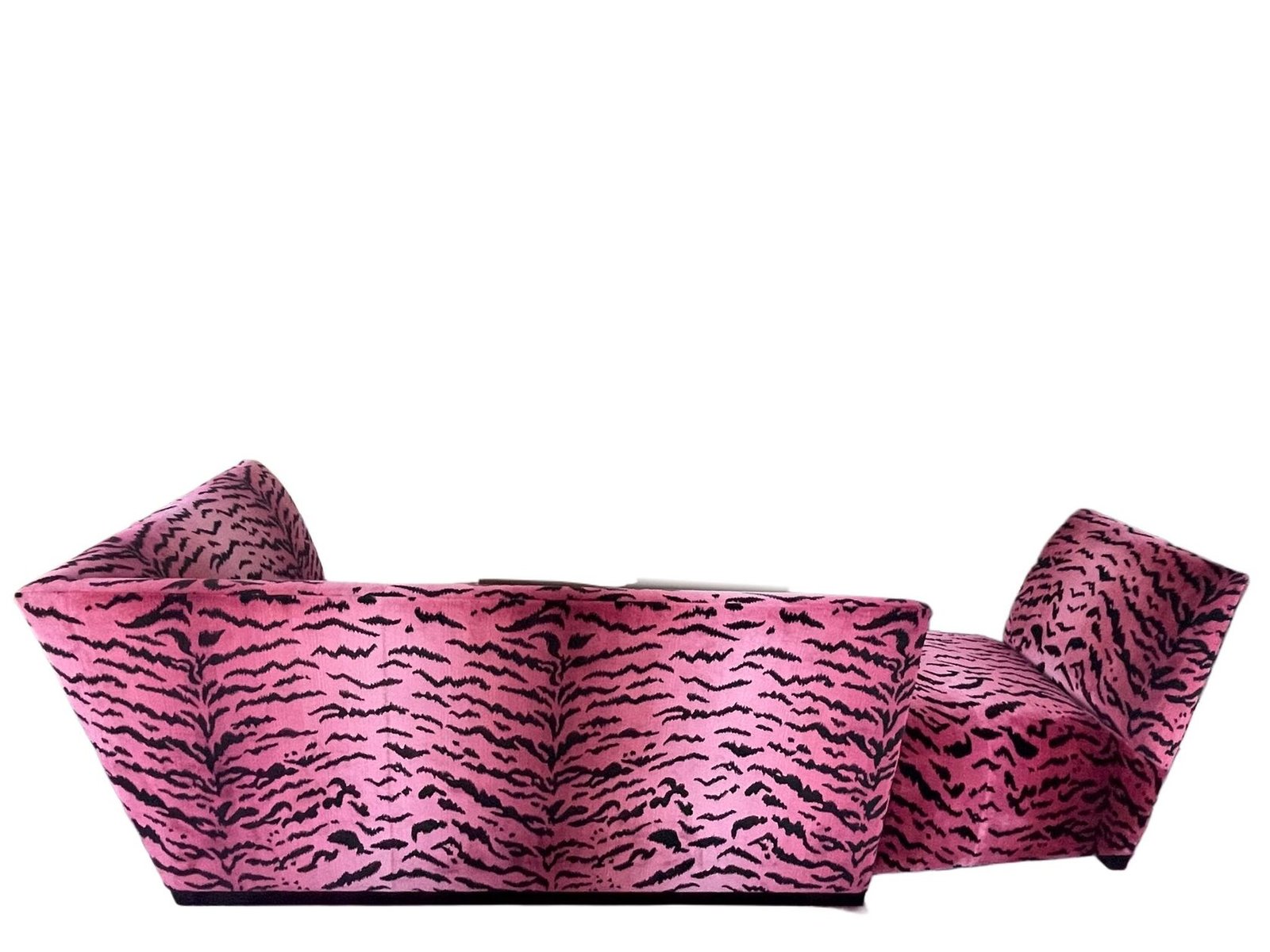 Für die Polsterung wurde der ikonische Scalamandré „Tiger”-Samt verwendet, ein historisches Textilmuster, das mit High-Fashion-Interieurs und Design auf Sammler-Niveau assoziiert wird und hier in einer kräftigen Pink- und Schwarz-Palette gehalten ist, die die grafische Präsenz des Sofas verstärkt.