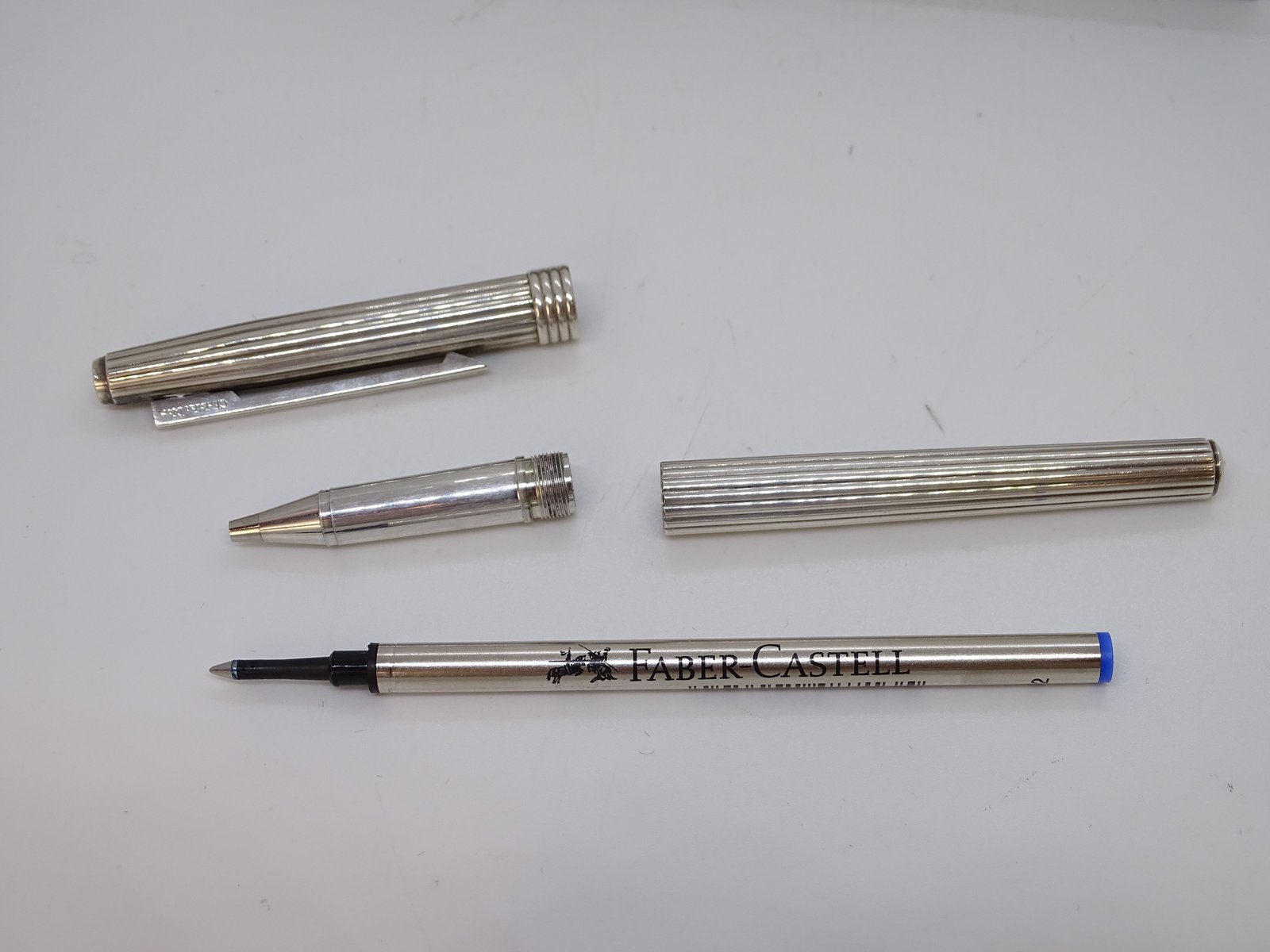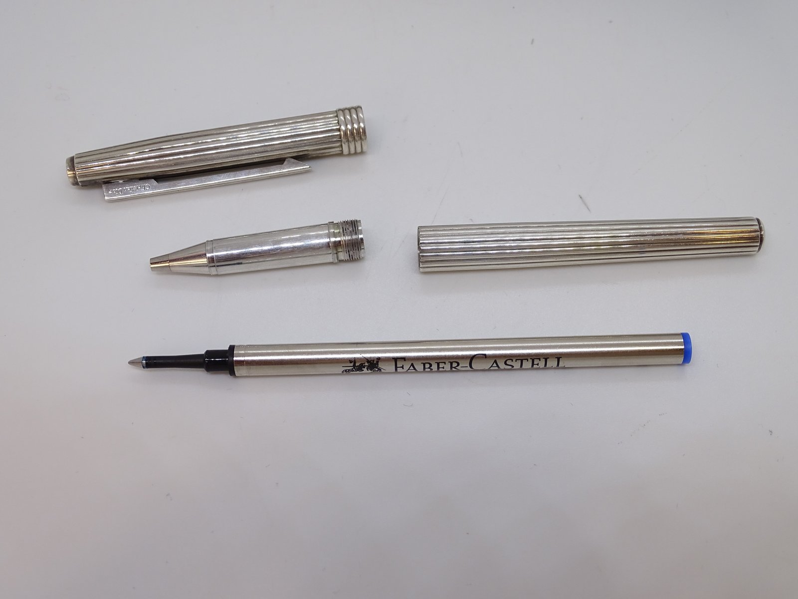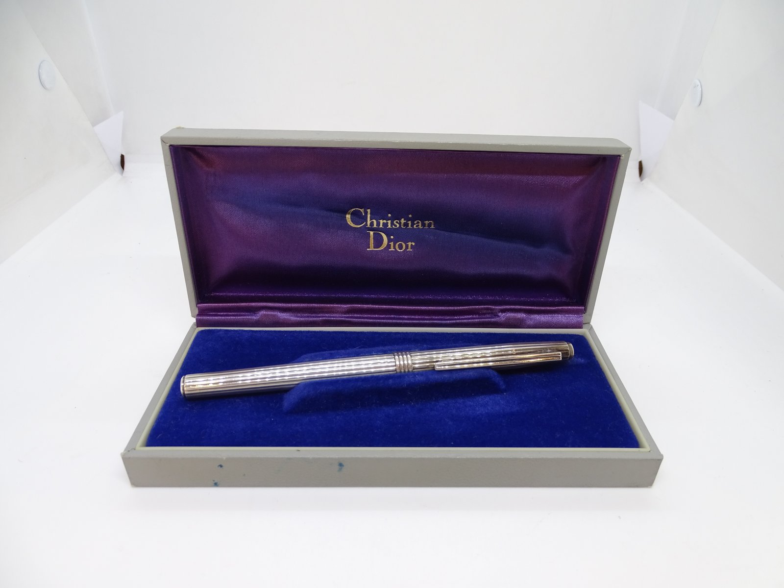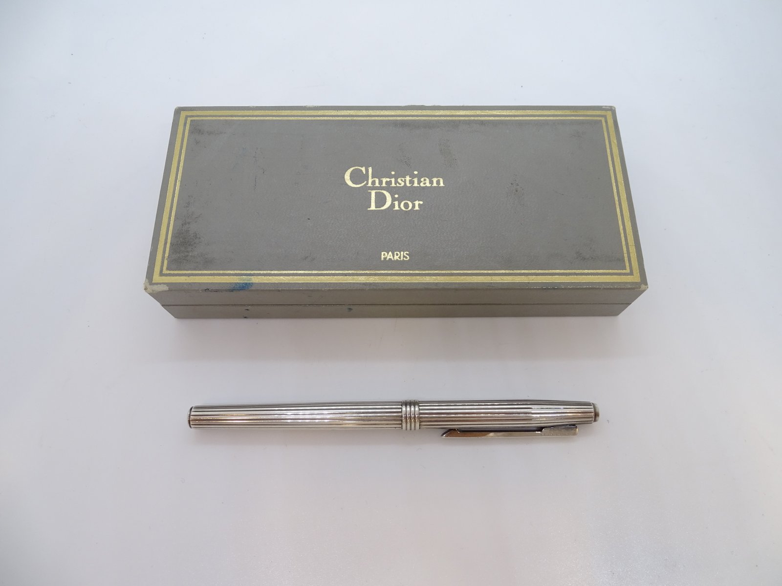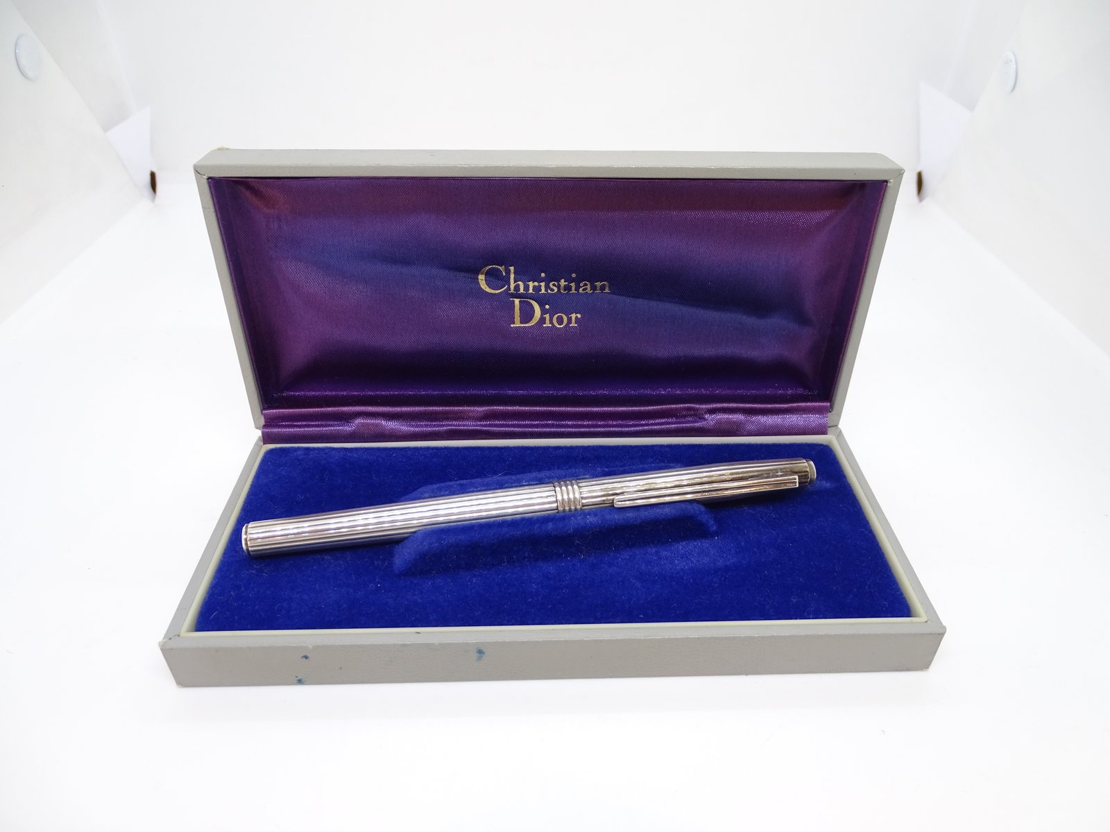 A stylish roll-on ballpoint pen from Christian Dior, made of silver-plated metal, with a cylindrical body and cap decorated with regular longitudinal grooves, a common feature in 20th-century luxury writing instruments due to its balance between formal restraint and material refinement. The clip and band have a functional, grooved design. The inside of the clip is engraved with "Swiss made," indicating that it was manufactured in Switzerland.
