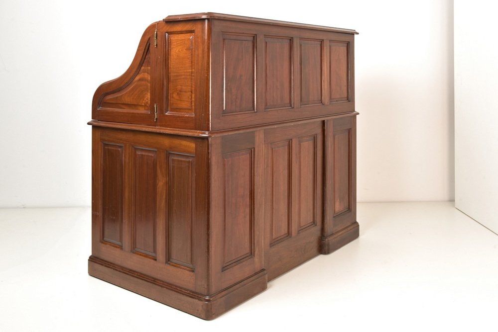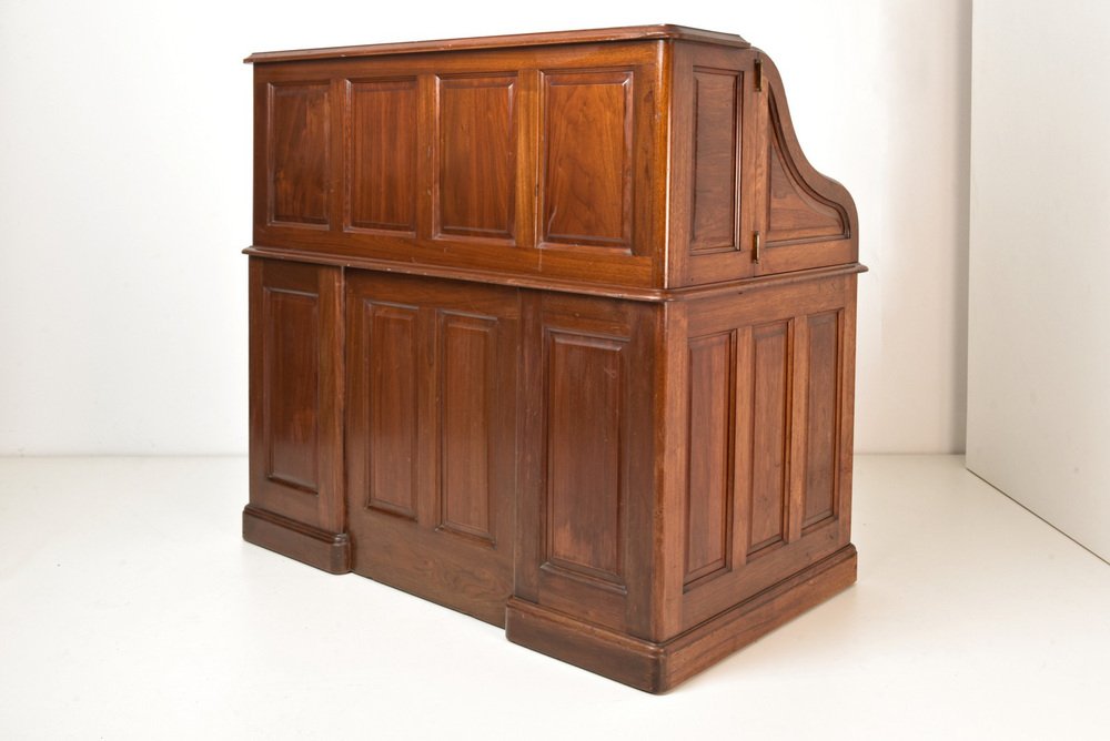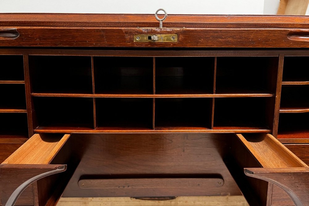 We are offering this magnificent "ROLL TOP DESK" USA from around 1910 from the estate of an art collector with an affinity for design. The name comes from the blind which, when closed, closes off the entire desk. The whole piece of furniture is solidly made in wonderful "American Walnut". The piece of furniture has been preserved in very good, original condition, it can be placed freely due to the production process, the outsides have the fine cassettes everywhere. The writing furniture was designed as a mobile, full-fledged workplace, the original, ball-bearing mounted castors in iron are still mounted under the boxes and allow the office to be easily mobile. Under the blind there are paper and pen holders, compartments for papers of different formats, a felt-covered worktop. In order to enlarge the worktop, the side panels of the blind guide can be folded down with finely crafted hinges. Overall, the materiality, functionality and workmanship of this professional piece of writing furniture is impressive.