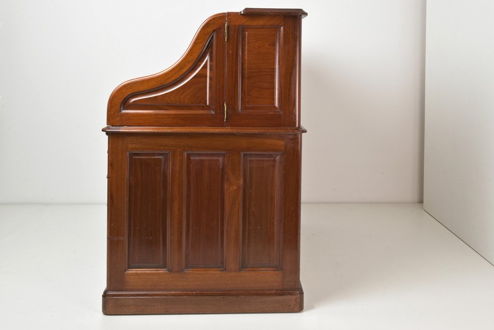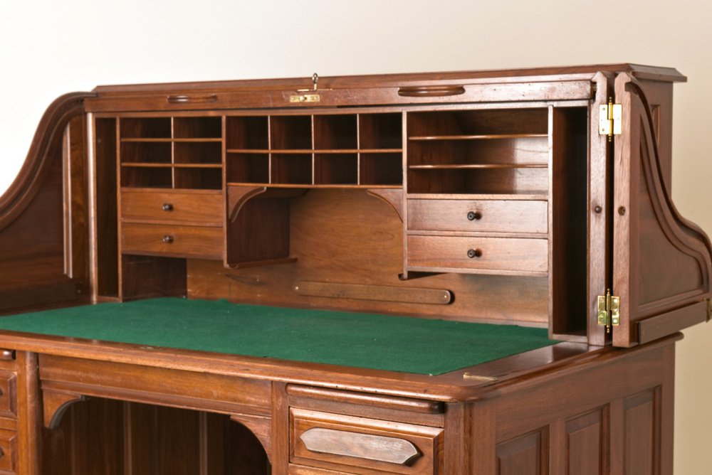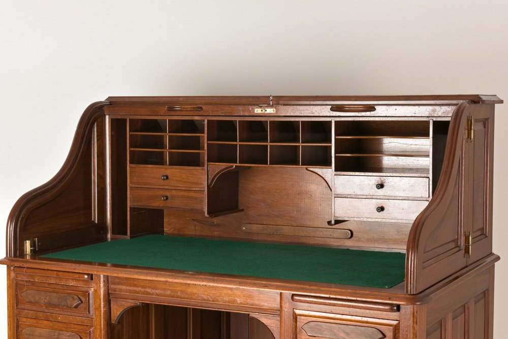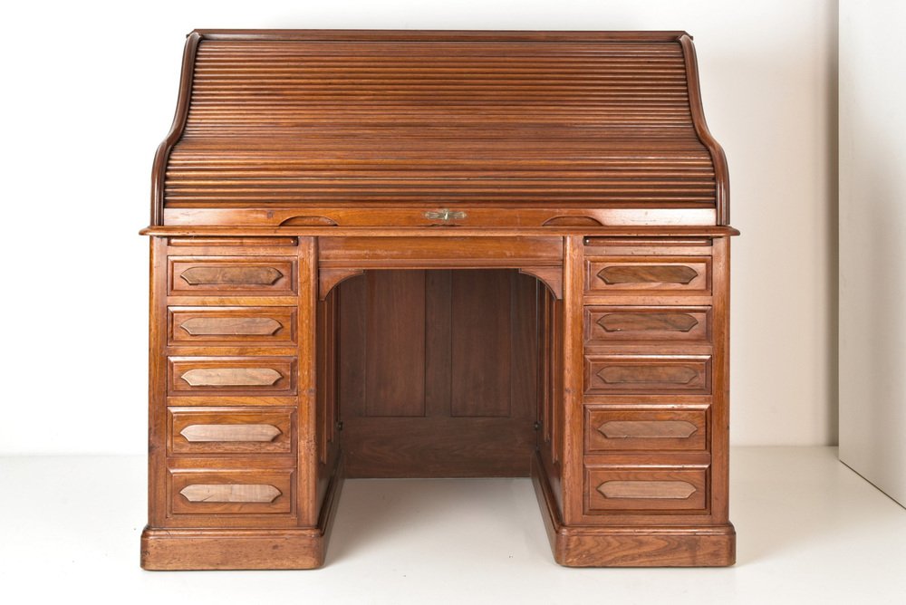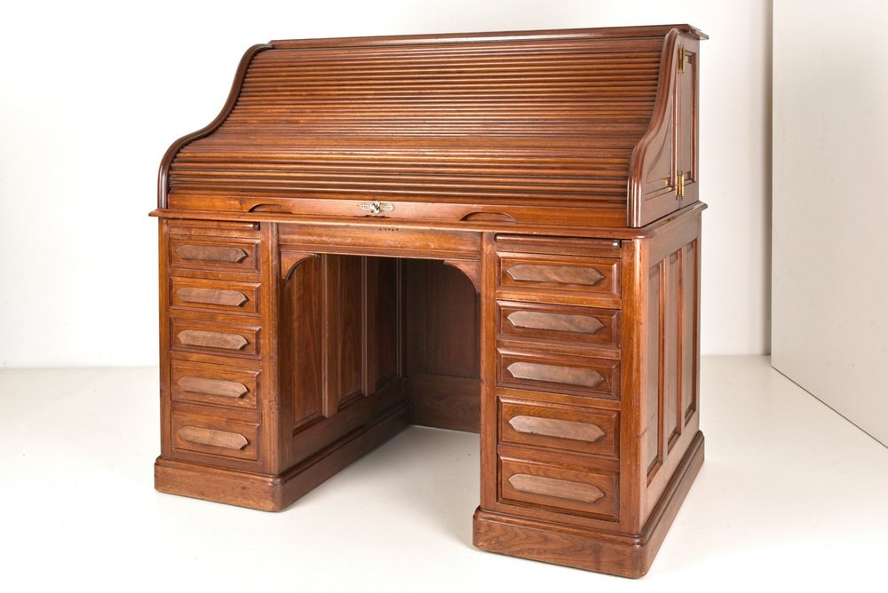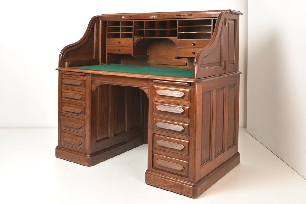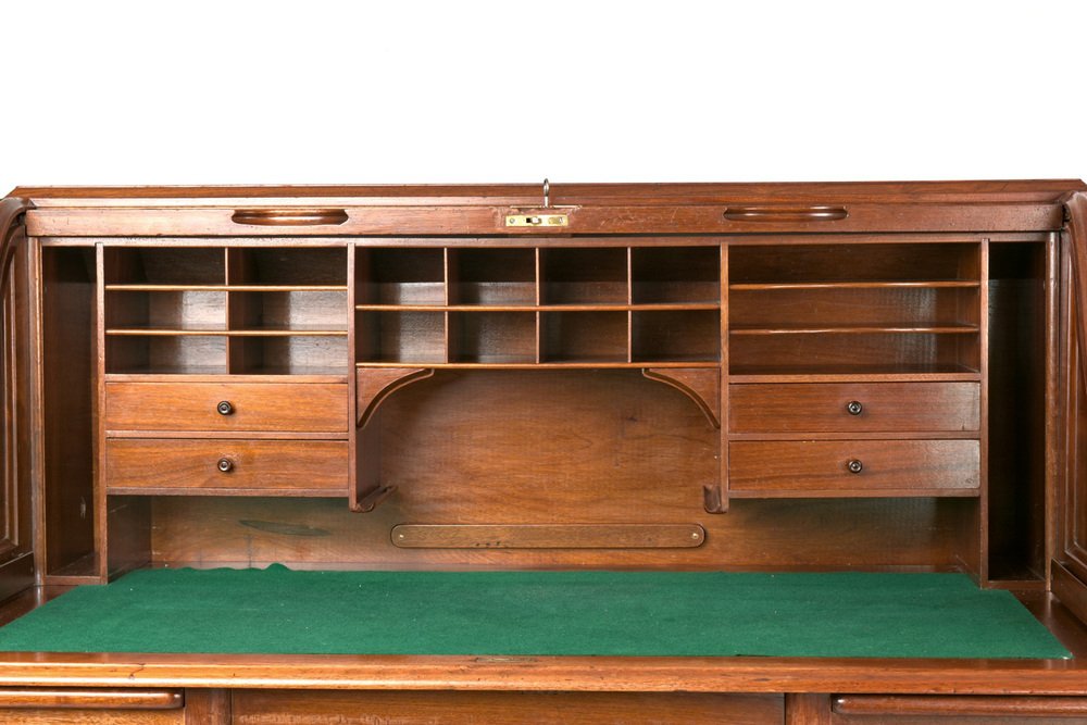 Desk - Rolltop Desk Designer: unknown Year: around 1910 Manufacturer: unknown Country: U.S.A. Measurements: H 78 cm/128 cm W 137 cm D 85 cm Material: Solid walnut, reddish stained and clear lacquered. Fittings brass with protective coating. Condition: good original condition Special Remarks: few signs of wear. One of the first pieces of writing furniture to be manufactured entirely by hand in small batches. Probably made in the USA for the English market. The central lock on the roller shutter is marked "YALE", the American manufacturer of patent locks. The furniture can be easily dismantled.