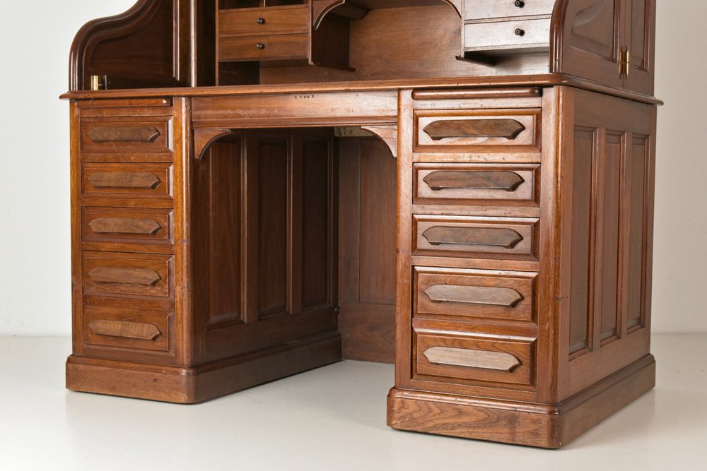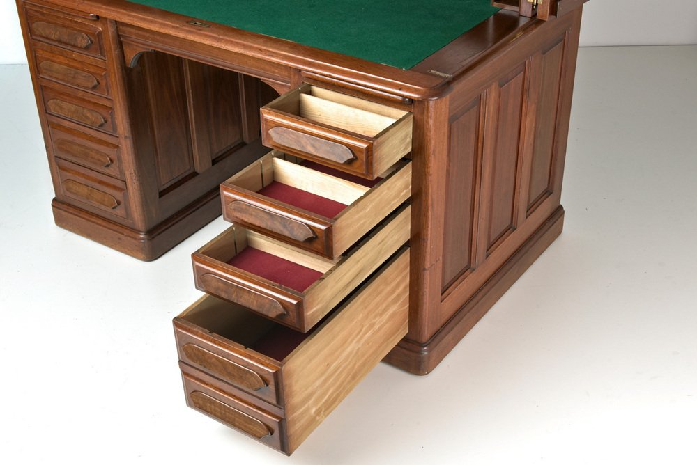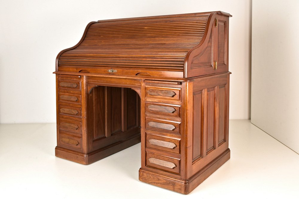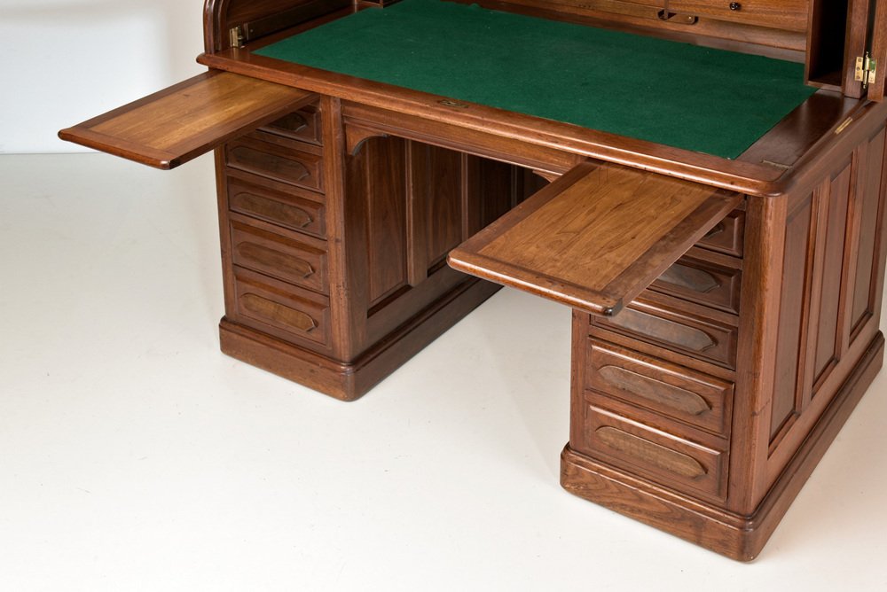 Wir bieten diesen prächtigen „ROLL TOP DESK” USA aus der Zeit um 1910 aus dem Nachlass eines Kunstsammlers mit einer Vorliebe für Design an. Der Name kommt von der Jalousie, die im geschlossenen Zustand den gesamten Schreibtisch abschließt. Das gesamte Möbelstück ist solide aus wunderschönem „American Walnut” gefertigt. Das Möbelstück ist in sehr gutem Originalzustand erhalten, es kann aufgrund des Herstellungsverfahrens frei aufgestellt werden, die Außenseiten weisen überall die feinen Kassetten auf. Das Schreibmöbel wurde als mobiler, vollwertiger Arbeitsplatz konzipiert, die originalen, kugelgelagerten Rollen aus Eisen sind noch unter den Kästen montiert und ermöglichen eine leichte Mobilität des Büros. Unter der Jalousie befinden sich Papier- und Stifthalter, Fächer für Papiere unterschiedlicher Formate und eine mit Filz bezogene Arbeitsfläche. Um die Arbeitsfläche zu vergrößern, können die Seitenteile der Jalousieführung mit fein gearbeiteten Scharnieren heruntergeklappt werden. Insgesamt beeindrucken Materialität, Funktionalität und Verarbeitung dieses professionellen Schreibmöbels.