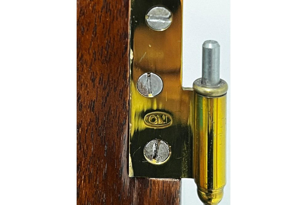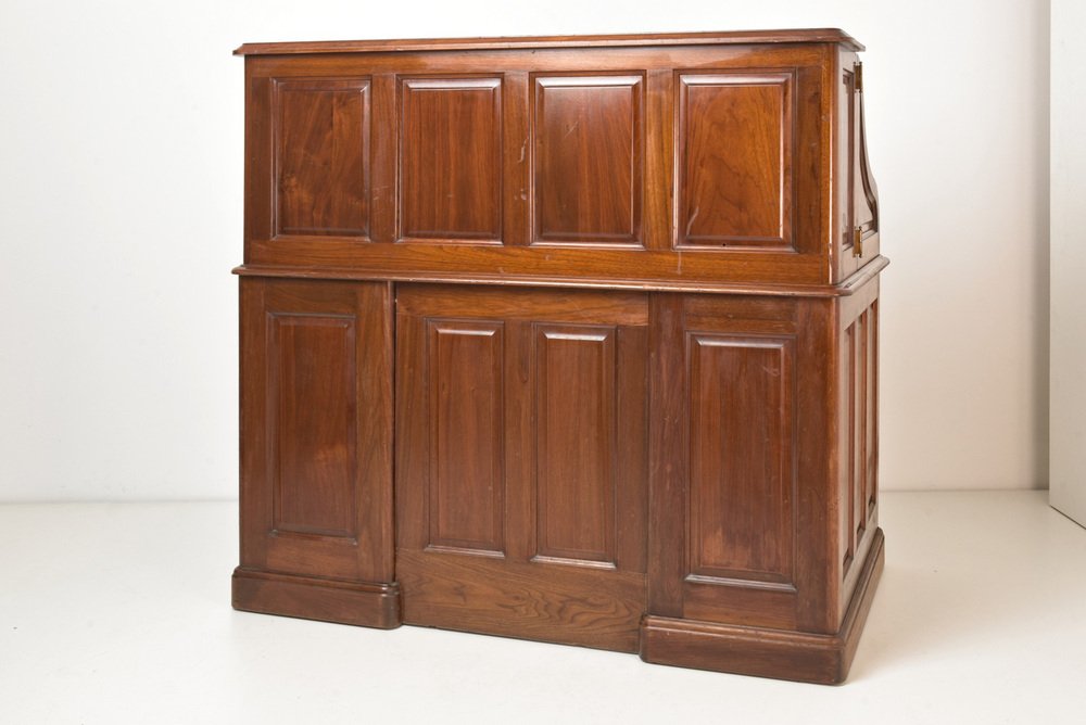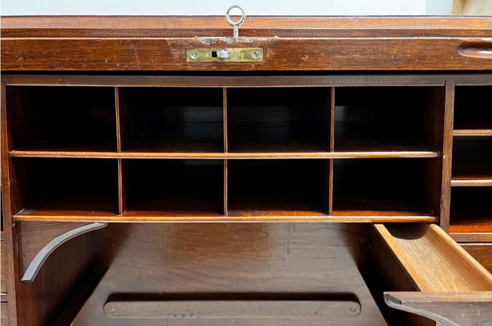 Schreibtisch – Rollschreibtisch Designer: unbekannt Jahr: um 1910 Hersteller: unbekannt Land: USA Maße: H 78 cm/128 cm B 137 cm T 85 cm Material: Massives Walnussholz, rötlich gebeizt und klar lackiert. Beschläge aus Messing mit Schutzbeschichtung. Zustand: guter Originalzustand Besondere Anmerkungen: wenige Gebrauchsspuren. Eines der ersten Schreibmöbel, das vollständig in Handarbeit in kleinen Stückzahlen hergestellt wurde. Wahrscheinlich in den USA für den englischen Markt gefertigt. Das zentrale Schloss am Rolladen trägt die Aufschrift „YALE“, dem amerikanischen Hersteller von Patent-Schlössern. Das Möbelstück lässt sich leicht zerlegen.