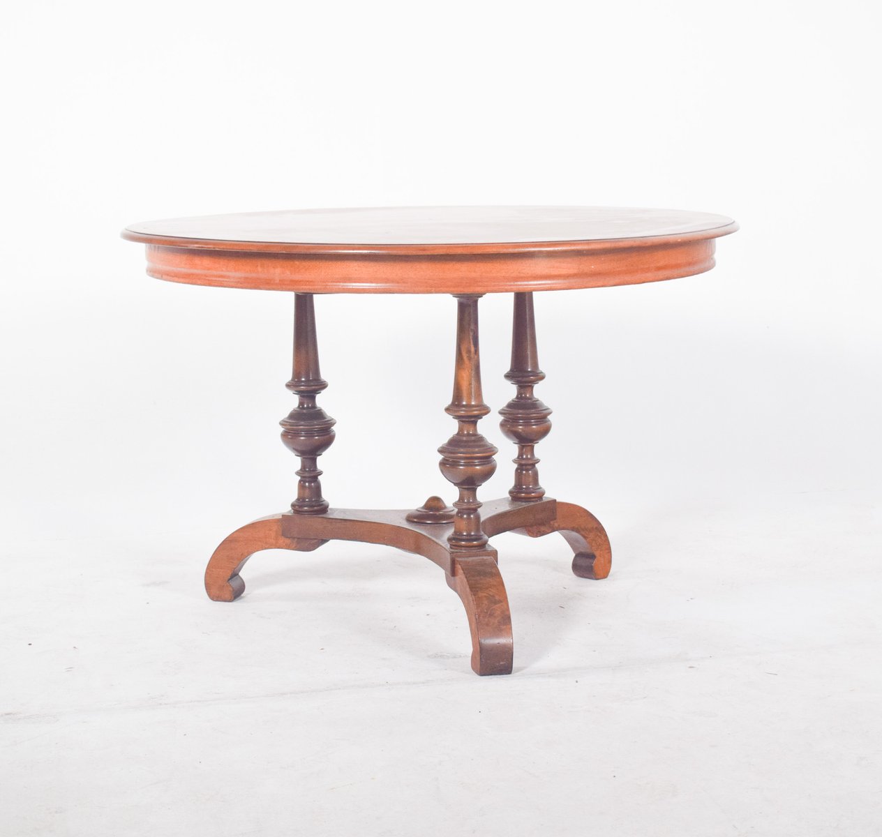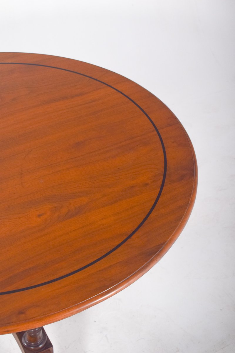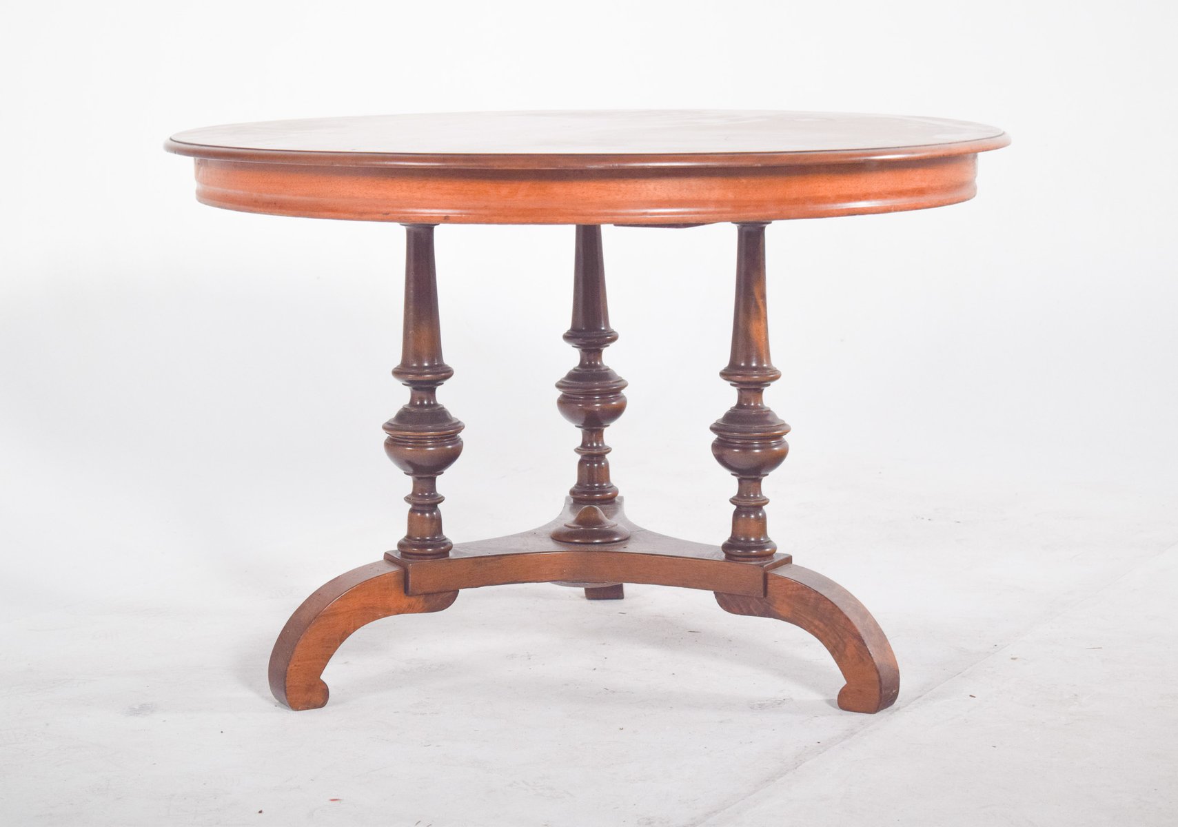 Runder Teetisch aus Nussbaumholz. Die halbkreisförmige Rückenlehne besteht aus ineinandergreifenden vertikalen Stäben, die ein elegantes und luftiges optisches Muster bilden. Die Sitzfläche folgt demselben Muster und bietet Komfort und Flexibilität. Die leicht abfallenden Beine werden durch gebogene Querstreben verstärkt, die sich an der Basis kreuzen und für zusätzliche Stabilität sorgen. Das Geflecht hat eine natürliche, gealterte Farbe, mit sichtbaren Spuren der Zeit, einschließlich einiger Abnutzungsstellen und loser Fäden, insbesondere an den Beinen.