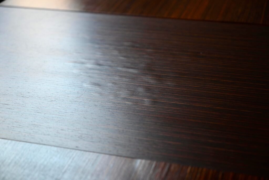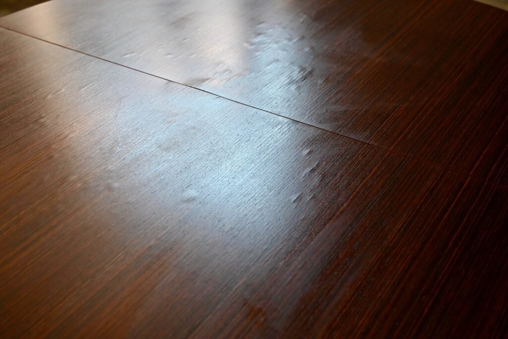 der Tisch hat einen Durchmesser von 120 cm (164 cm mit geöffneten Verlängerungen) und eine Höhe von 75 cm.
