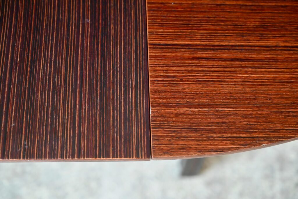The table is old and dates from the 70s. It is made of rosewood and rosewood veneer. Its particular base is made of solid wood, removable. The round top has a nicely beveled edge. Italian extensions are integrated under the top. The table is in good condition, however swelling in the veneer is visible, particularly in raking light, as visible in the photo.