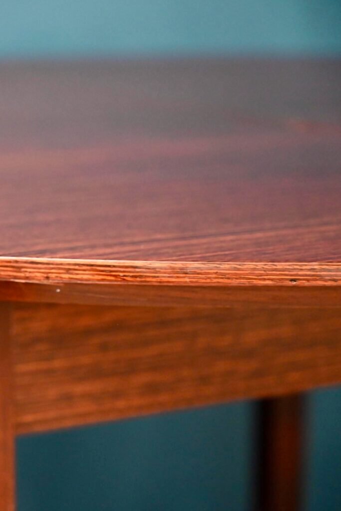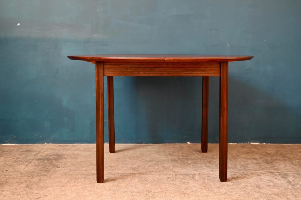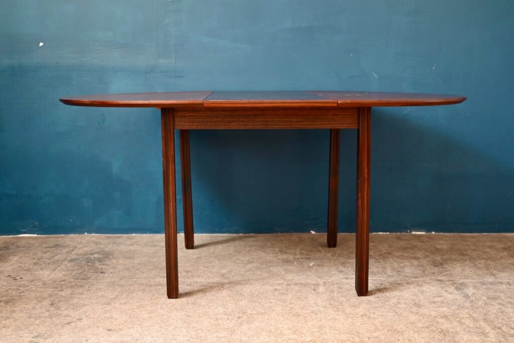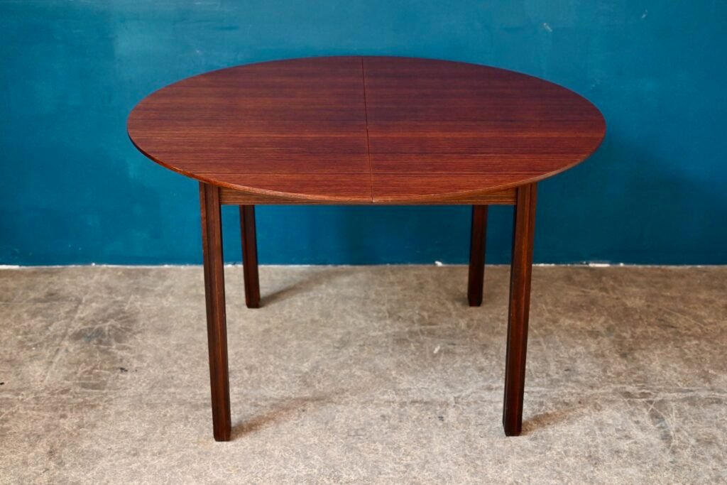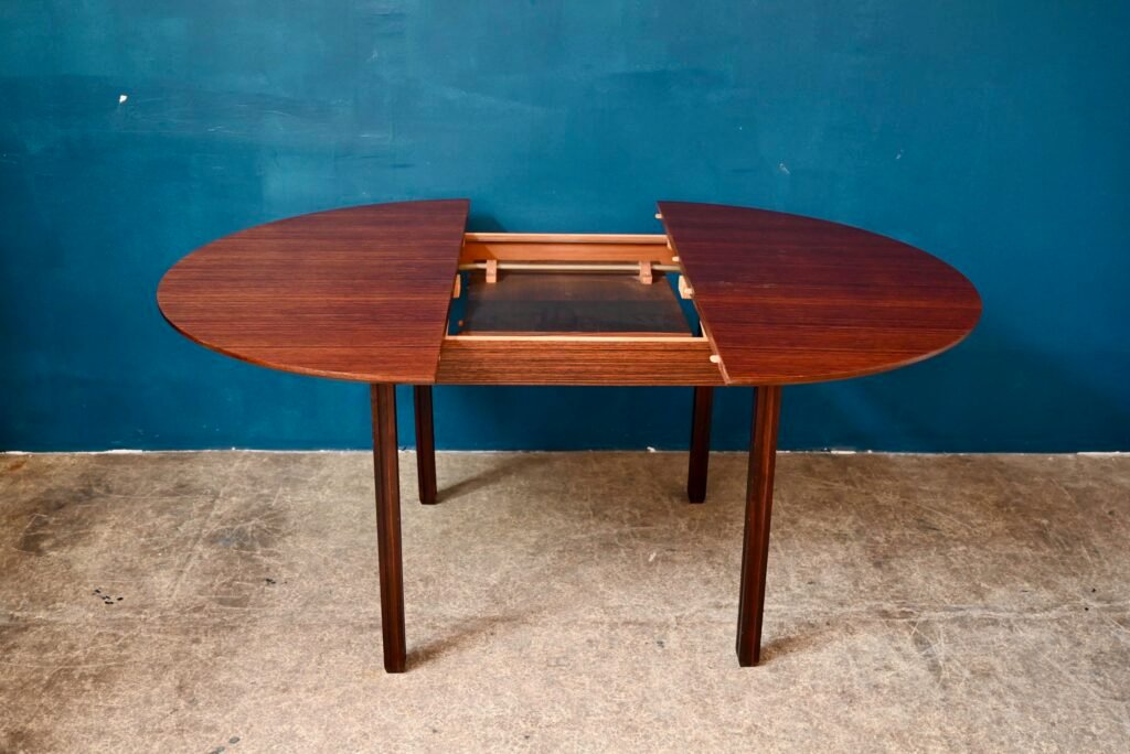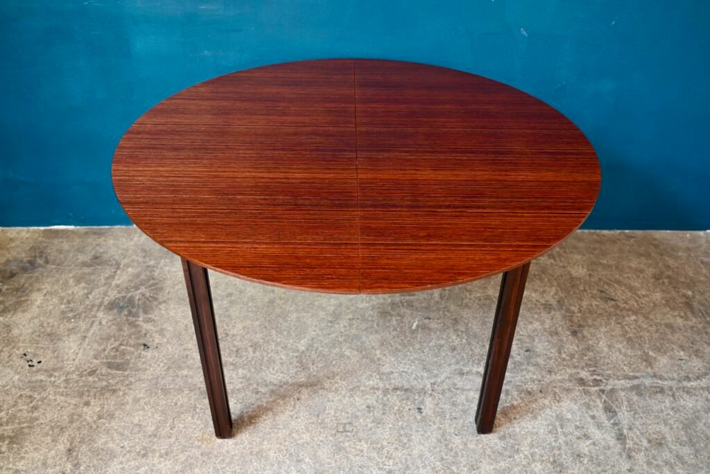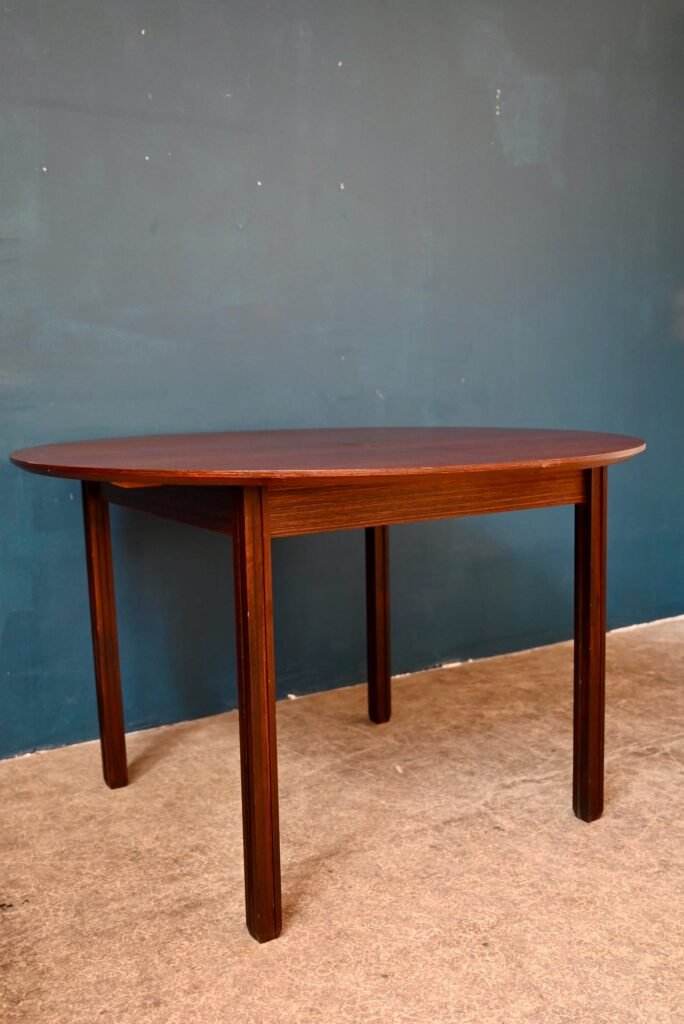 Der Tisch ist alt und stammt aus den 70er Jahren. Er ist aus Palisanderholz und Palisanderfurnier gefertigt. Sein besonderer Sockel ist aus Massivholz, abnehmbar. Die runde Platte hat eine schön abgeschrägte Kante. Unter der Platte sind italienische Verlängerungen integriert. Der Tisch ist in gutem Zustand, allerdings ist eine Schwellung im Furnier sichtbar, besonders bei Streiflicht, wie auf dem Foto zu sehen.