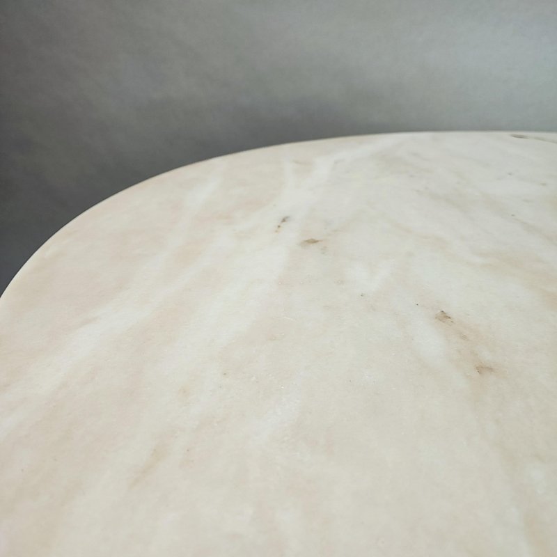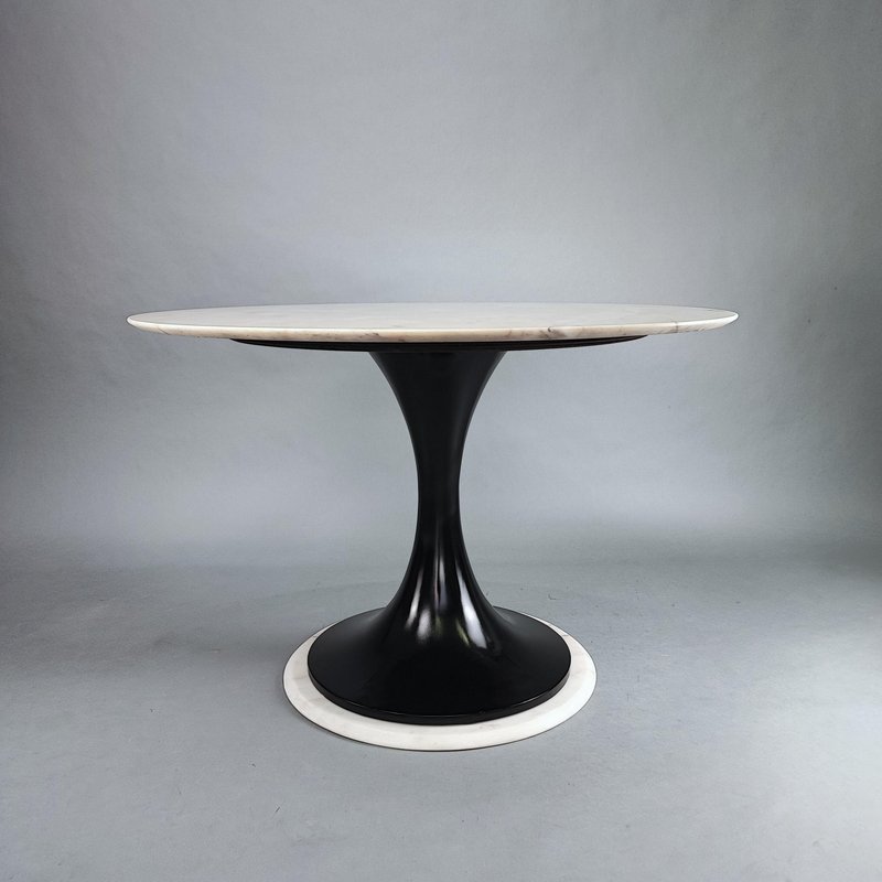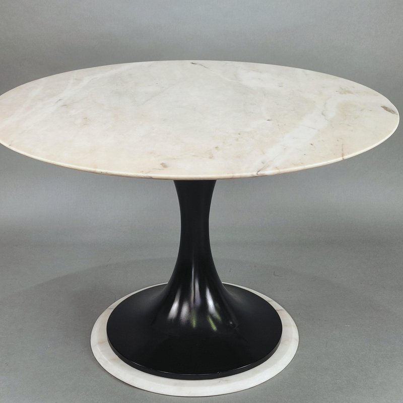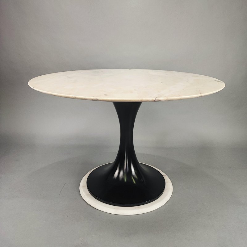 Round table with marble top, Italian design, 1960s. Base and top in pink marble, central hourglass leg in black lacquered wood. Restored, perfect vintage condition. No chips or major scratches on the marble or base. Design period: 1960-1969 Country of manufacture: Italy Style: Space Age, Italian design Material: marble, wood Color: black, white, pink Condition: excellent Measurements: Diameter 109 cm Height 76 cm