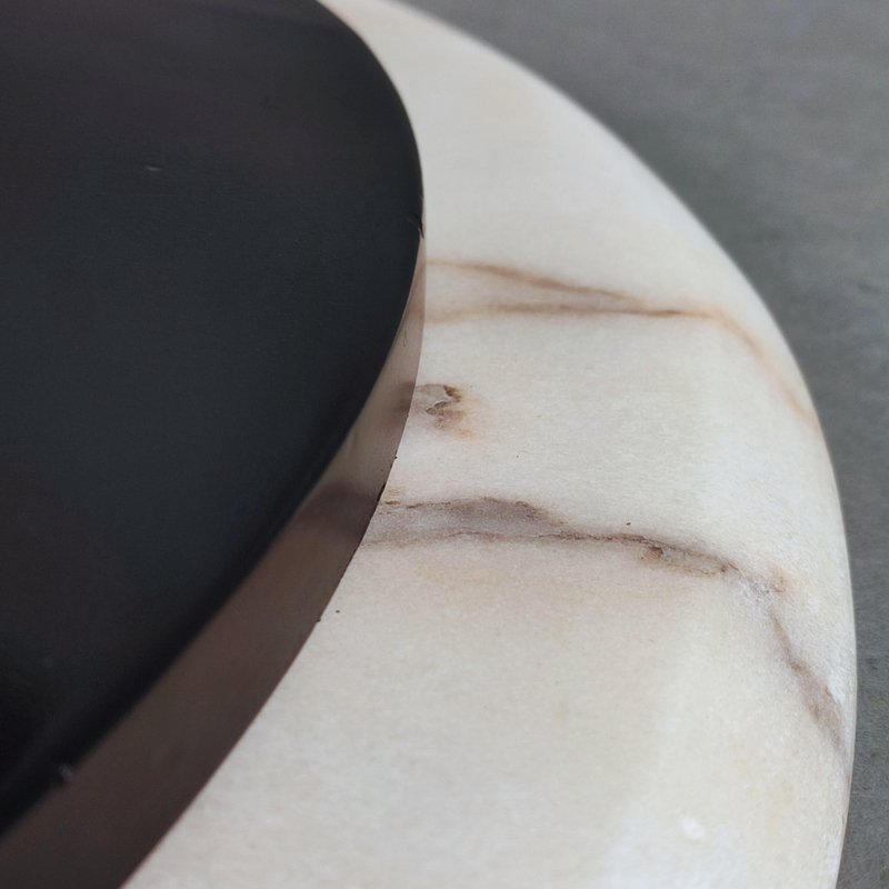 Runder Tisch mit Marmorplatte, italienisches Design, 1960er Jahre. Sockel und Platte aus rosa Marmor, zentrales Sanduhrbein aus schwarz lackiertem Holz. Restauriert, perfekter Vintage-Zustand. Keine Absplitterungen oder größeren Kratzer auf dem Marmor oder der Basis. Design-Zeitraum: 1960-1969 Herstellungsland: Italien Stil: Space Age, italienisches Design Material: Marmor, Holz Farbe: schwarz, weiß, rosa Zustand: ausgezeichnet Maße: Durchmesser 109 cm Höhe 76 cm