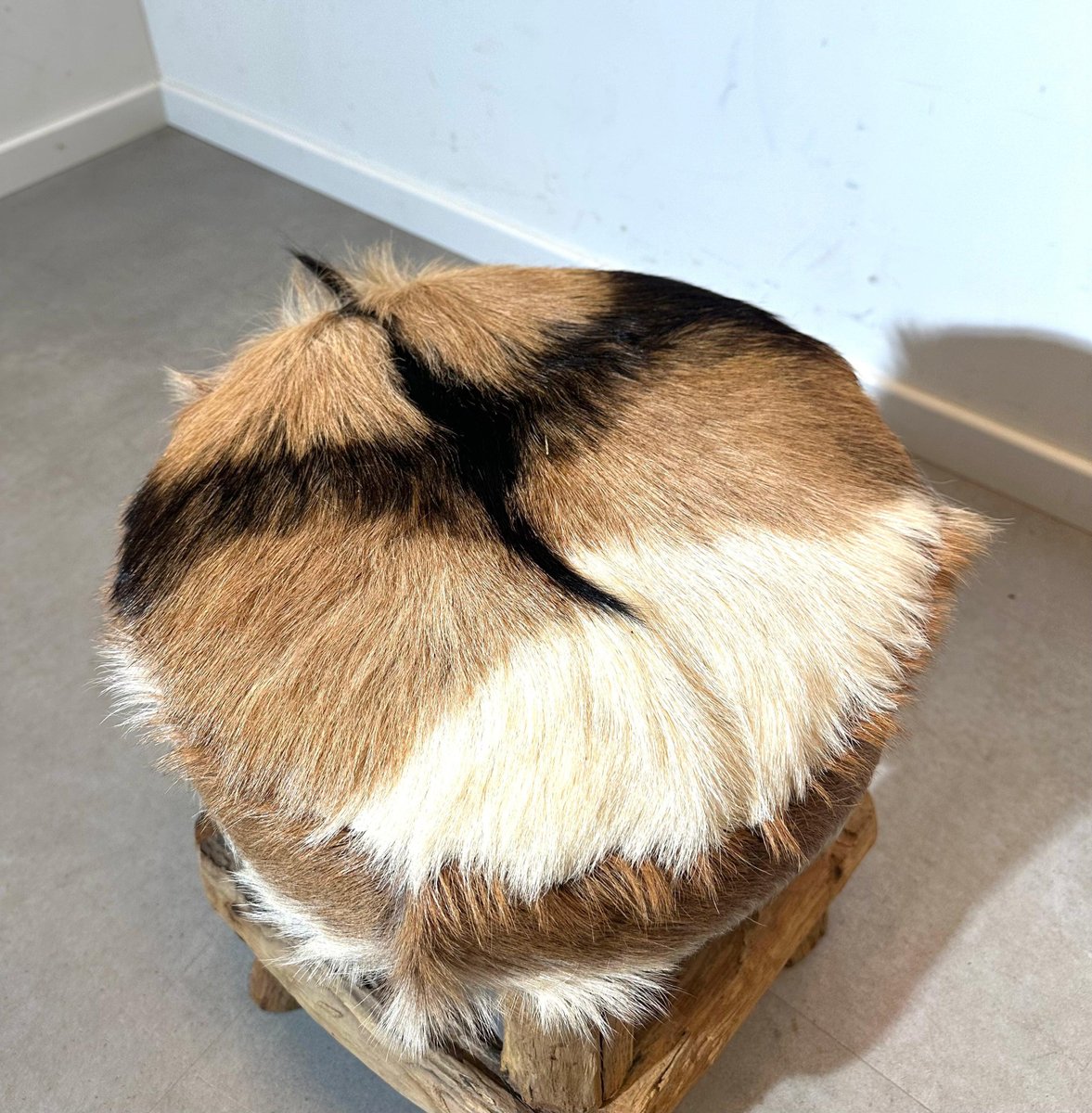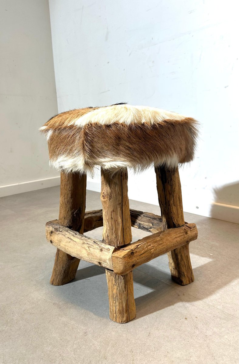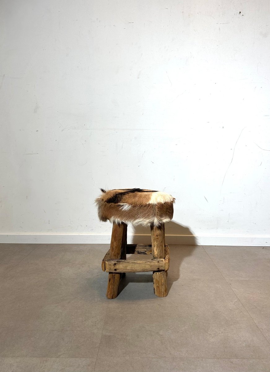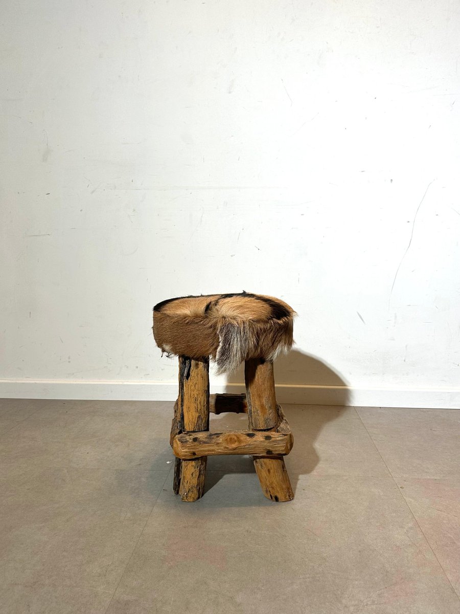 Unique rustic stool handcrafted from solid natural wood with a genuine cowhide seat. The combination of weathered timber and soft hide gives this piece a warm, organic character. Each stool is one of a kind, with individual wood grain and hide pattern variations that add authenticity and charm. Perfect as a side stool, plant stand, or decorative accent in a rustic, chalet, or bohemian interior.