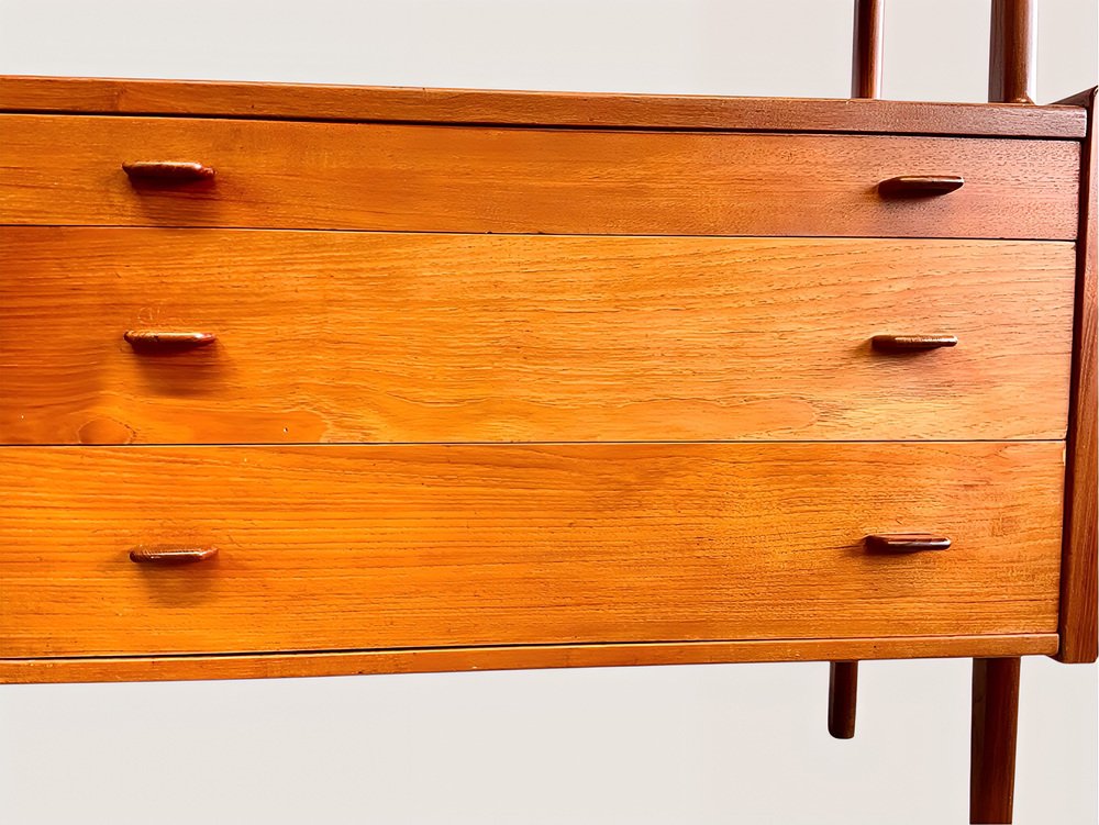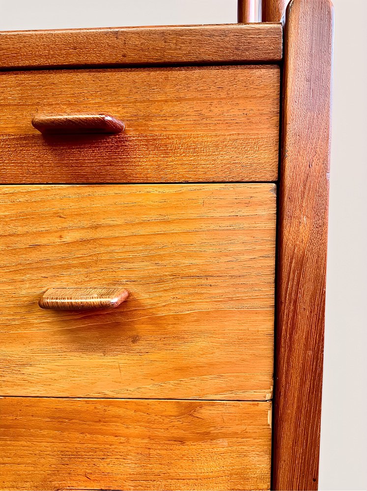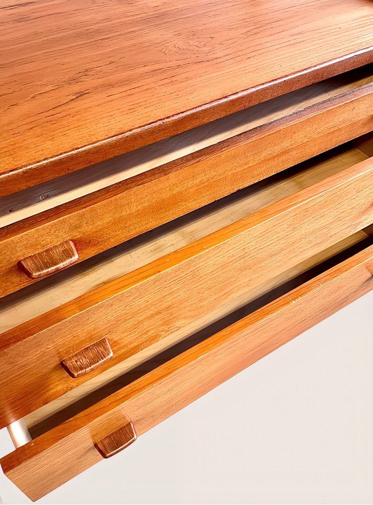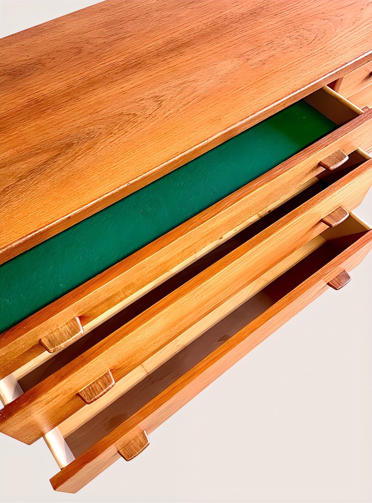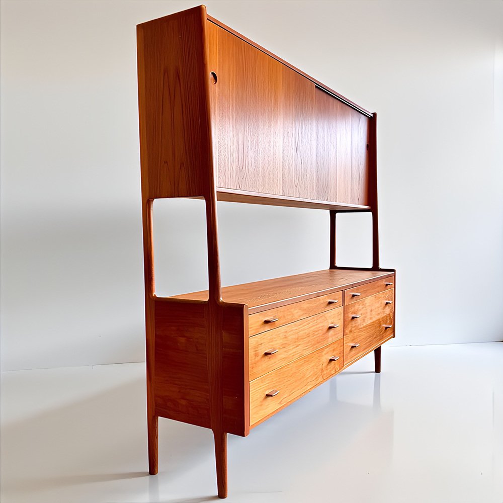 * The sideboard features six spacious drawers with elegant teak handles in the lower section.