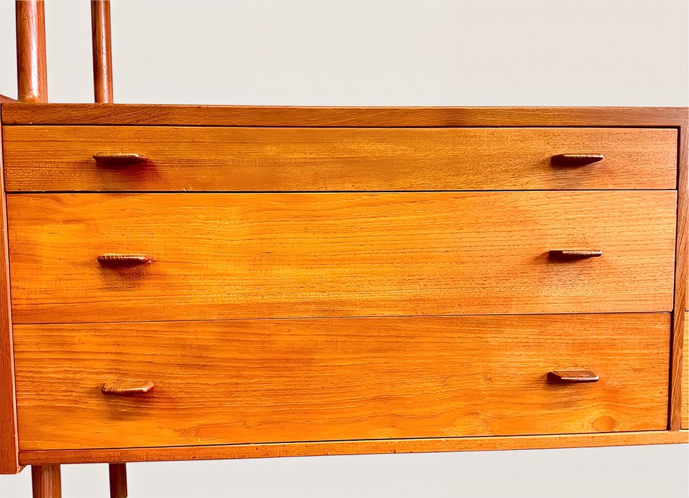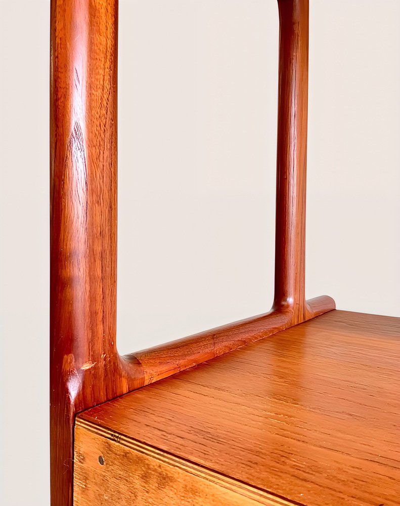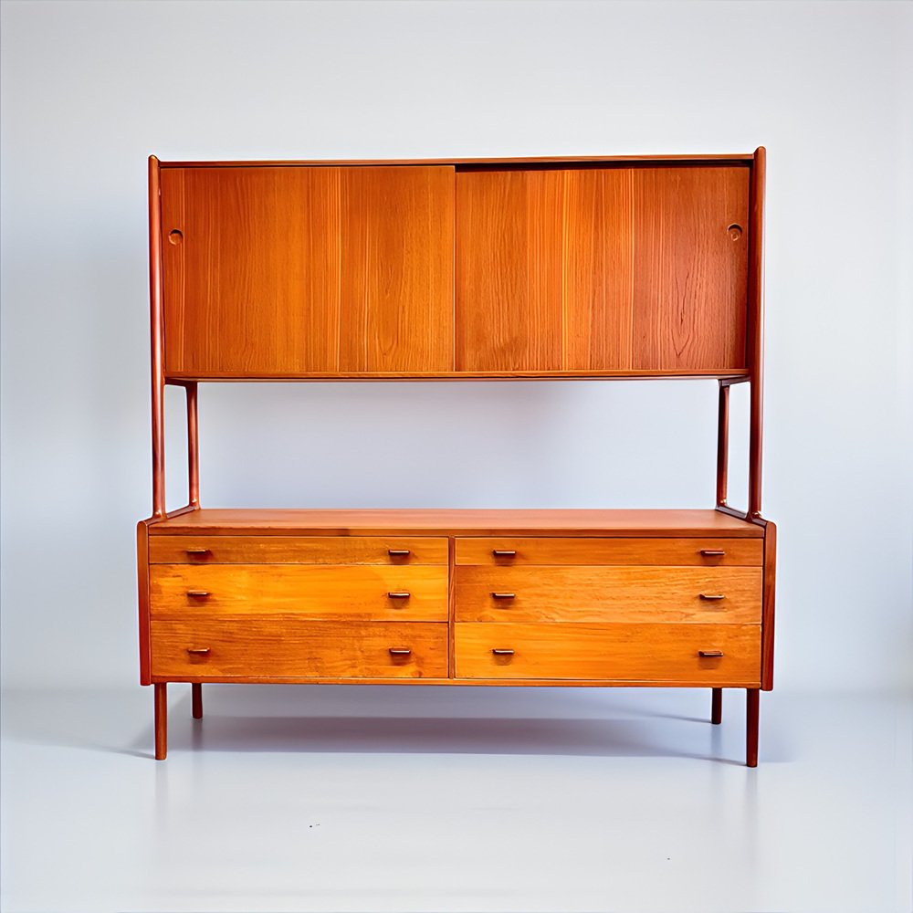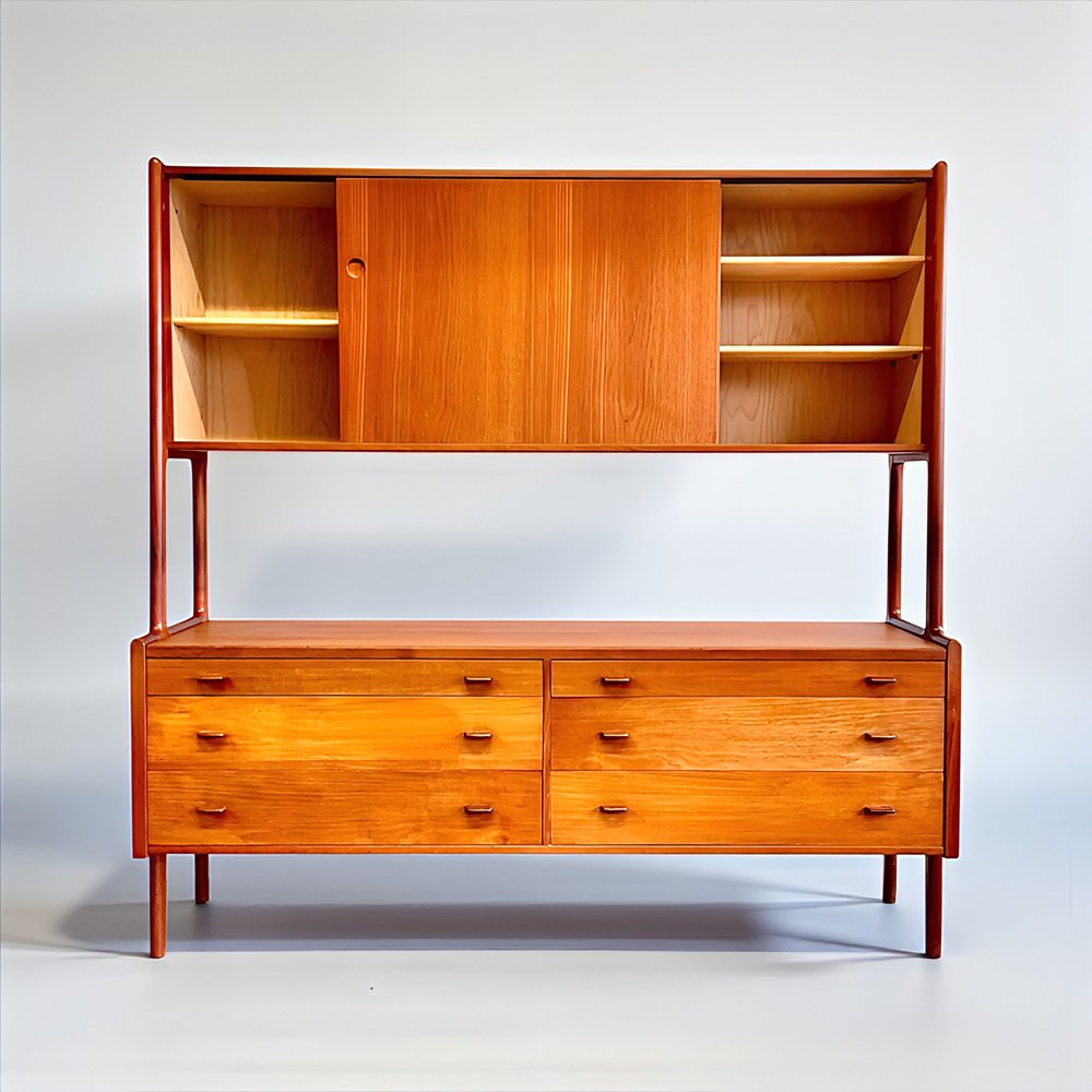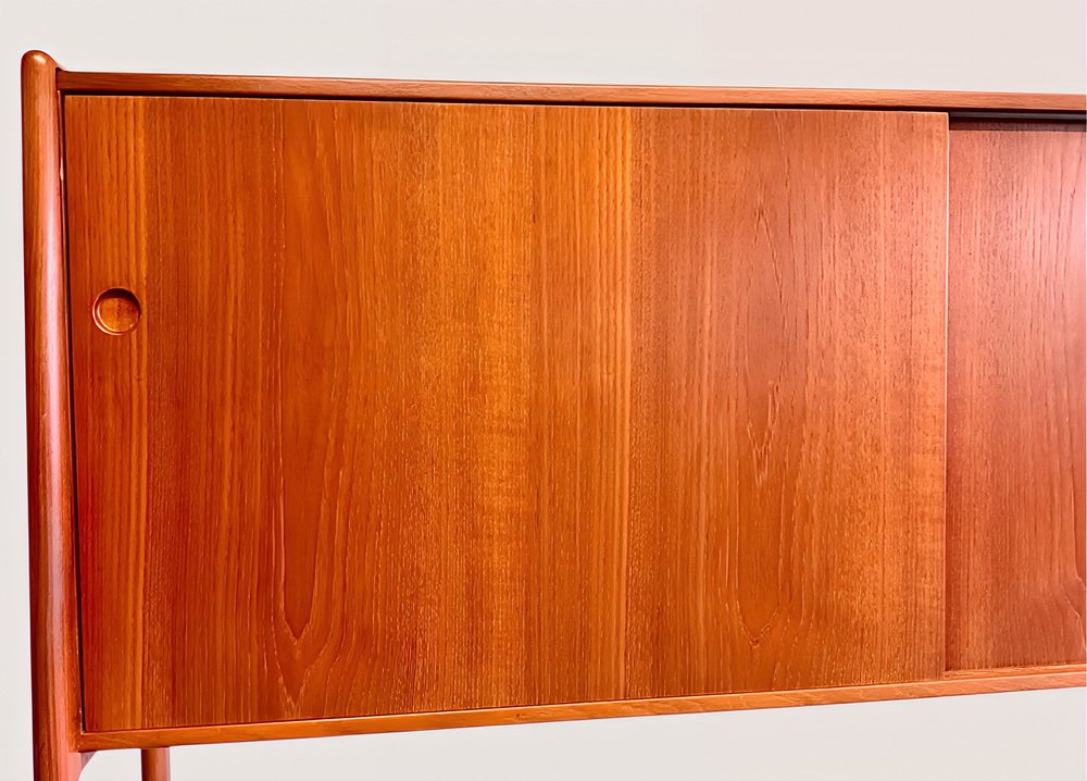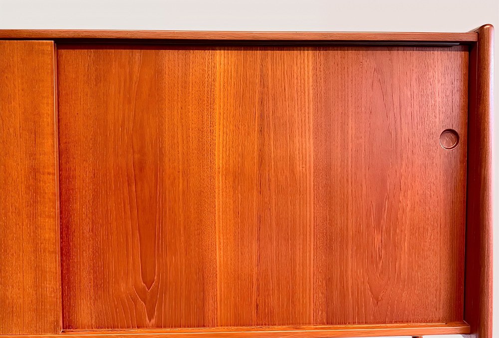 Die Kredenza / Anrichte / Highboard / Buffet / Sideboard Modell 20 von RY-MOBLER ist ein 1950er 1960er MidCentury-Juwel und ein äußerst seltener, erstklassiger, dänischer Designklassiker der Danish Mid-Century Moderne aus massivem Holz gefertigt ( Teakholz + Eiche ) und zusätzlich mit sehr schönem Teak-Echtholz-Furnier veredelt.
