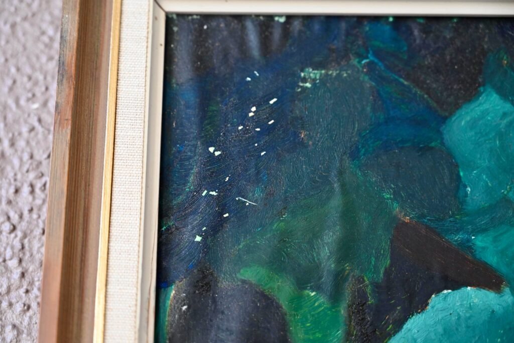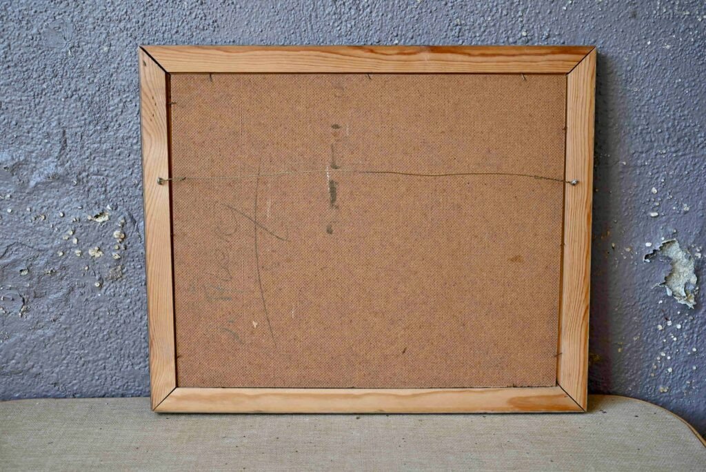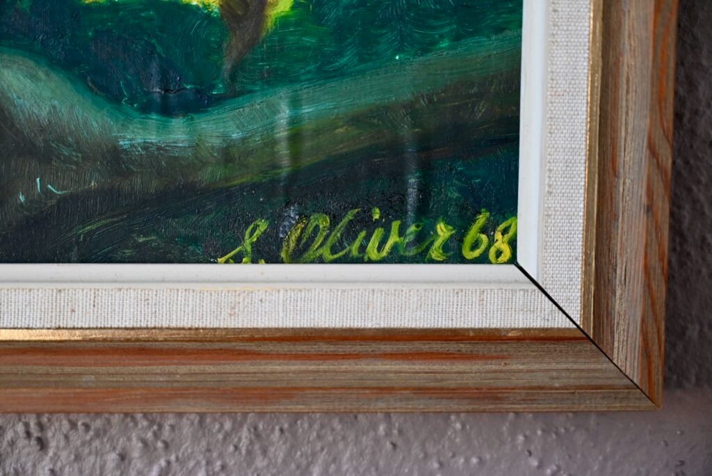Deeply colored composition, painting on canvas glued to a panel. Forest landscape, signed S. Oliver and framed. 1968, from Sweden. Beautiful antique painting, original and decorative. Traces of use, small paint losses, and warping of the canvas. Antique wooden frame.
