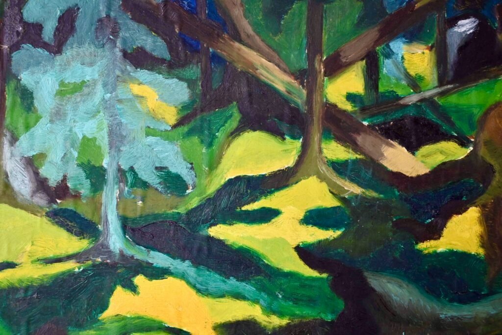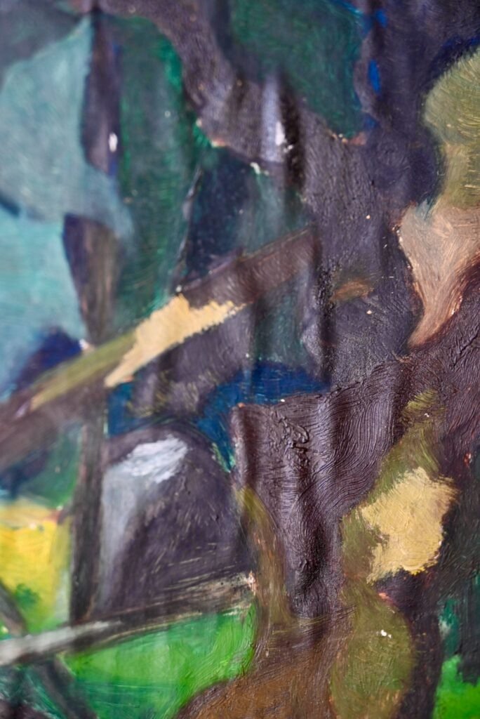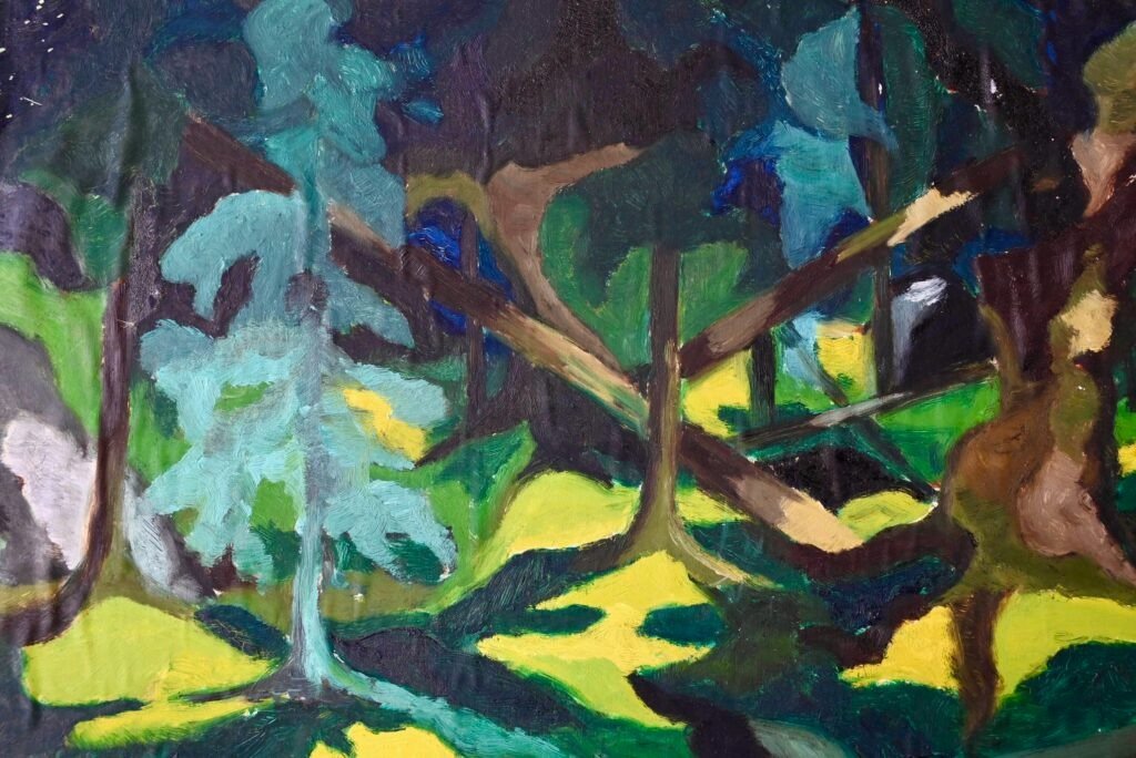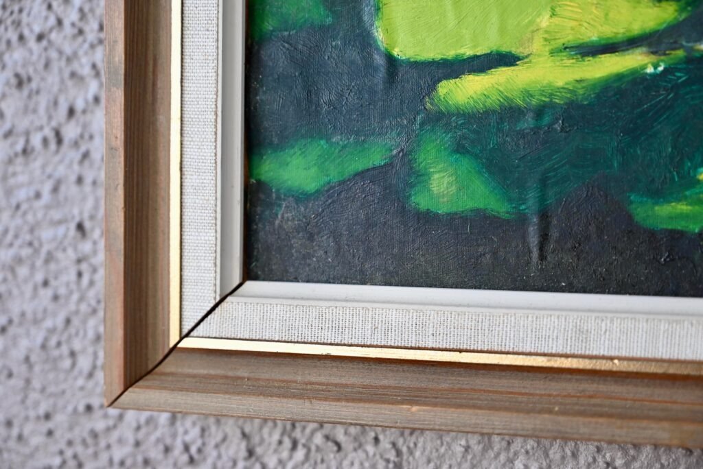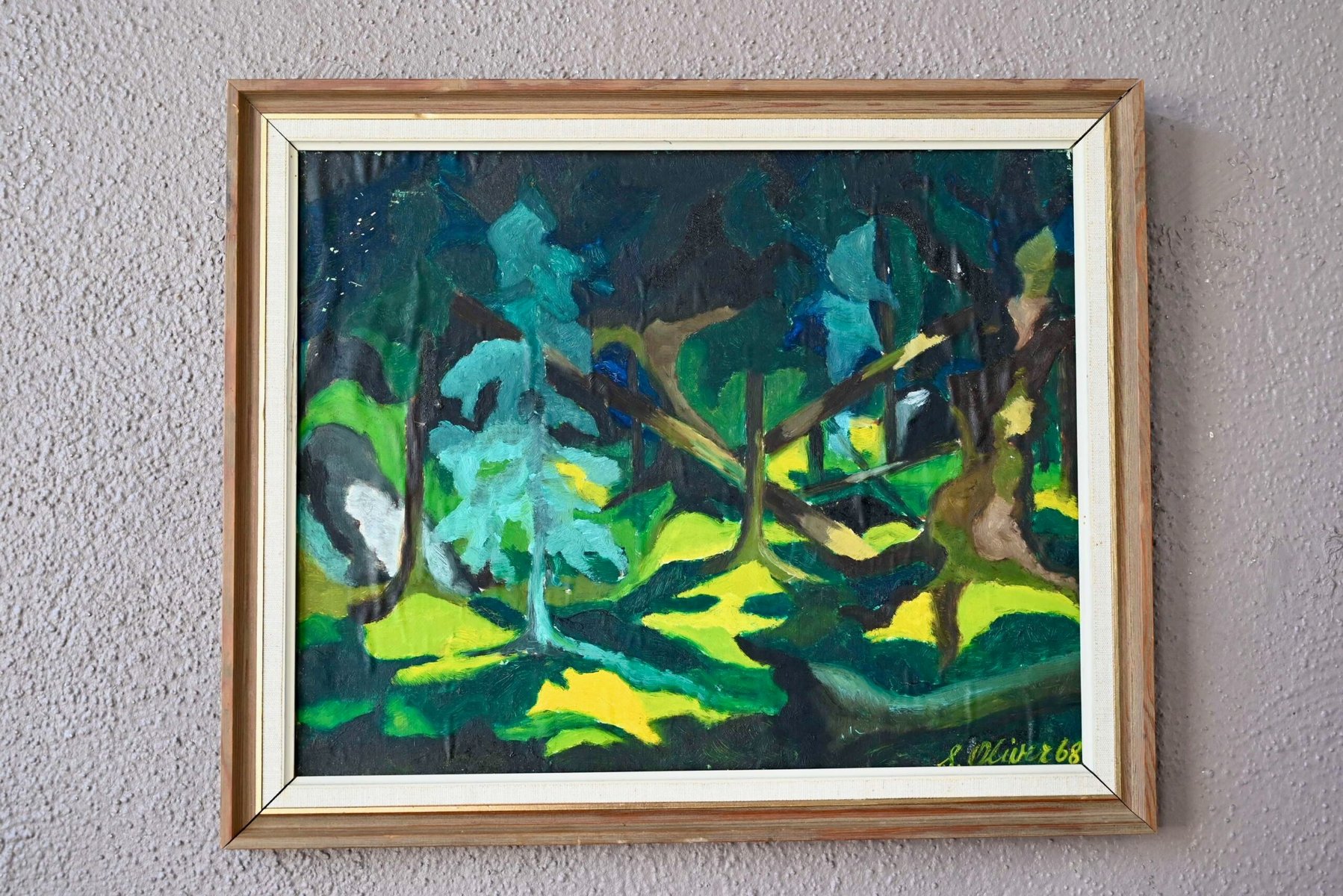 Farbintensive Komposition, Gemälde auf Leinwand, auf eine Platte geklebt. Waldlandschaft, signiert S. Oliver und gerahmt. 1968, aus Schweden. Schöne antike Malerei, original und dekorativ. Gebrauchsspuren, kleine Farbverluste und Verwerfungen auf der Leinwand. Antike Holzrahmen.