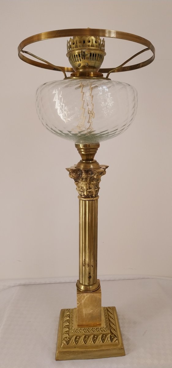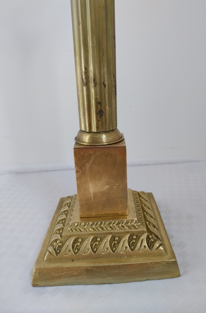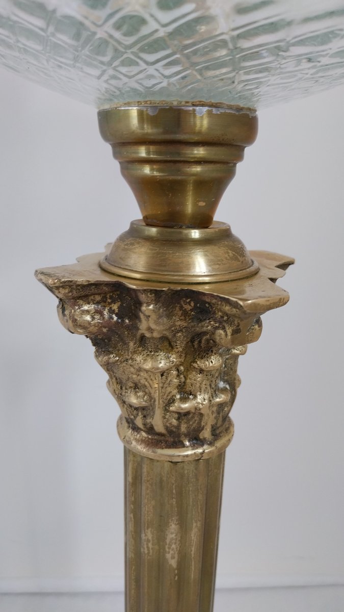 An ornate, column-like stand rises from the base of the lamp, reminiscent of the style of classical Greek or Roman columns.